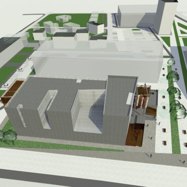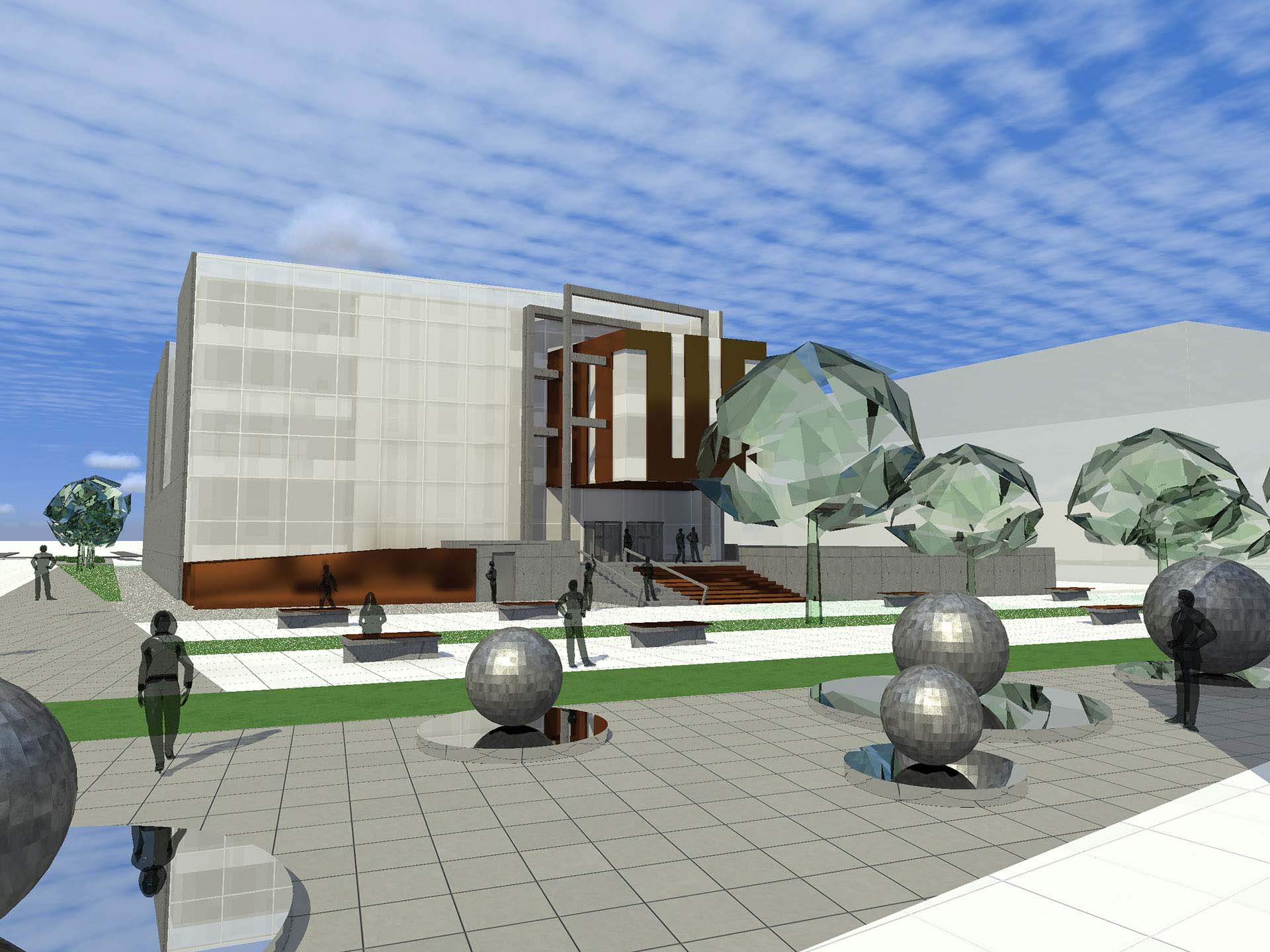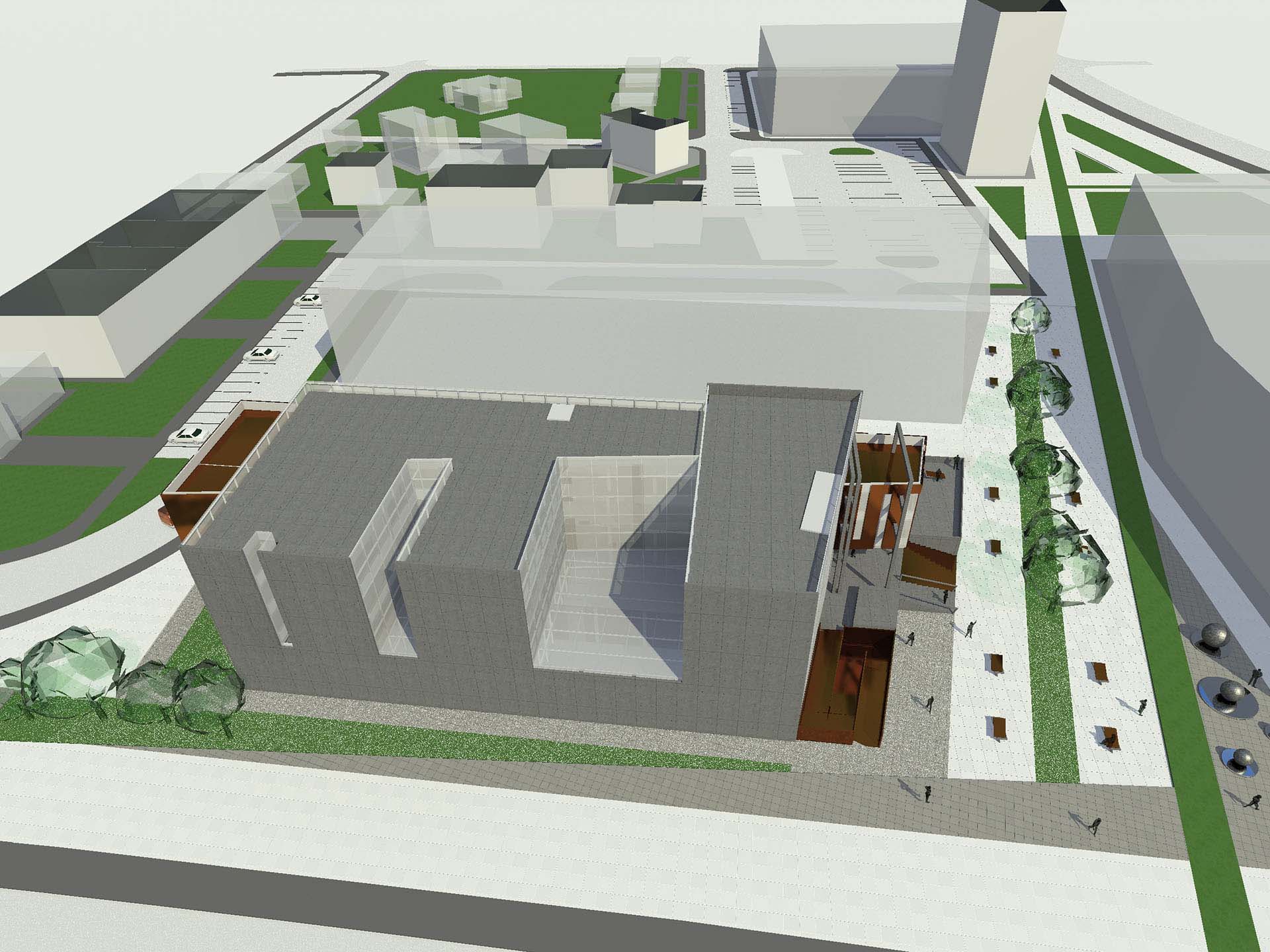 Objekat je podjeljen u tri kubusa postavljena bočno prema ulici, koja su odvojena da bi svi kubusi imali jednako osvjetljenje. Praznine unutrašnjih dvorišta nisu neiskorišteni ujedi osnovne forme već sunce postavljeno unutar zatvorene forme banke. Idejnim rješenjem su sva tri paralelopipeda osvjetljena bočno prema sjeveroistočnom i jugozapadnom suncu, a zatvorena prema jugoistočnoj strani. Kancelarije su orijentisane na sjeveroistok, a horizontalne komunikacije na jugozapad. Dvorišna fasada objekta, namjenjena za vertikalne komunikacije, koje povezuju tri odvojene zone, je osvjetljena sa sjeverozapada. Objekat je izdjeljen da bi se postiglo idealno osvjetljenje za sve potrebne funkcije kao i ono zenitalno za funkcije koje su zatvorene radi bezbjednosti prema okolini. Zadnji dio objekta koji probija upravne pravougaonike ovih kancelarija je okrenut prema dvorištu i svojom masom lebdi iznad  pozicije ulaza i trga. Glavni ulaz je naglašen u odnosu na smirenu dvorišnu fasadu. Forme koje uznemiruju prostor i suprostavljaju se uličnoj fasadi su otvorene prema trgu i klijentima. Akcenat objekta je ulazna partija i njena dijagonala iz koje izranja bakarna masa i natkriva posjetioce. Izdignuta platforma je odvojila glavni ulaz od korisnika trga i tako naglasila njegov značaj. Otvorenost objekta prema trgu i njegova atraktivnost na ovoj strani zgrade pomiruje hladnu i odvažnu prednju fasadu koja se zatvara prema prolaznicima dok se njene bocne fasade igraju sa svjetlom i njegovim zenitom. Dvorišna fasada je kontrolisana fasada. Prozorski otvori su iskošeni i primaju sjeverno svjetlo. Ovaj dio objekta lebdi iznad dvorišta i skriva ekonomske ulaze kao i ulaze novca od očiju prolaznika. Bakar se presijava na sjeverozapadnom suncu i koristi prostor ostavljen do budućeg objekta.