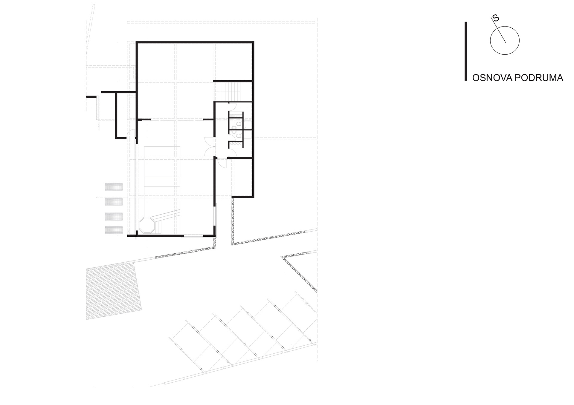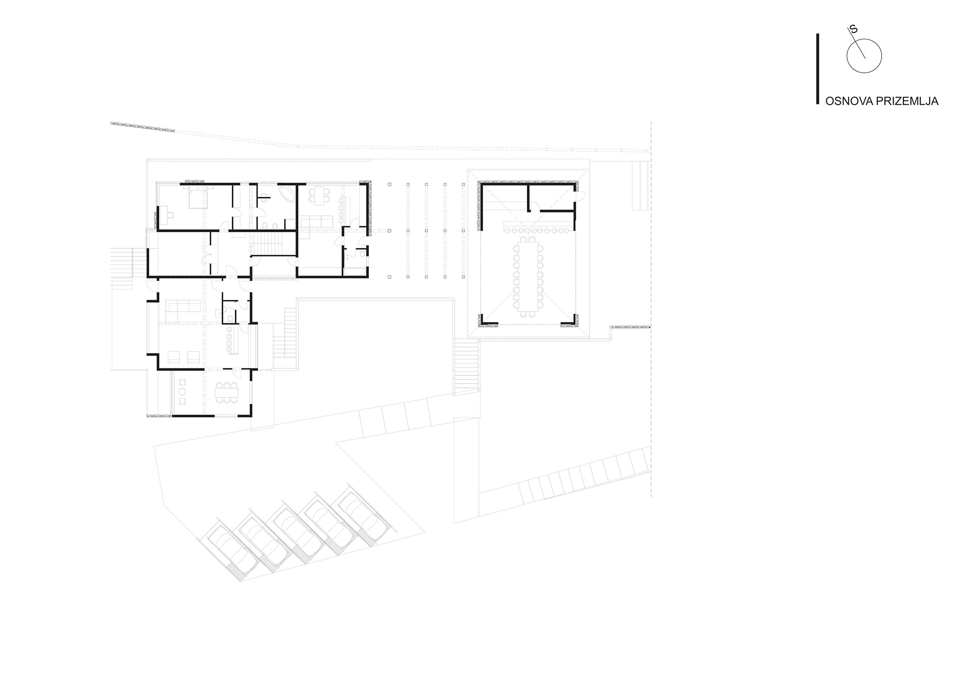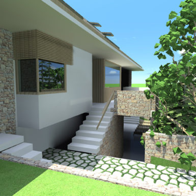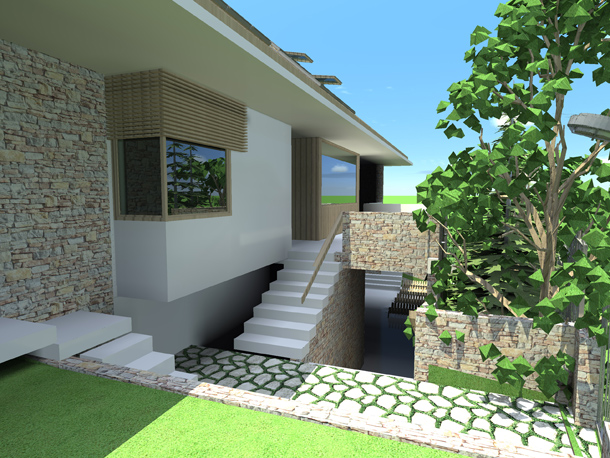 U suterenskom dijelu objekta je bazen koji jednom svojom staklenom stranom izlazi na dvorišnu terasu sa saunama i pratećim prostorima čini rekreativni dio objekta. Prizemlje koje se sastoji od dijela isključivo za boravak porodice i dijela kad u kuću dolaze gosti koji je povezan sa velikom nadstrešnicom za boravak vani kad to uslovi dozvoljavaju kao i sa zatvorenim paviljonskim dijelom za druženje pri bilo kakvim vremenskim uslovima.