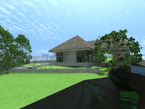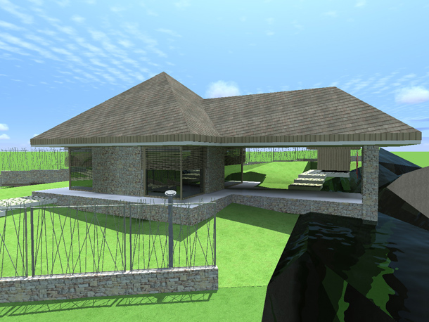 Sa svakog mjesta u kući pruža se veličanstven pogled na prirodu kroz prostorije ili kroz dvorišta. Tako se i sama kuća čini sastavnim dijelom ambijenta i na svakom koraku stiče se dojam kao da se gleda u slike pejzaža, obrubljene velikim okvirima. Livada iznad kuće sa južne strane,proteže se između objekta i paviljona te mlina i prekriva prostor bujnom, divljom vegetacijom. Samo izrezi dvorišta i terasa, te staklene plohe slobodni su i omogućavaju da u unutrašnje prostorije uđe dovoljno svjetla. Sprijeda paralelno sa padinom, nalazi se potkrovlje u obliku dugačke trake te fasadne površine na kojima se izmjenjuju staklo, tamno drvo i kamen.