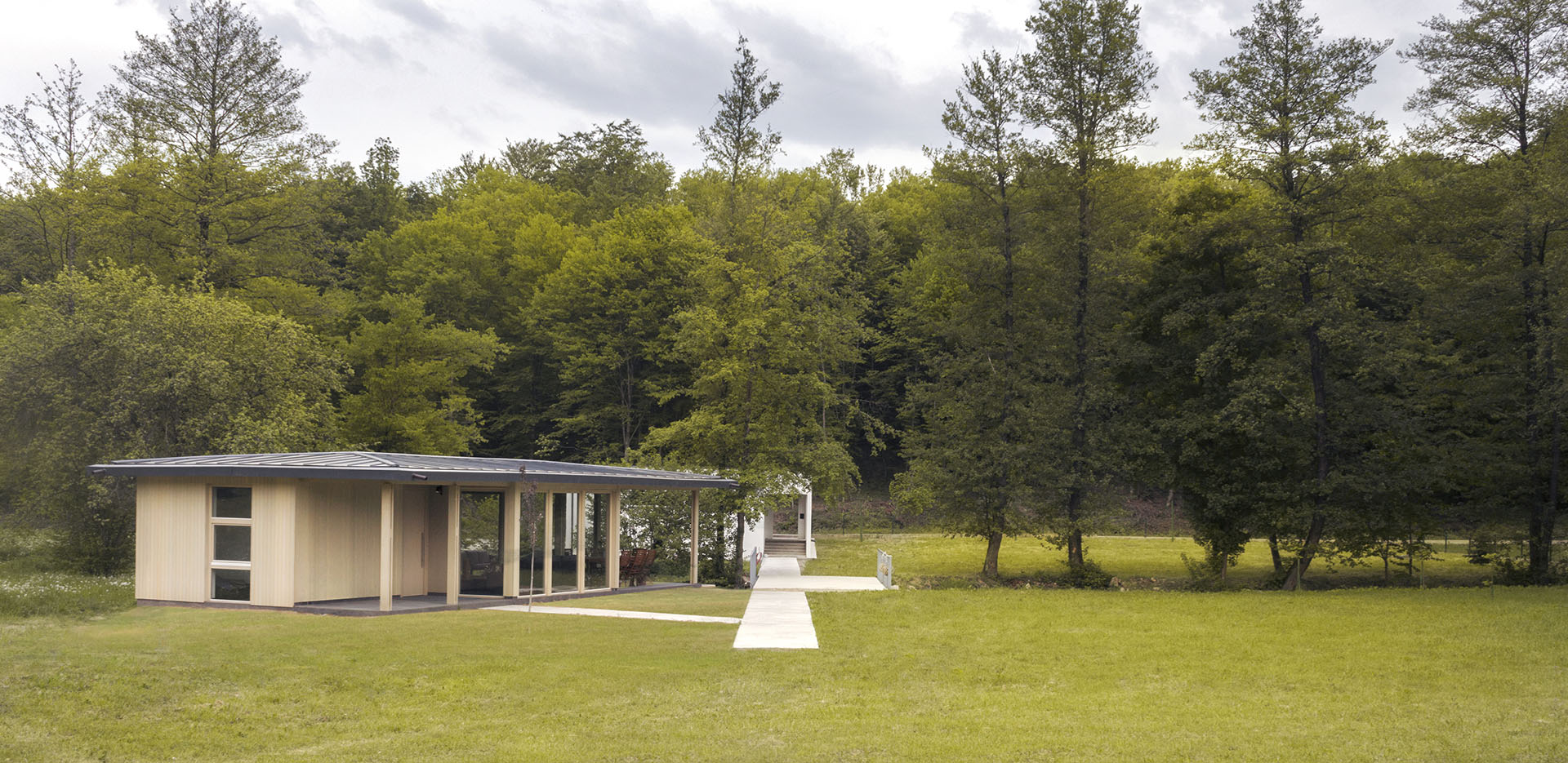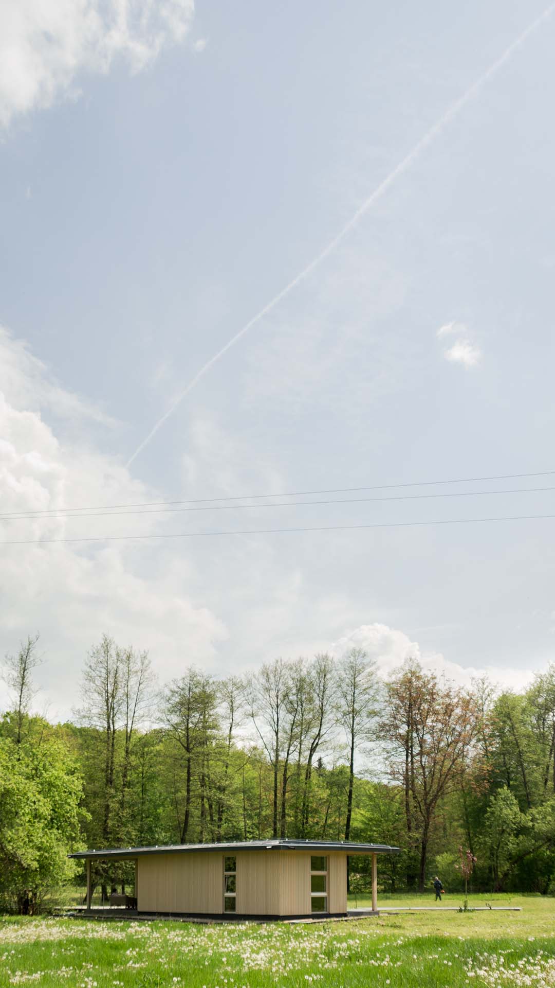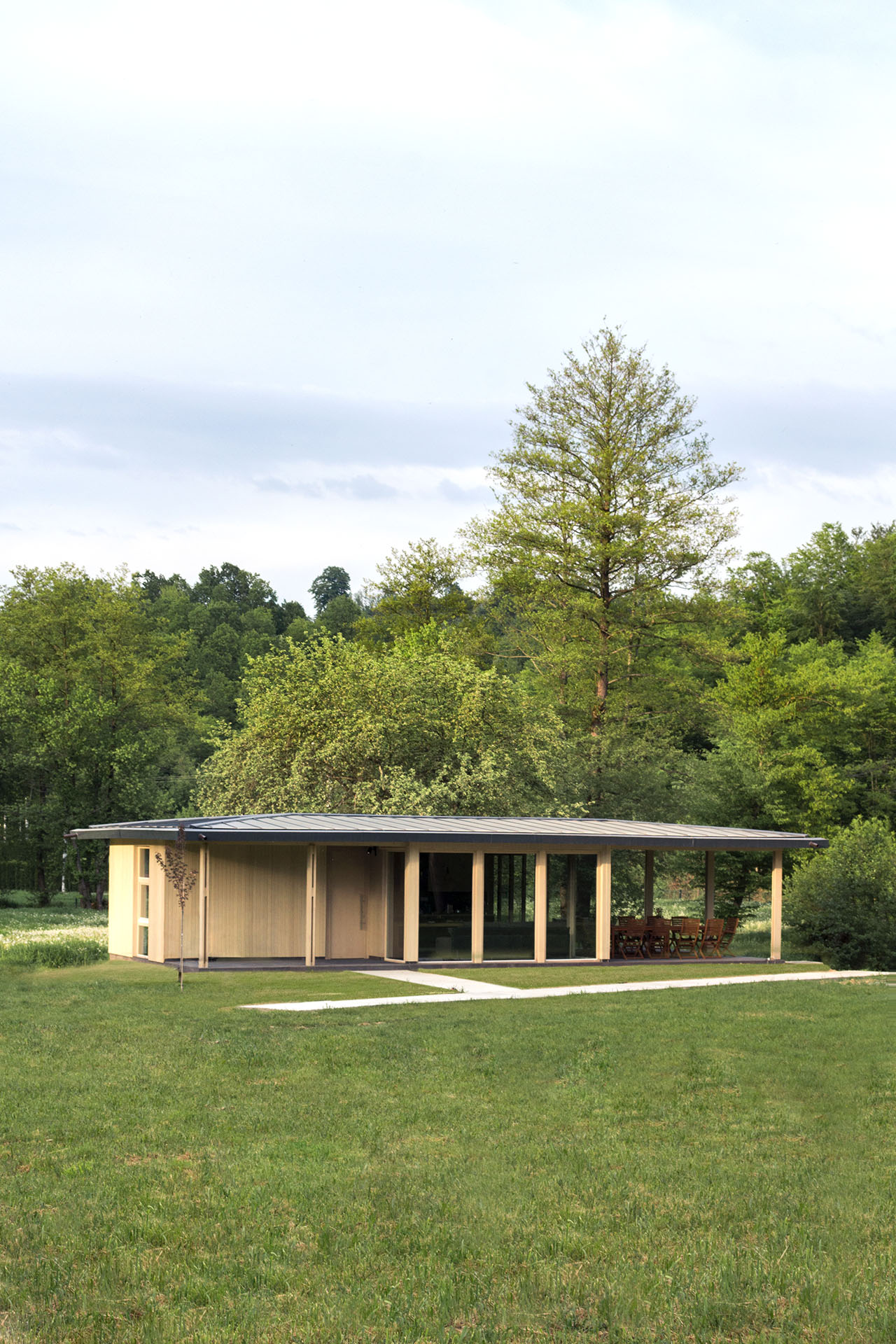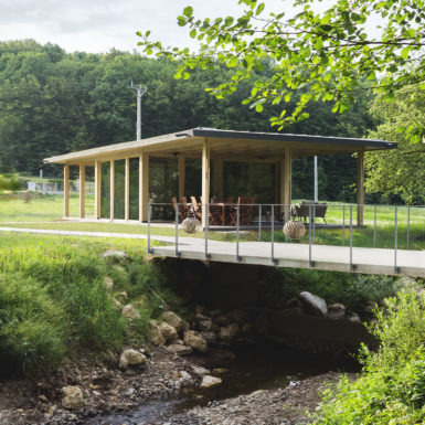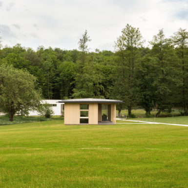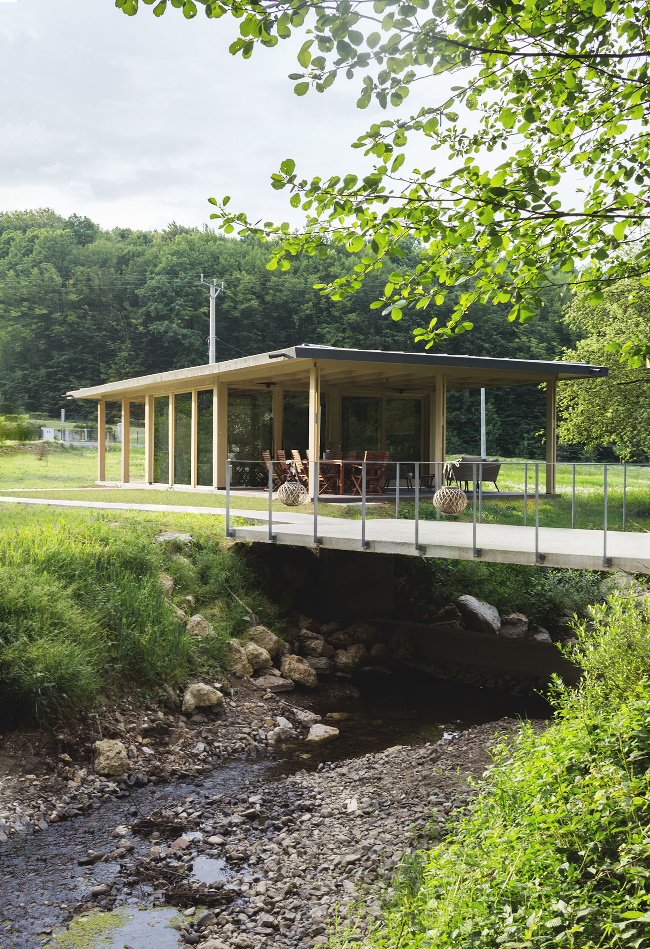 Uz samu rijeku je drveni objekat “paviljon” sa natkrivenom terasom uz samo korito i most koji ga premoštava za dodatni ugođaj u ovom raju. Ideja je da se unutrašnjost i vrt oko kuće potpuno povežu sa okolinom. Zato su svi zidovi okrenuti prirodi stakleni, dok su oni okrenuti susjedima i sjeveru skoro potpuno zatvoreni. Središnji prostor za boravak sa kuhinjom i trpezarijom je tako pozicioniran da na jednoj strani ima direktan kontakt sa terasom i potokom, na drugoj sa vrtom i južnim suncem, a na trećoj je fasada ostatka kuće povučena prema unutrašnjosti da omogući kontakt sa večernjim svjetlom na zapadu. Struktura, staklo, drvo i vidljiva betonska ploča na kojoj leži kuća, tako su ukomponovani da prostori u njoj nemaju “demarkacionu” liniju. Dnevni boravak, kuhinja, prostor za spavanje i rad formiraju prostorni kontinuum zbog čerga spoljašnost i unutrašnjost nemaju granicu između sebe, arhitektura i priroda su jedno. Objekat se sastoji od samo jednog prostora povezanog sa okolinom.
