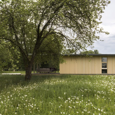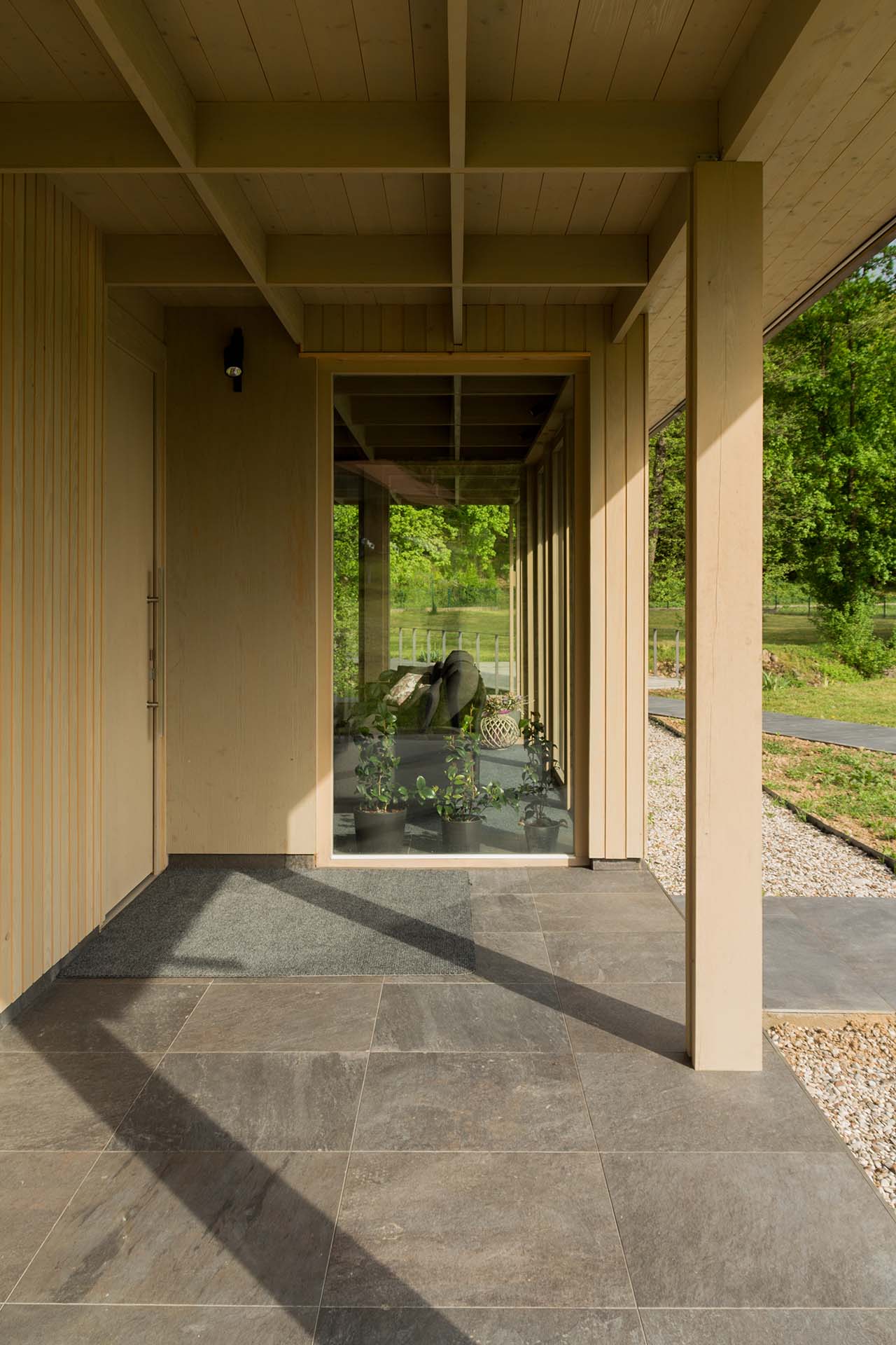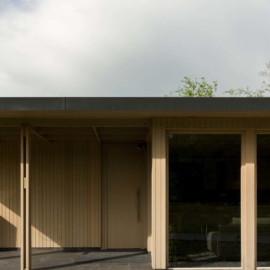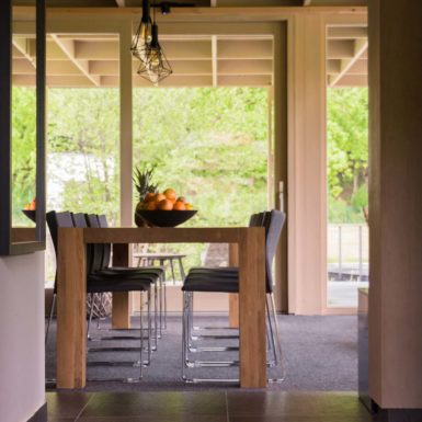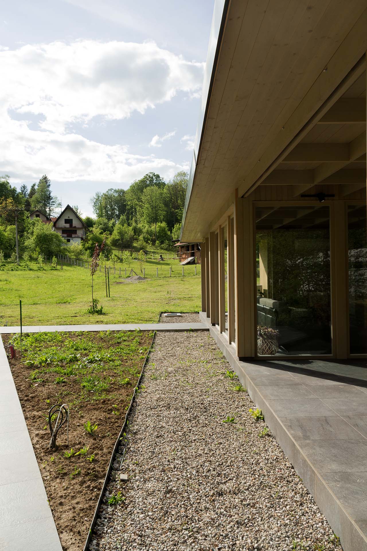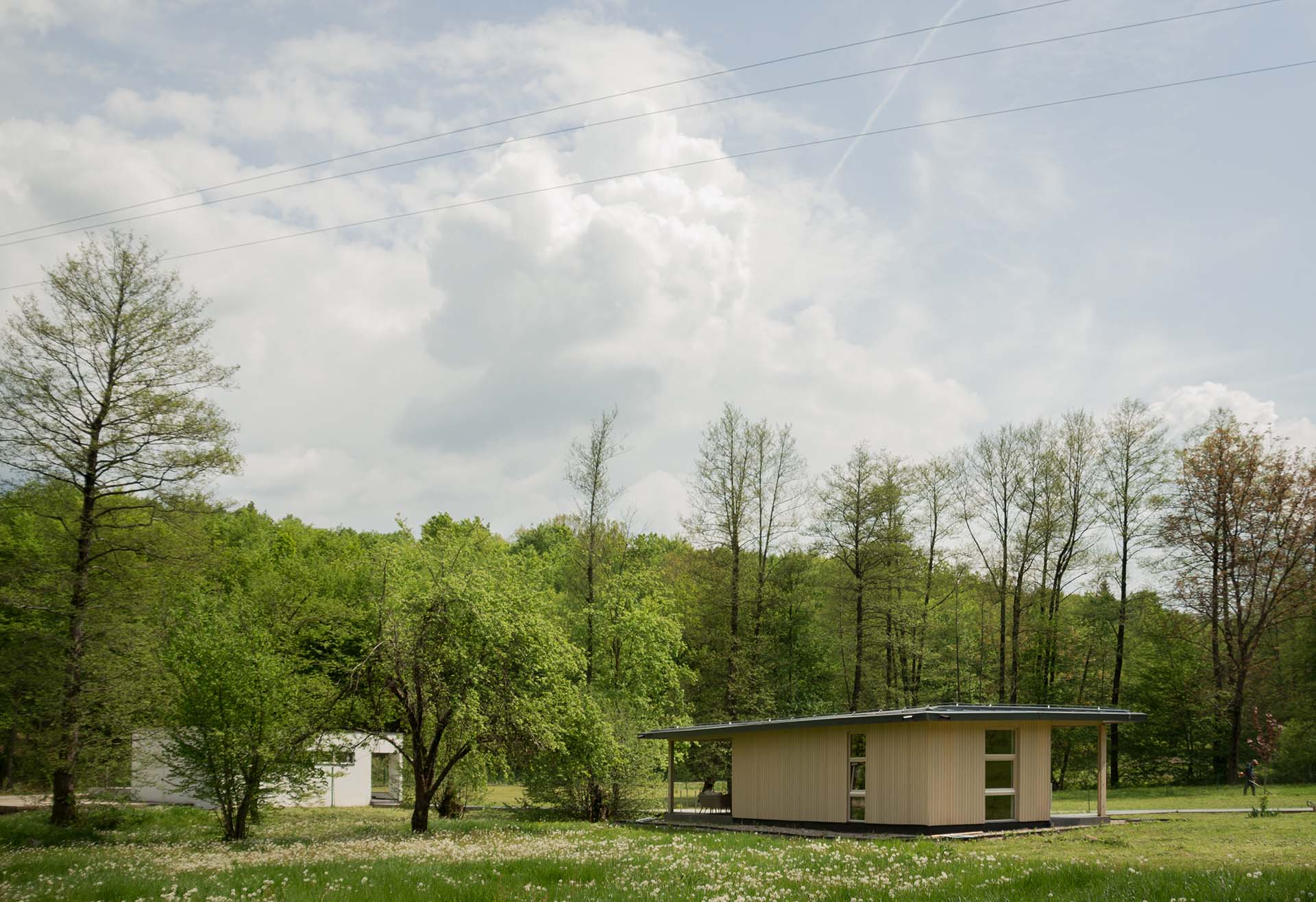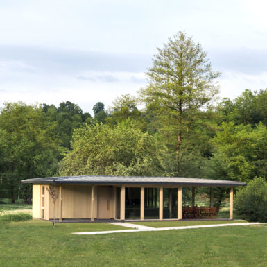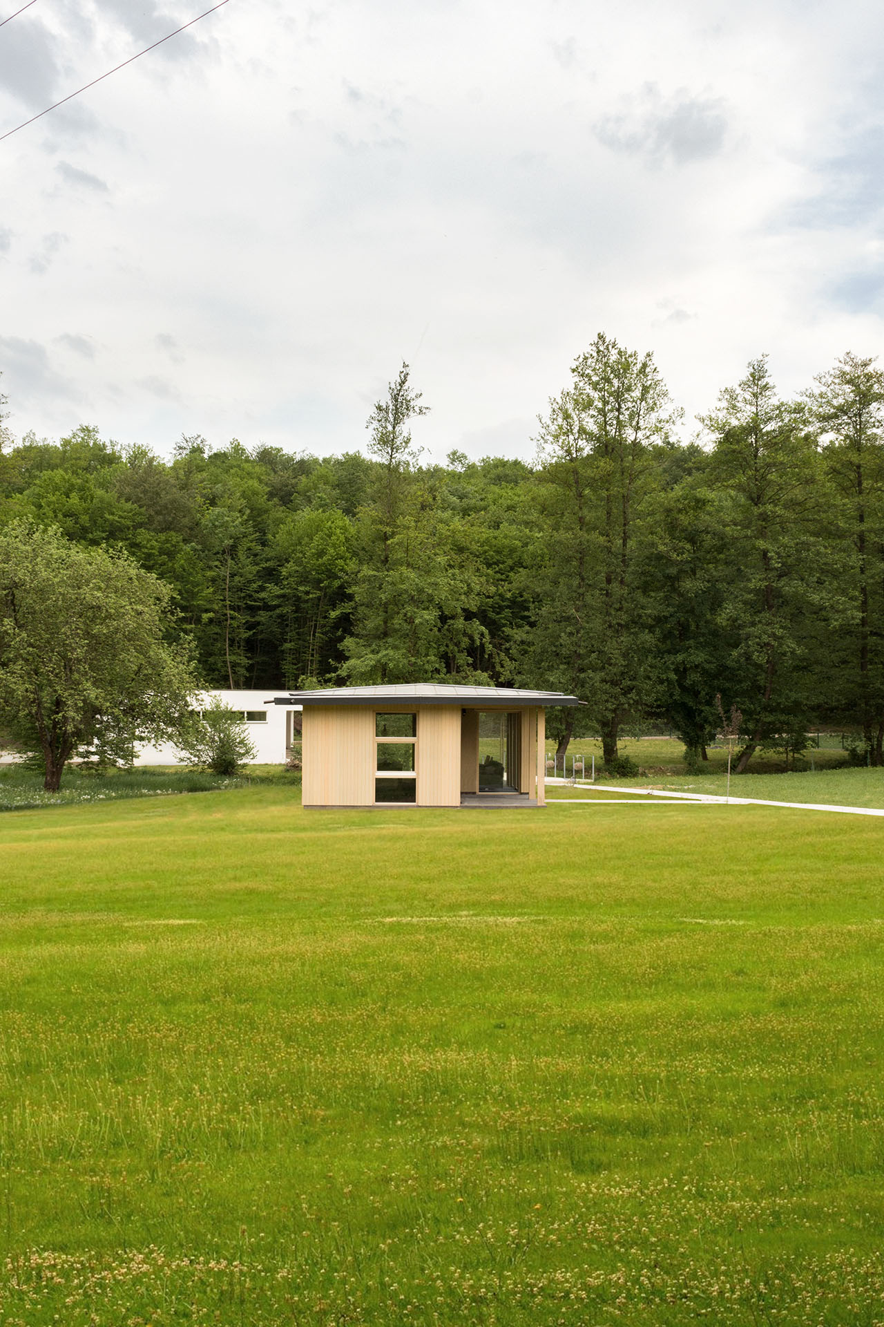 Uz samu rijeku je drveni objekat “paviljon” sa natkrivenom terasom uz samo korito i most koji ga premoštava za dodatni ugođaj u ovom raju. Ideja je da se unutrašnjost i vrt oko kuće potpuno povežu sa okolinom. Zato su svi zidovi okrenuti prirodi stakleni, dok su oni okrenuti susjedima i sjeveru skoro potpuno zatvoreni. Središnji prostor za boravak sa kuhinjom i trpezarijom je tako pozicioniran da na jednoj strani ima direktan kontakt sa terasom i potokom, na drugoj sa vrtom i južnim suncem, a na trećoj je fasada ostatka kuće povučena prema unutrašnjosti da omogući kontakt sa večernjim svjetlom na zapadu. Struktura, staklo, drvo i vidljiva betonska ploča na kojoj leži kuća, tako su ukomponovani da prostori u njoj nemaju “demarkacionu” liniju. Dnevni boravak, kuhinja, prostor za spavanje i rad formiraju prostorni kontinuum zbog čerga spoljašnost i unutrašnjost nemaju granicu između sebe, arhitektura i priroda su jedno. Objekat se sastoji od samo jednog prostora povezanog sa okolinom.
