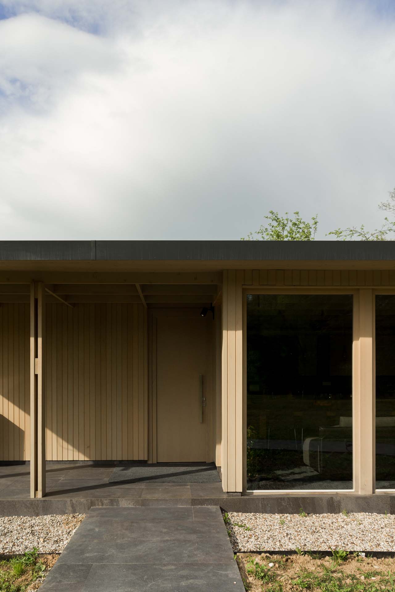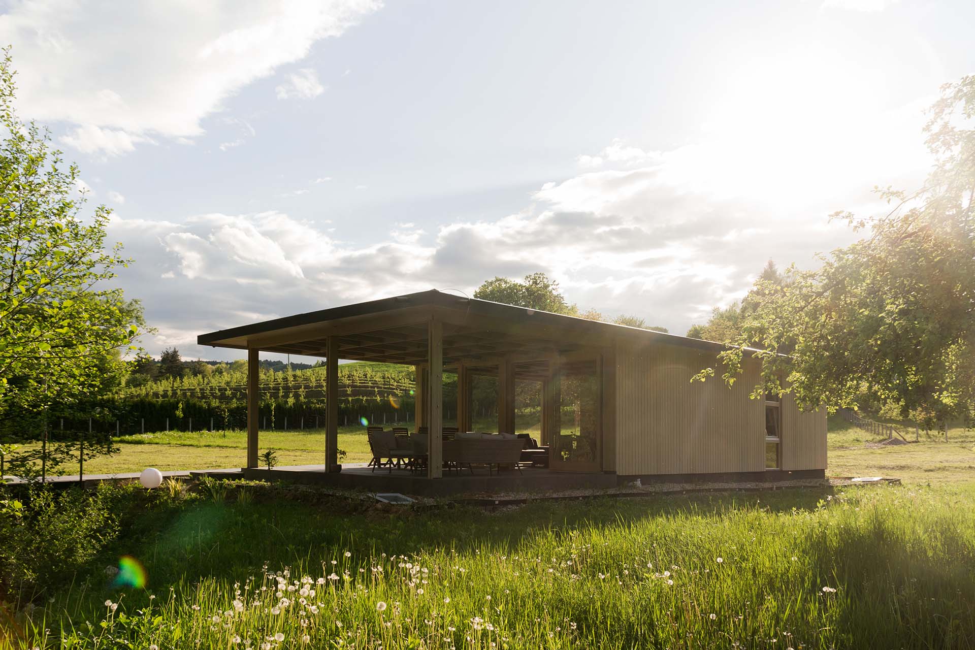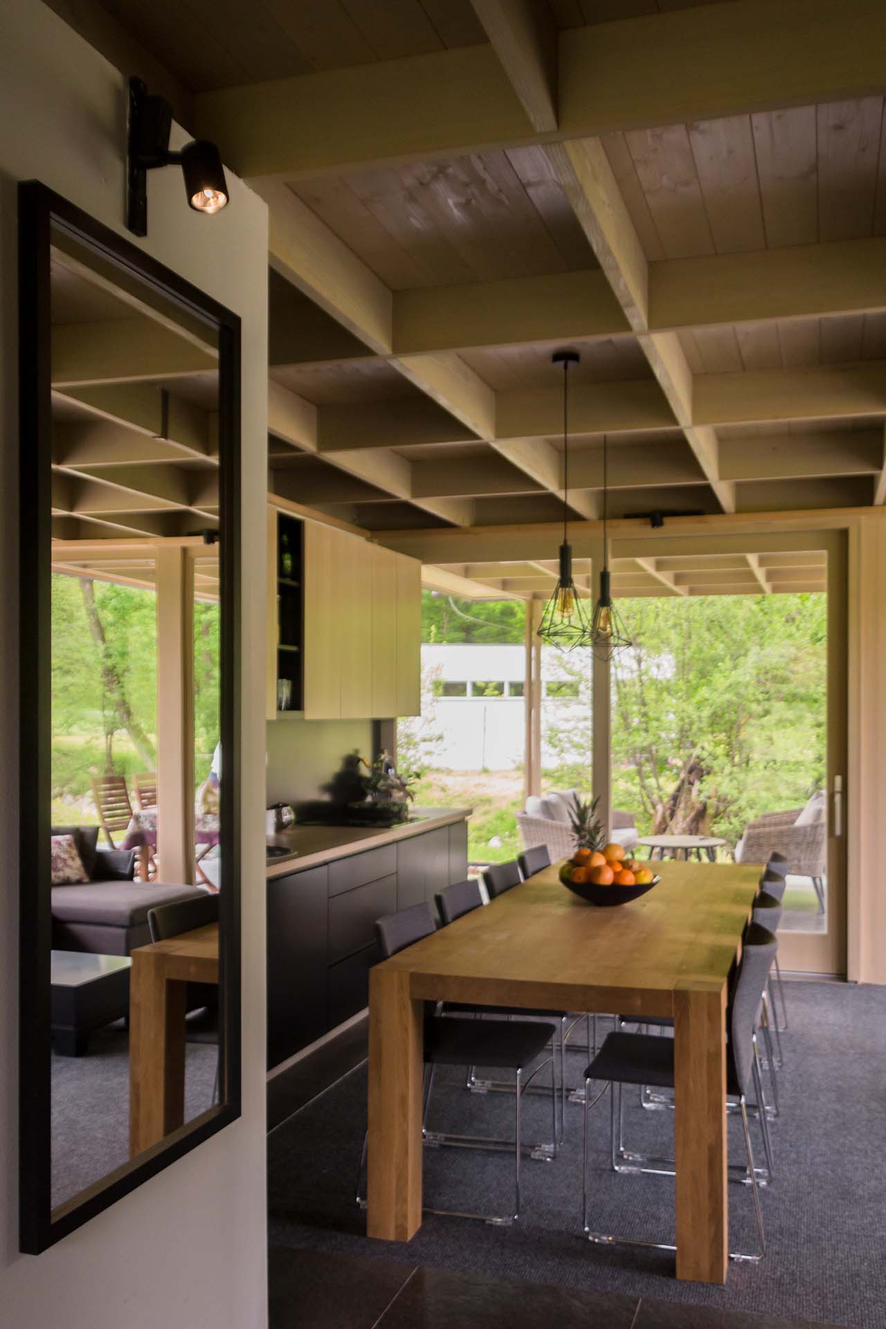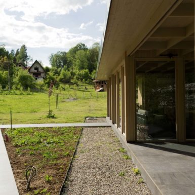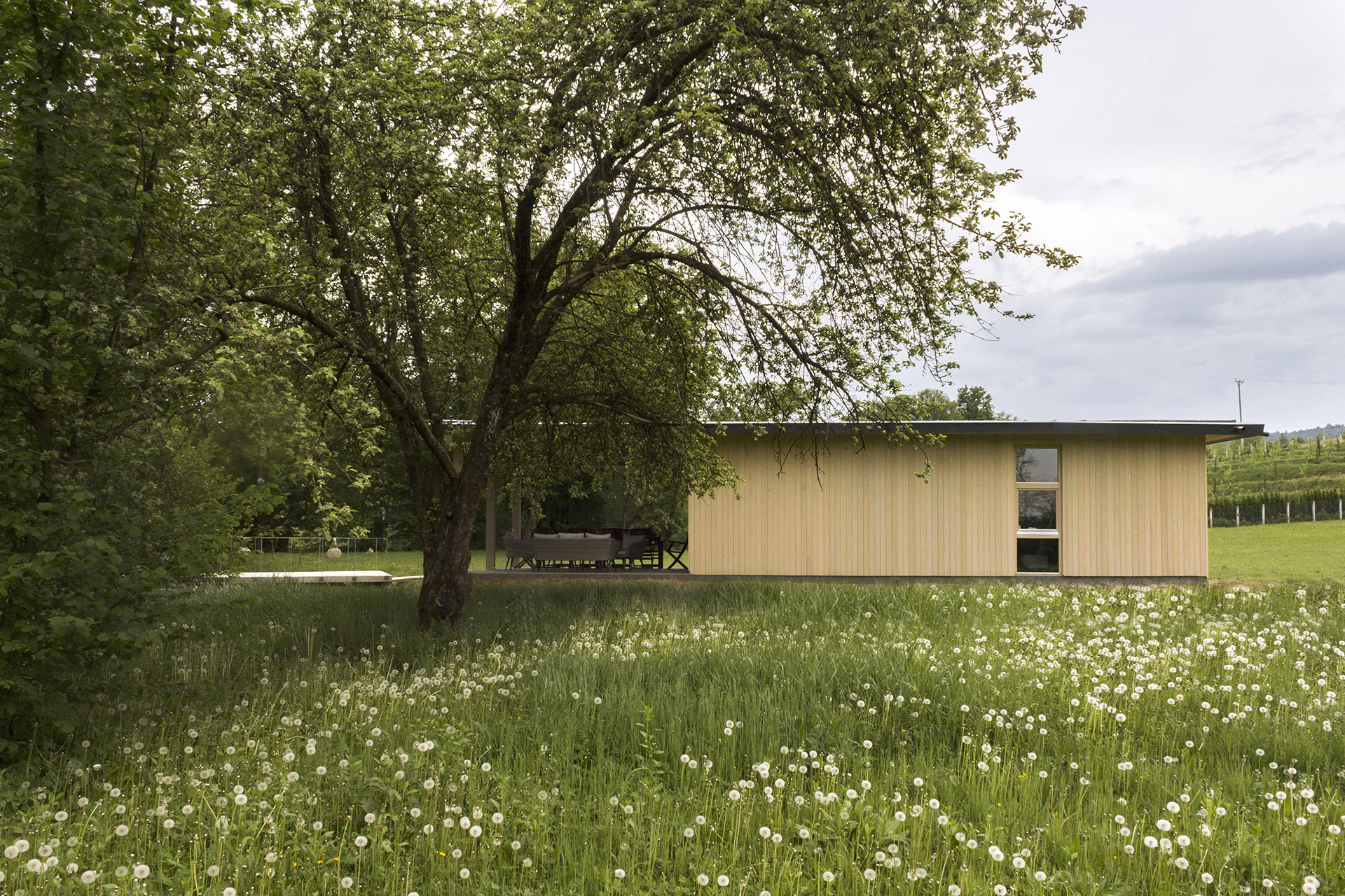 Uz samu rijeku je drveni objekat “paviljon” sa natkrivenom terasom uz samo korito i most koji ga premoštava za dodatni ugođaj u ovom raju. Ideja je da se unutrašnjost i vrt oko kuće potpuno povežu sa okolinom. Zato su svi zidovi okrenuti prirodi stakleni, dok su oni okrenuti susjedima i sjeveru skoro potpuno zatvoreni. Središnji prostor za boravak sa kuhinjom i trpezarijom je tako pozicioniran da na jednoj strani ima direktan kontakt sa terasom i potokom, na drugoj sa vrtom i južnim suncem, a na trećoj je fasada ostatka kuće povučena prema unutrašnjosti da omogući kontakt sa večernjim svjetlom na zapadu. Struktura, staklo, drvo i vidljiva betonska ploča na kojoj leži kuća, tako su ukomponovani da prostori u njoj nemaju “demarkacionu” liniju. Dnevni boravak, kuhinja, prostor za spavanje i rad formiraju prostorni kontinuum zbog čerga spoljašnost i unutrašnjost nemaju granicu između sebe, arhitektura i priroda su jedno. Objekat se sastoji od samo jednog prostora povezanog sa okolinom.