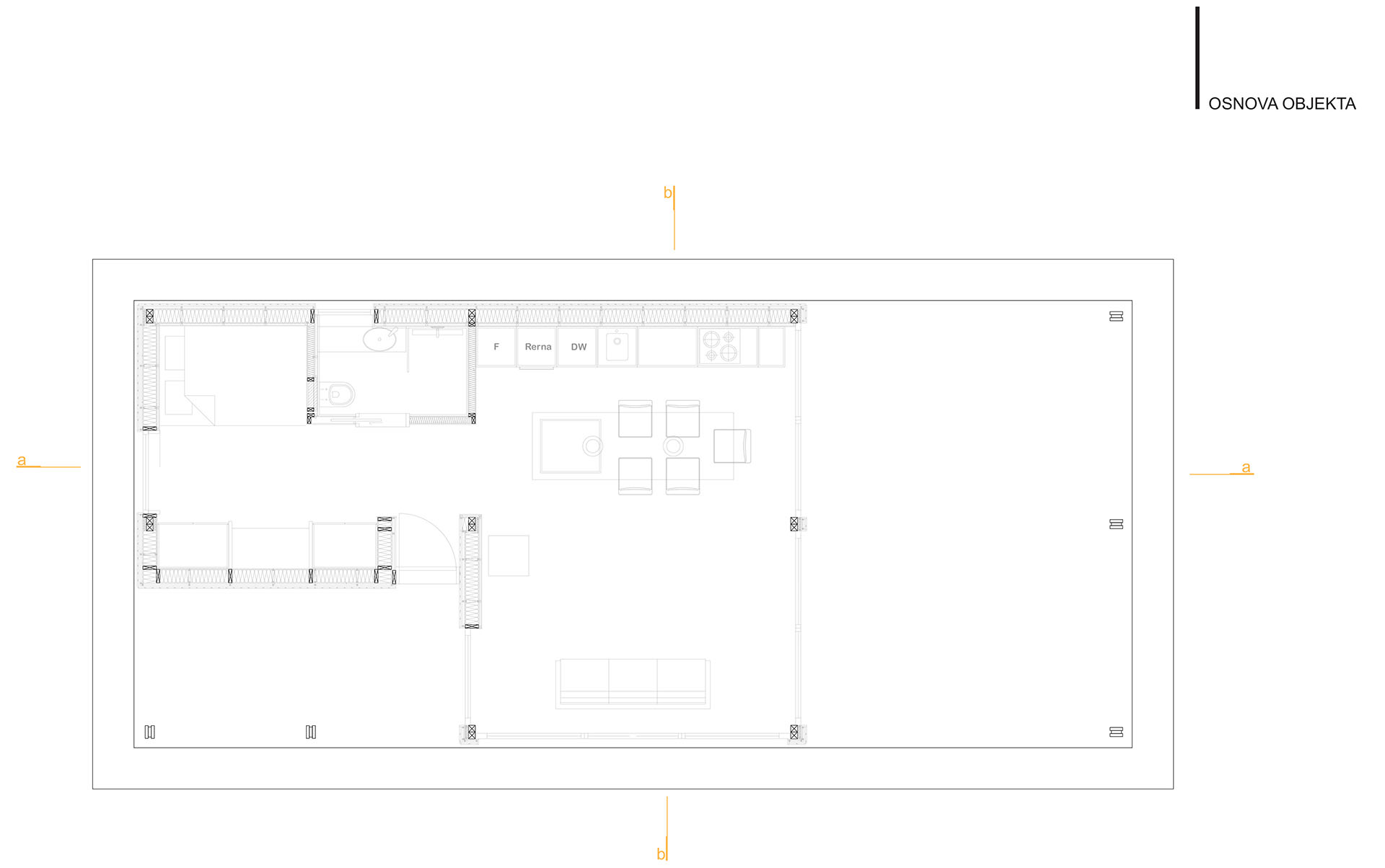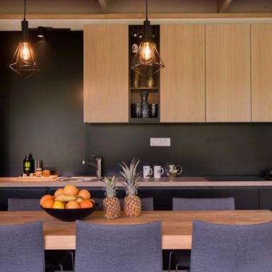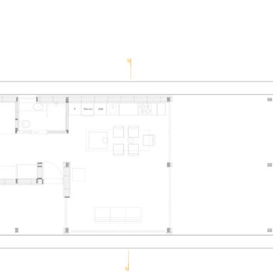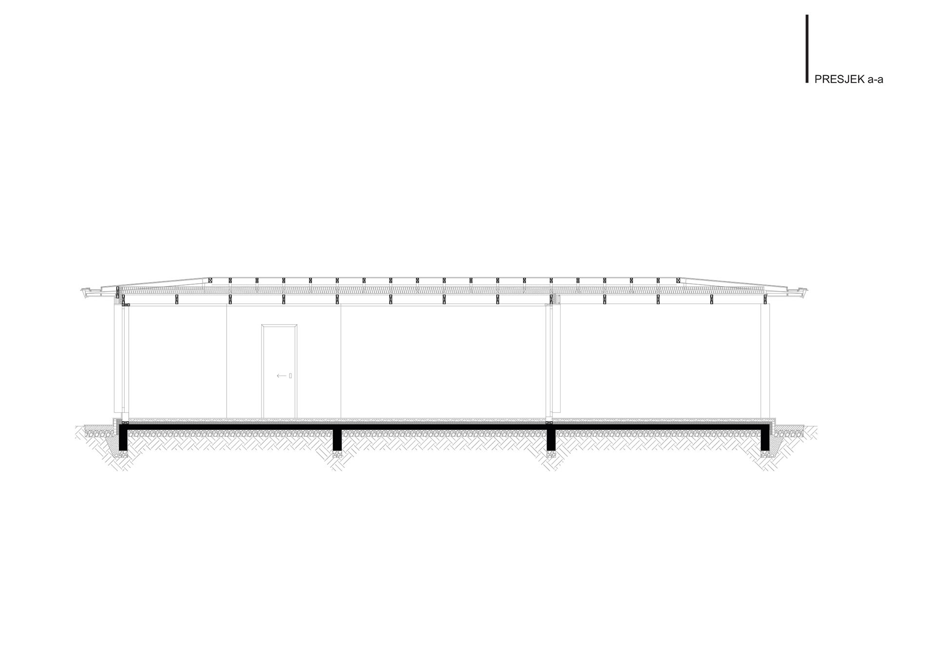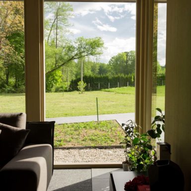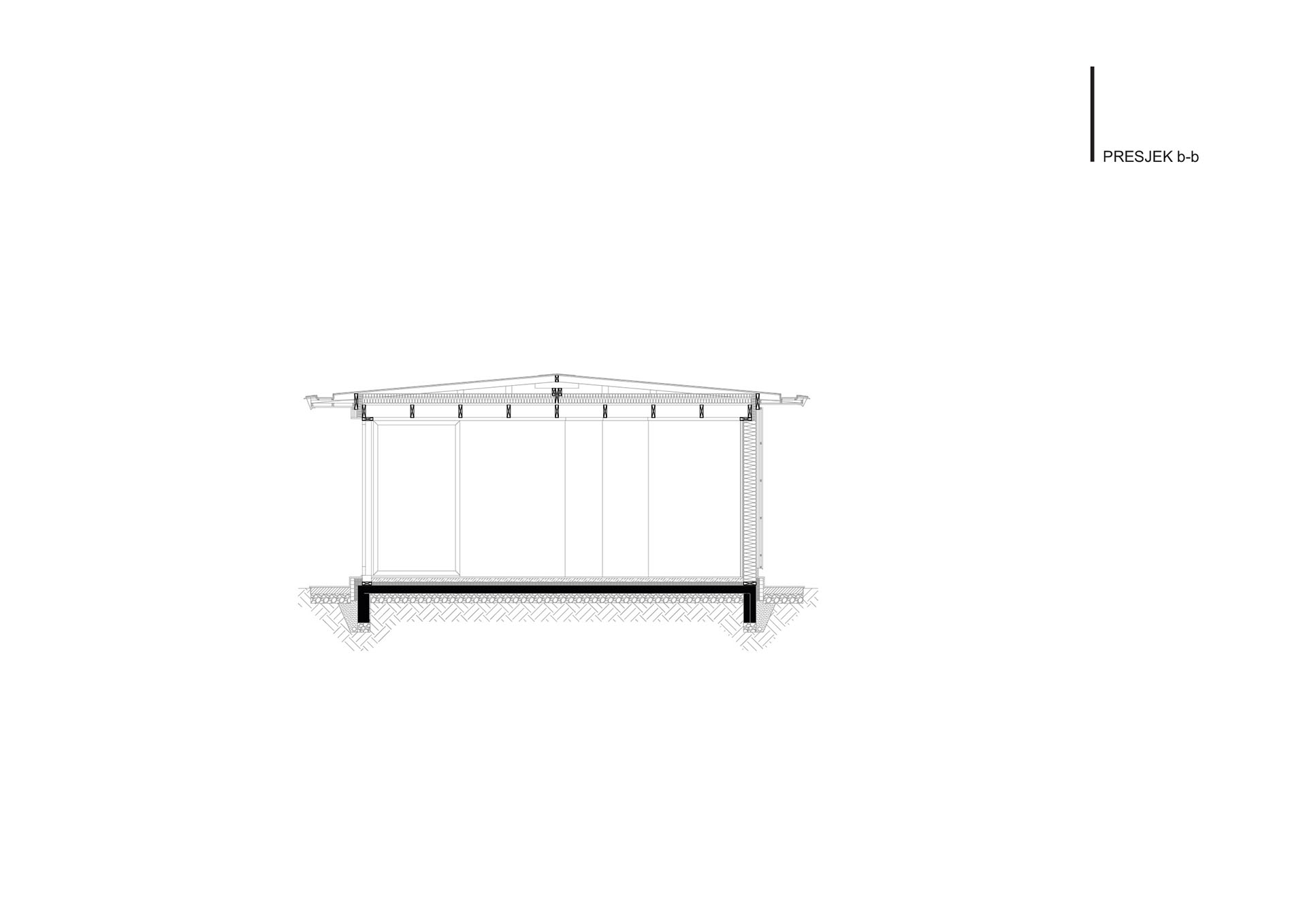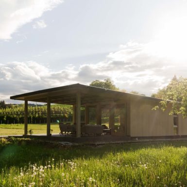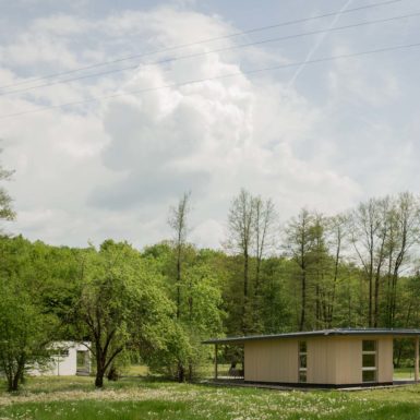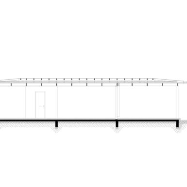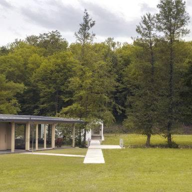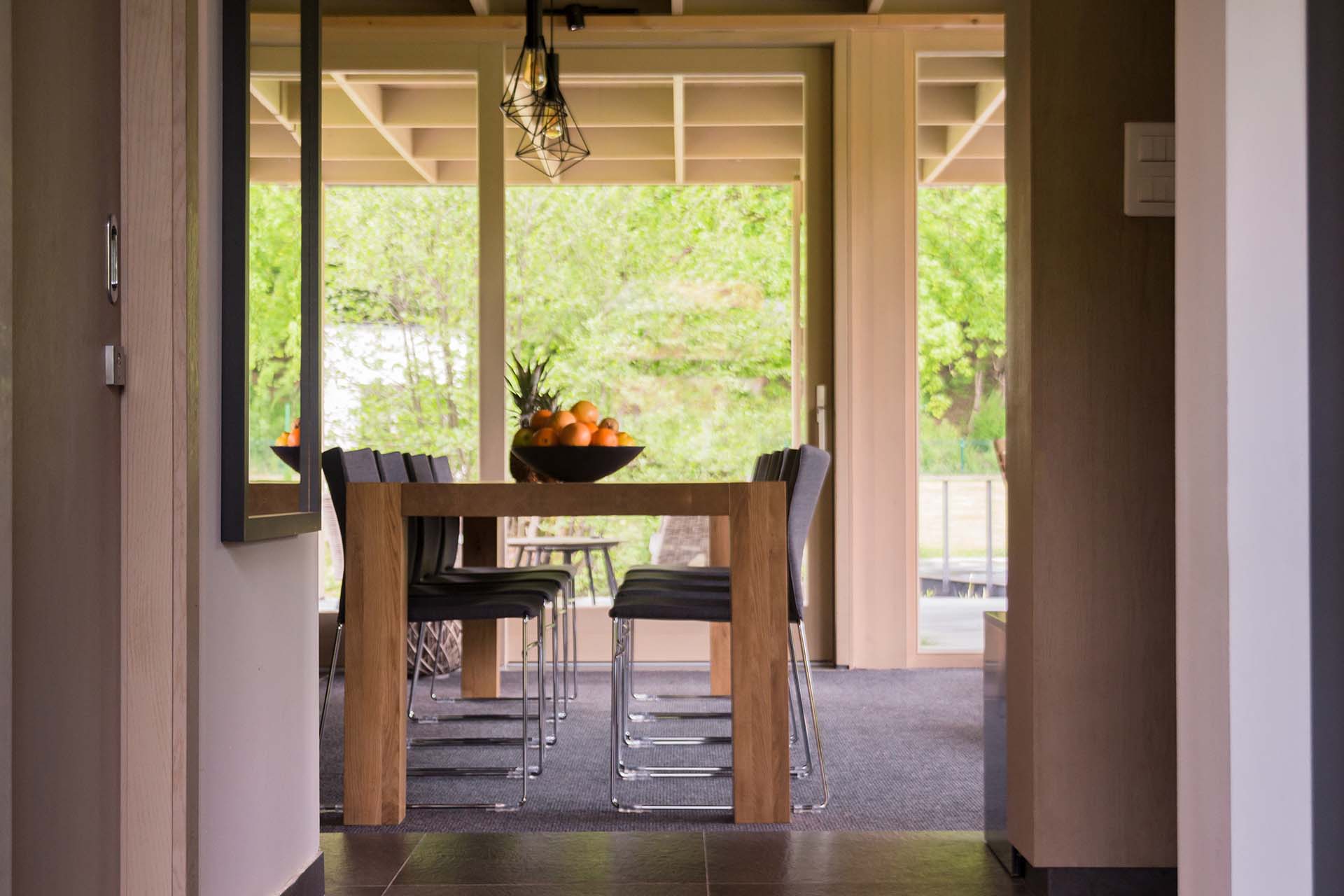 Uz samu rijeku je drveni objekat “paviljon” sa natkrivenom terasom uz samo korito i most koji ga premoštava za dodatni ugođaj u ovom raju. Ideja je da se unutrašnjost i vrt oko kuće potpuno povežu sa okolinom. Zato su svi zidovi okrenuti prirodi stakleni, dok su oni okrenuti susjedima i sjeveru skoro potpuno zatvoreni. Središnji prostor za boravak sa kuhinjom i trpezarijom je tako pozicioniran da na jednoj strani ima direktan kontakt sa terasom i potokom, na drugoj sa vrtom i južnim suncem, a na trećoj je fasada ostatka kuće povučena prema unutrašnjosti da omogući kontakt sa večernjim svjetlom na zapadu. Struktura, staklo, drvo i vidljiva betonska ploča na kojoj leži kuća, tako su ukomponovani da prostori u njoj nemaju “demarkacionu” liniju. Dnevni boravak, kuhinja, prostor za spavanje i rad formiraju prostorni kontinuum zbog čerga spoljašnost i unutrašnjost nemaju granicu između sebe, arhitektura i priroda su jedno. Objekat se sastoji od samo jednog prostora povezanog sa okolinom.