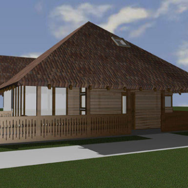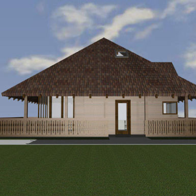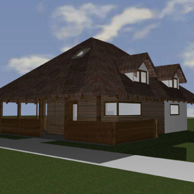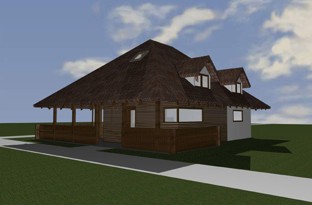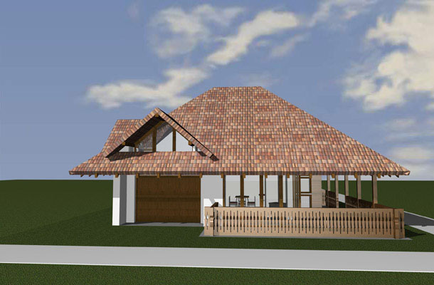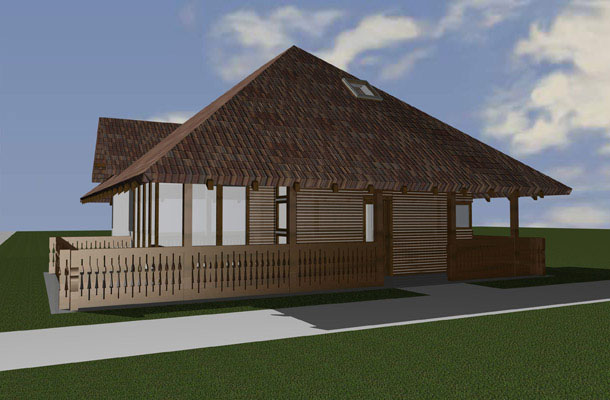 Duboka nadstrešnica krova štiti da snijeg ne zavejava na ulaz zimi, a ljeti je prostor za druženje koji se spaja sa dnevnim boravkom, kuhinjom i trpezarijom u prizemlju. A u potkrovlju ispod samog vrha krova su smještene sobe za spavanje sa krovnim prozorima opet po uzoru na lokalnu tradiciju.