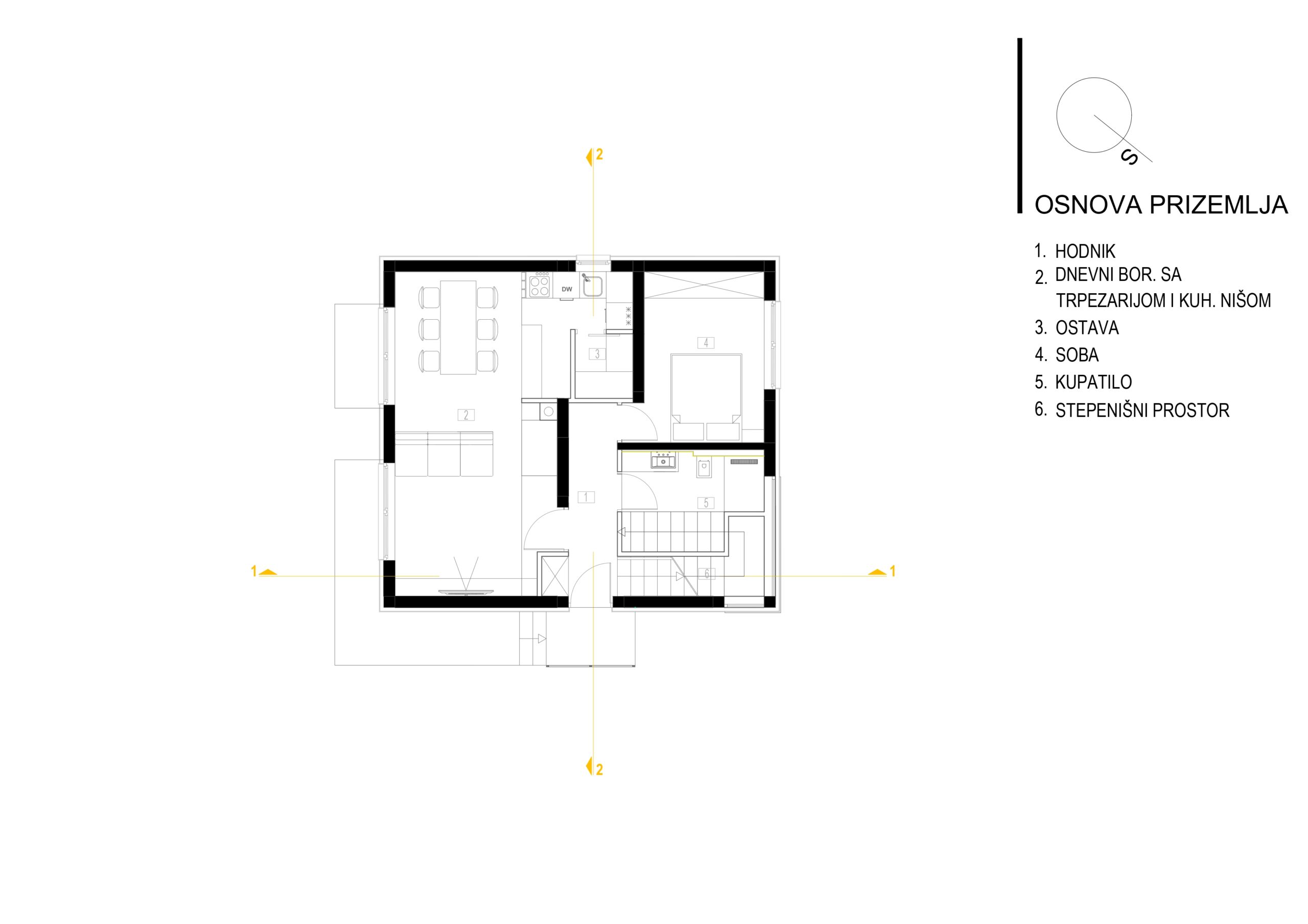 Prizemlje: Izdignuto je iznad nivoa terena za cca. 45 cm. Prostor je dnevni prostor za porodično stanovanje, sa poratećim sanitarnim prostorima i sa jednom sobom. Ukupna korisna površina prizemlja je 54.18 m2.