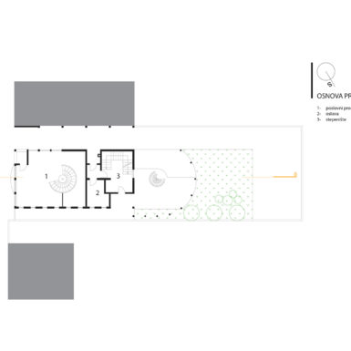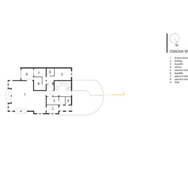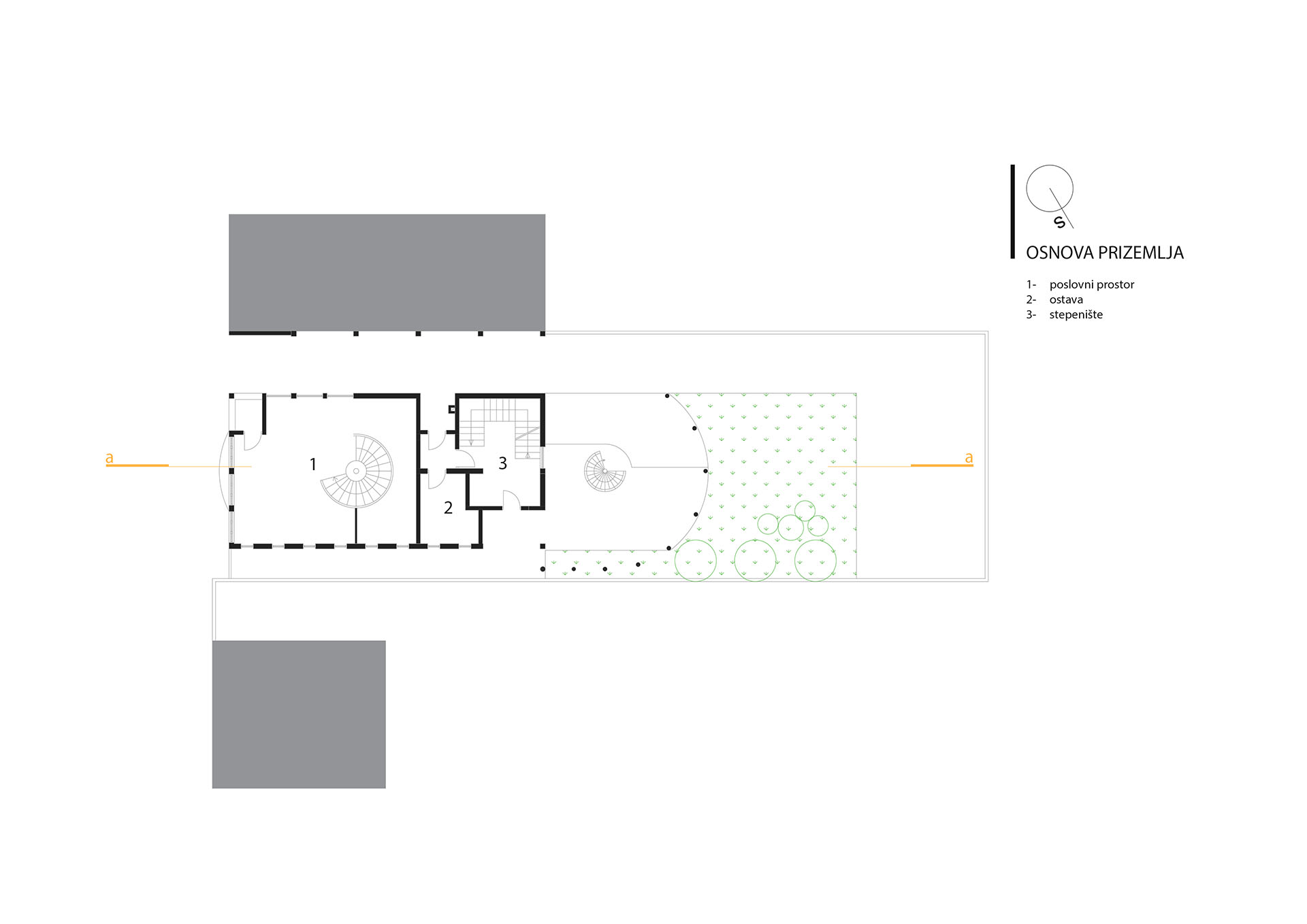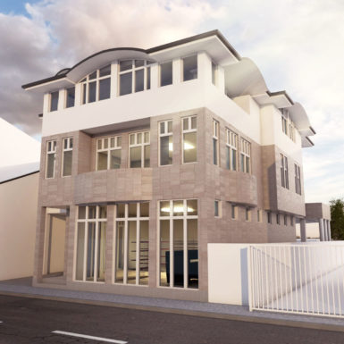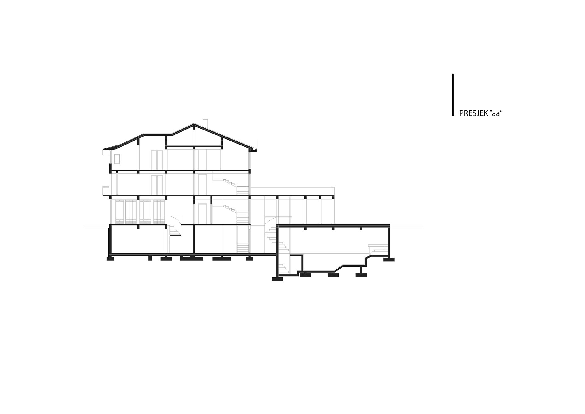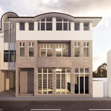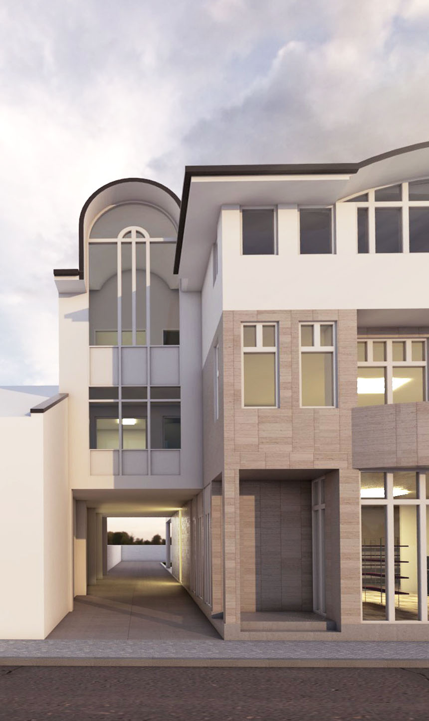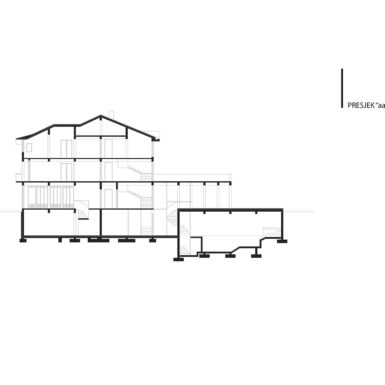 U najužem dijelu grada na parceli od 403m2 projektovan je objekat poslovno stambeni sa poslovanjem u prizemlju i na nivou podruma u dijelu podrumske etaže do ulice i dva stana na spratu i potkrovlju koji zajedno koriste podrumski dio etaže okrenut prema dvorištu.
