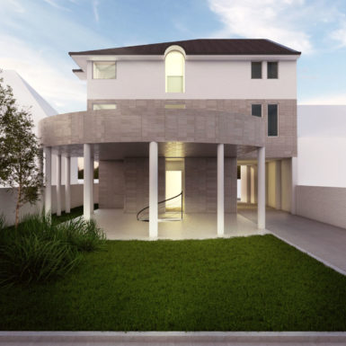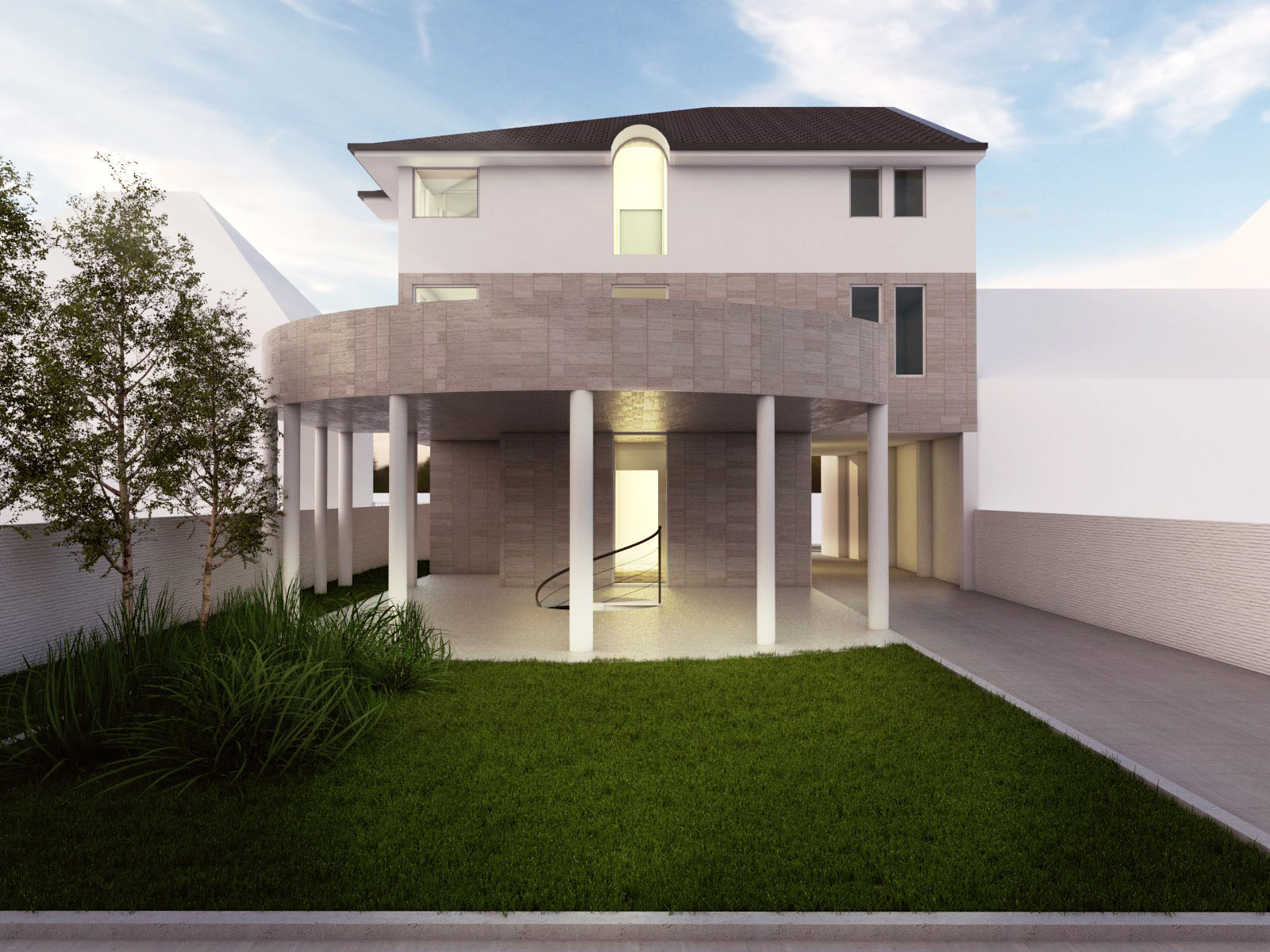 Ova banjalučka gradska vila visokog standarda, zanimljiva je prije svega zbog karaktera, detalja koji je oplemenjuju, ali i strukture sadržaja koje pruža korisnicima. Zatvoreni bazen u dvorisnom dijelu podrumske etaže, kao cjelovit korpus predstavlja neposrednu vezu kuće sa spoljašnom sredinom i integriše prostor. Njegova konstrukcija je od klasičnih elemenata, a pokrivena je terasom prizemlja koja je ustvari staklena bašta. Kuća je sa jugoistočne strane prilično svedena, bez posebne formalne razrade, tu je glavni ulaz u poslovni prostor, kolski pristup dvorištu, pješački pristup, što ukazuje na činjenicu da su dnevni prostori i mjesta za odmor okrenuta dvorištu. Objekat je postavljen na parceli tako da se u njegovom, uslovno rečeno zaleđu, formira zeleni pojas oivičen ogradom sa detaljima zelenila skulpturalnog karaktera. Sugestivnost ovakvog prostora, svakako je neodoljiva, imajući u vidu materijale za oblaganje površina, detalje, mobilijar.