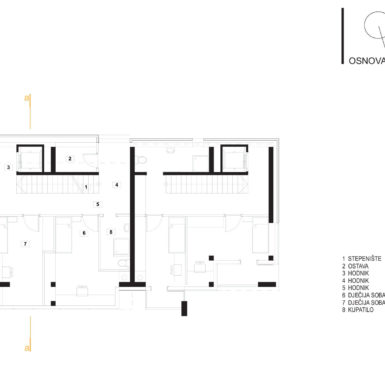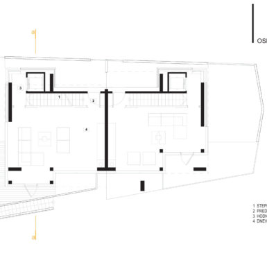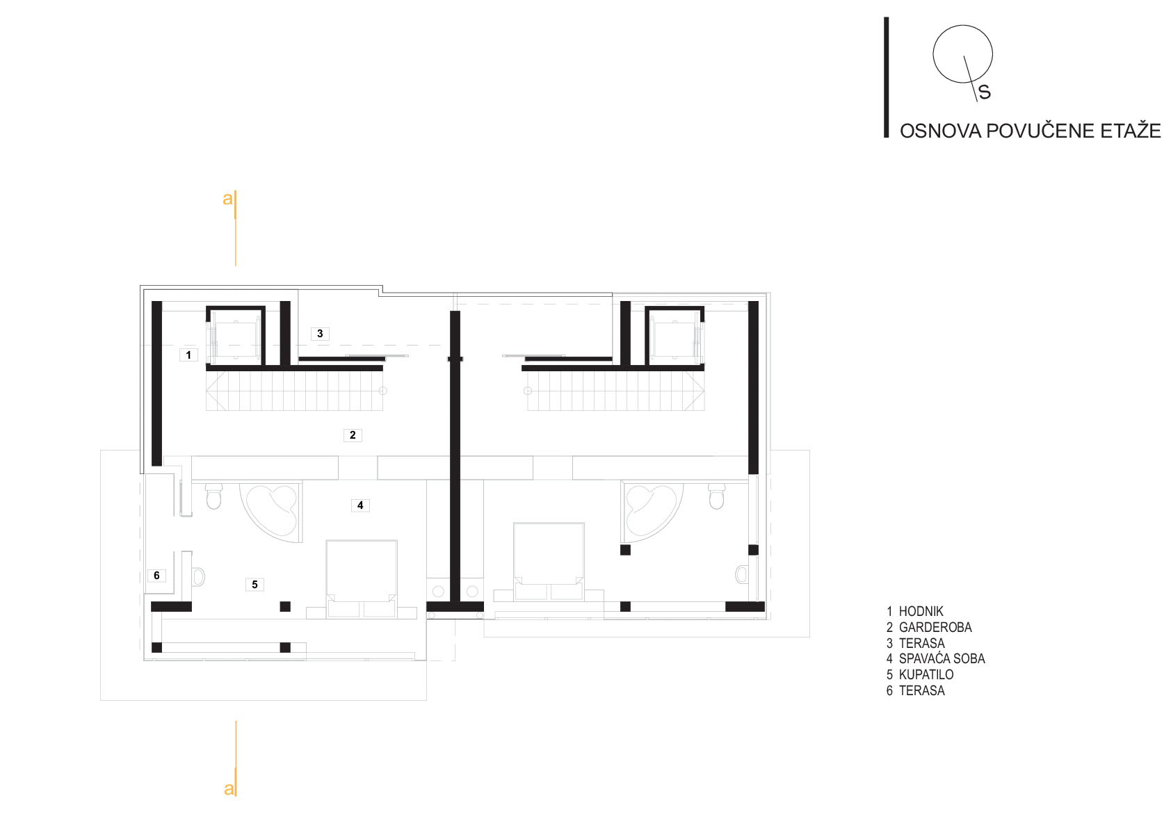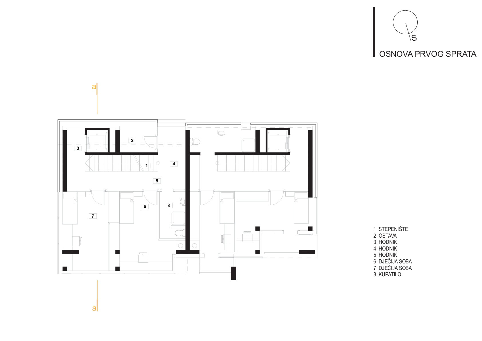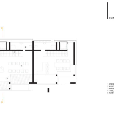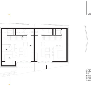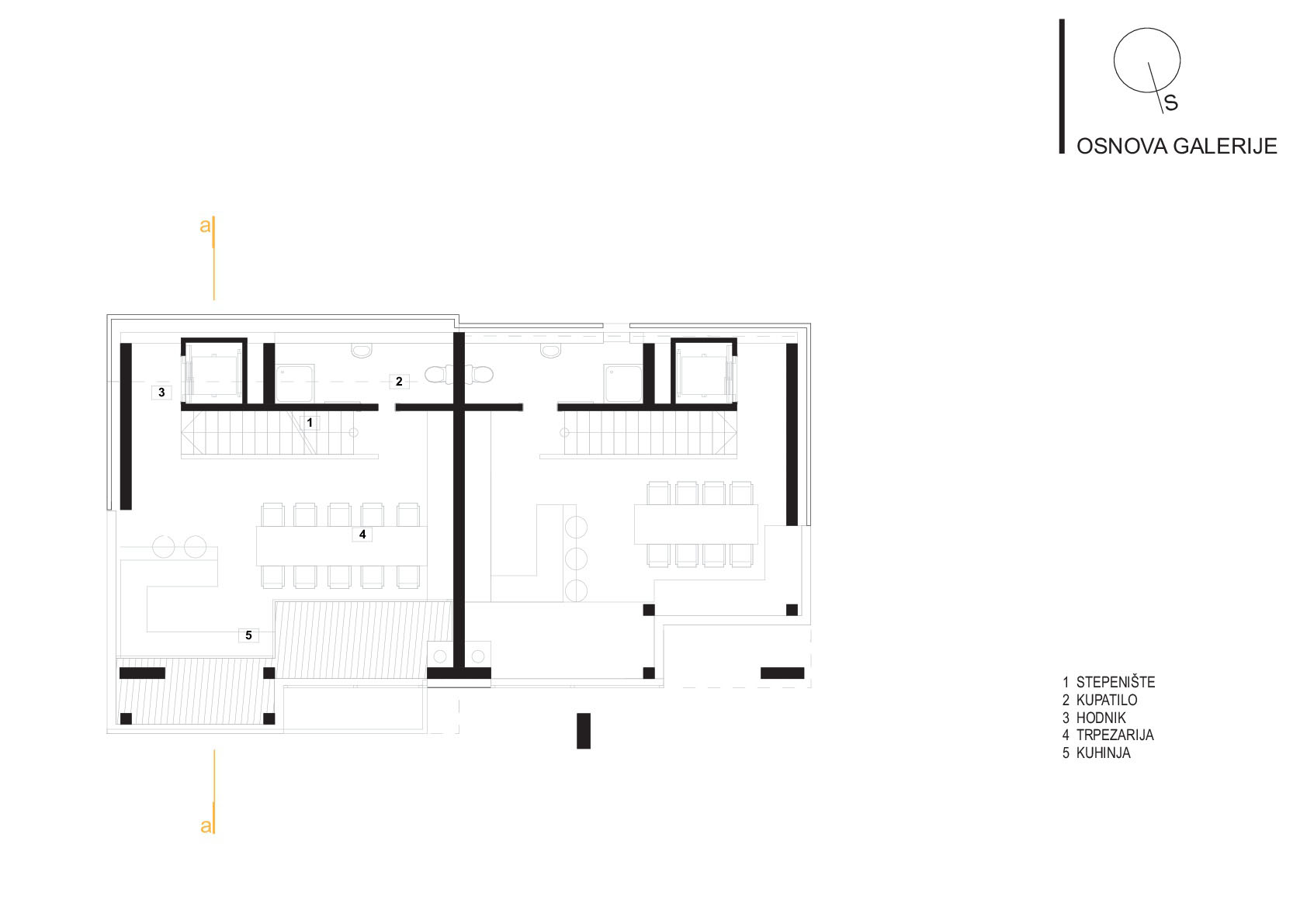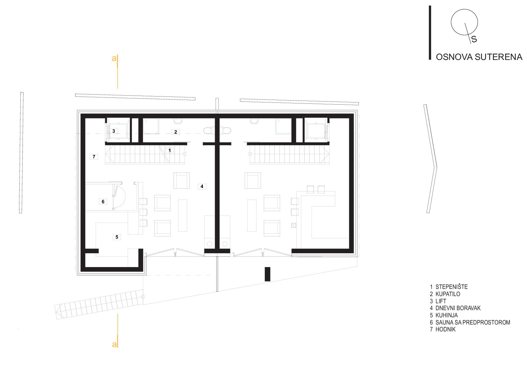 U suterenu je vinarija, konoba, ostava čamaca, dvorište omeđeno Vrbasom prostor potpunog mira. Na prizemlju dnevni boravak sa kuhinjom i trpezarijom i na tom nivou baštom. Na spratu sobe za spavanje i prateći prostori, a na povučenoj etaži studio za vlasnika.