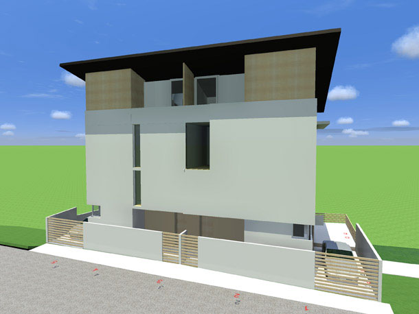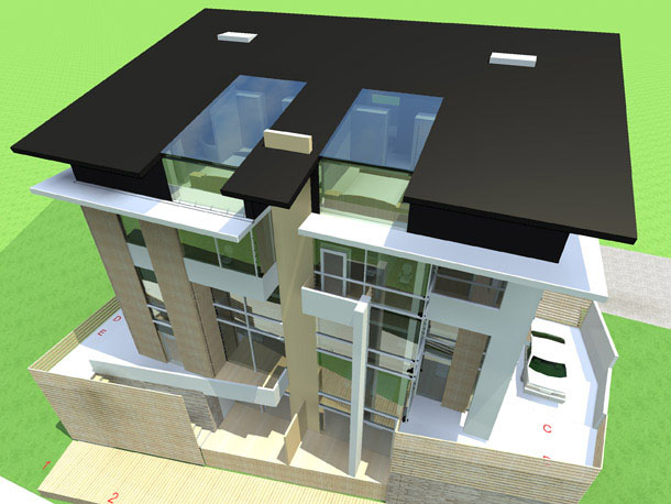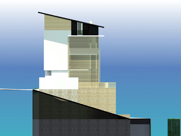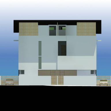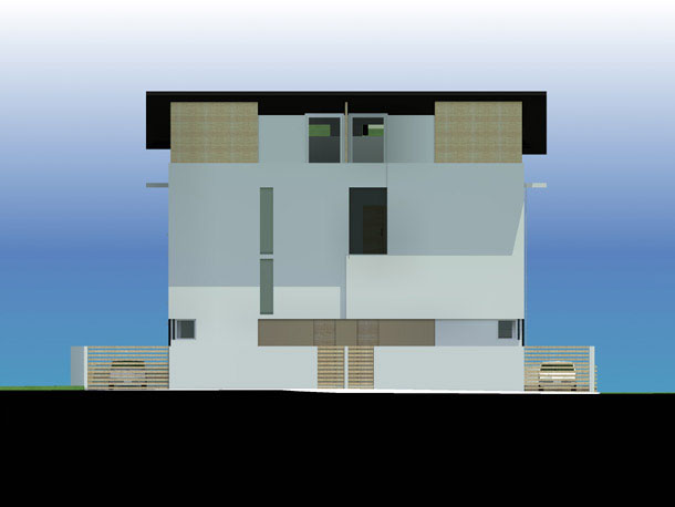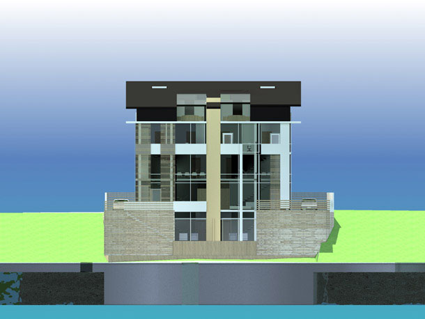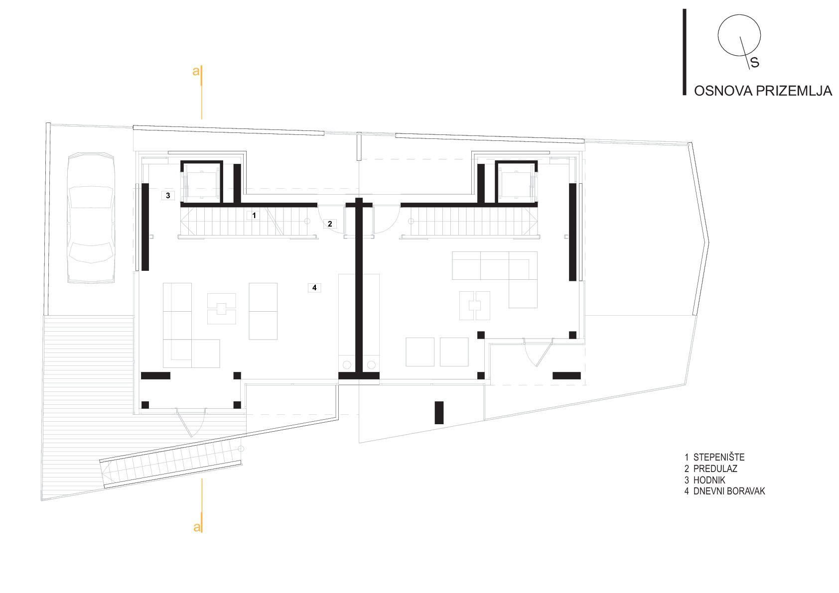 Kuća se nalazi uz rijeku Vrbas, sa ulazne zapadne strane je aleja kestenova, a sa istočne rijeka. Prostori postavljeni u horizontalnom slijedu sinhrono slijede jedan drugi i od minimalističkog dnevnog boravka preko trpezarije okružene staklima i sa direktnim izlazom na jug ili istok u baštu izolovanu sa svih strana.