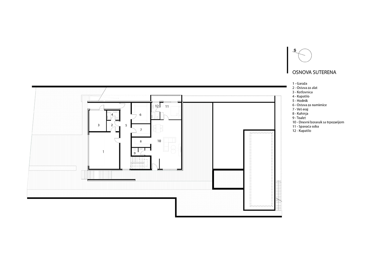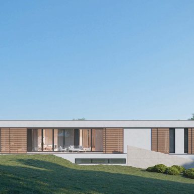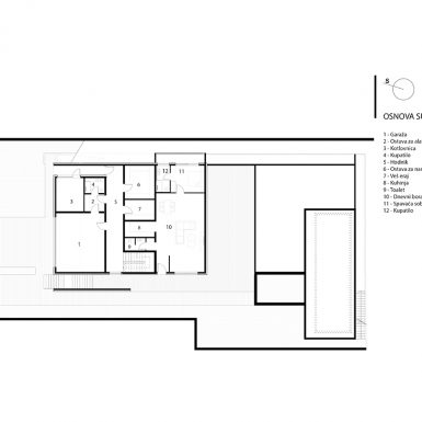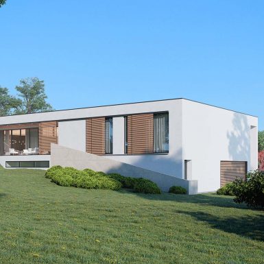 Porodična kuća, dom gdje su sve prostorije smještene u jednu pravougaonu kutiju, dugačku, a široku, različitih visina jer se na jednoj strani zakačila za padinu na nivou suterena, a na drugoj nalegla na istu na nivou prizemlja. Za razliku od modernističkog pristupa, koji daje utisak da je kuća postavljena na tlo, ova kuća je zagnjurena u zemlju što doprinosi spoju enterijera i eksterijera.