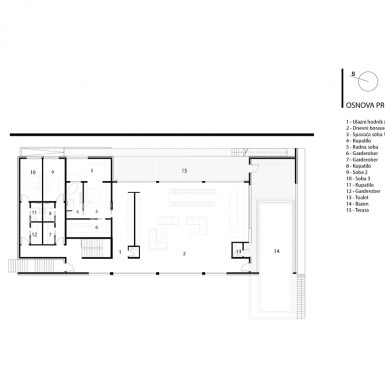 U oblikovnom smislu čisti volumen pravougaone forme, dijelom zatvoren, dijelom potpuno prozračan i otvoren, uklopljen u svoje prirodno okruženje koje oplemenjuje. Provlačenjem istog na krov, proširuje u funkcionalnom smislu, različite funkcionalne cjeline, kao prostori odmora i spavanja, prostori zajedničkog boravka, oni oko bazena ili oni za goste i prateći funkcionalni prostori su dali tri glavna prostora na dva nivoa.
