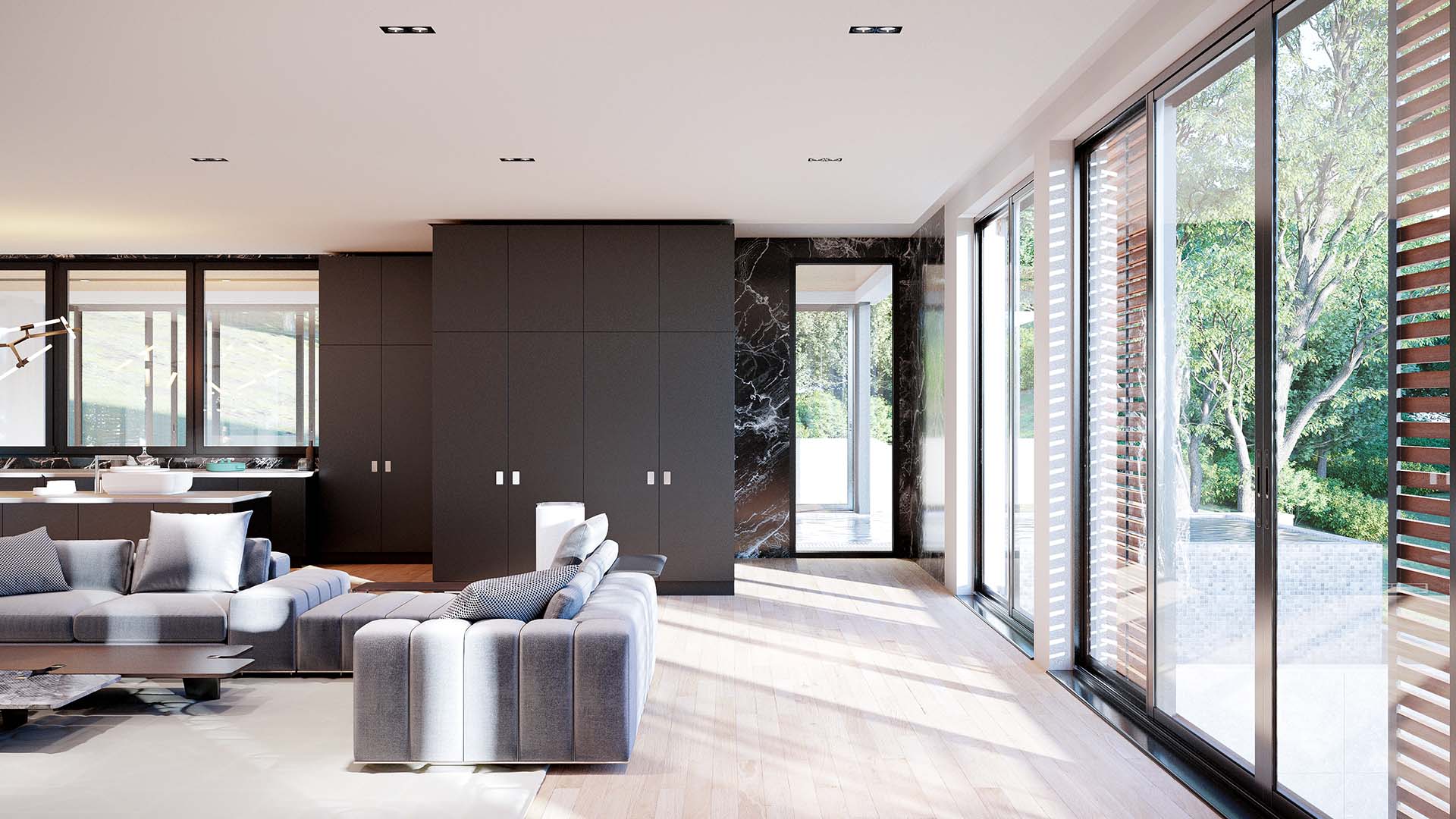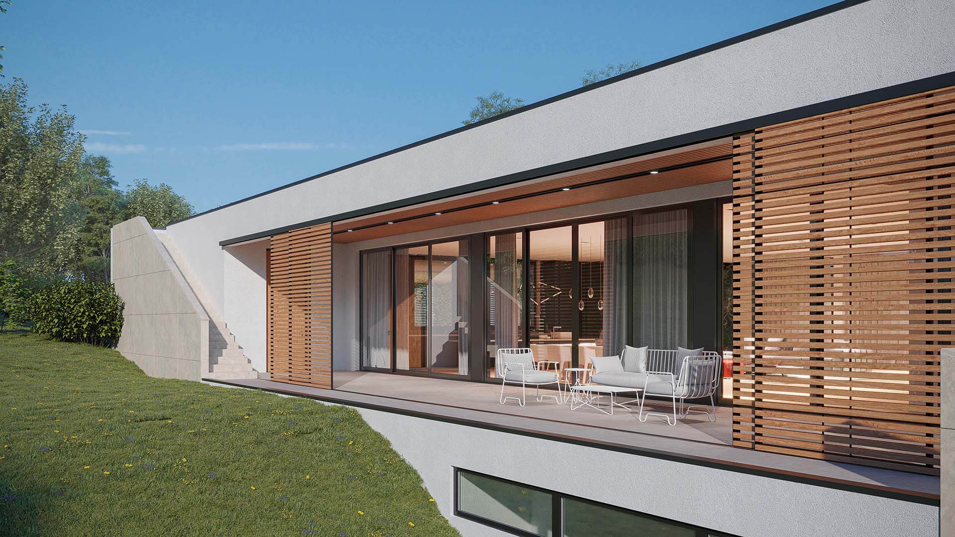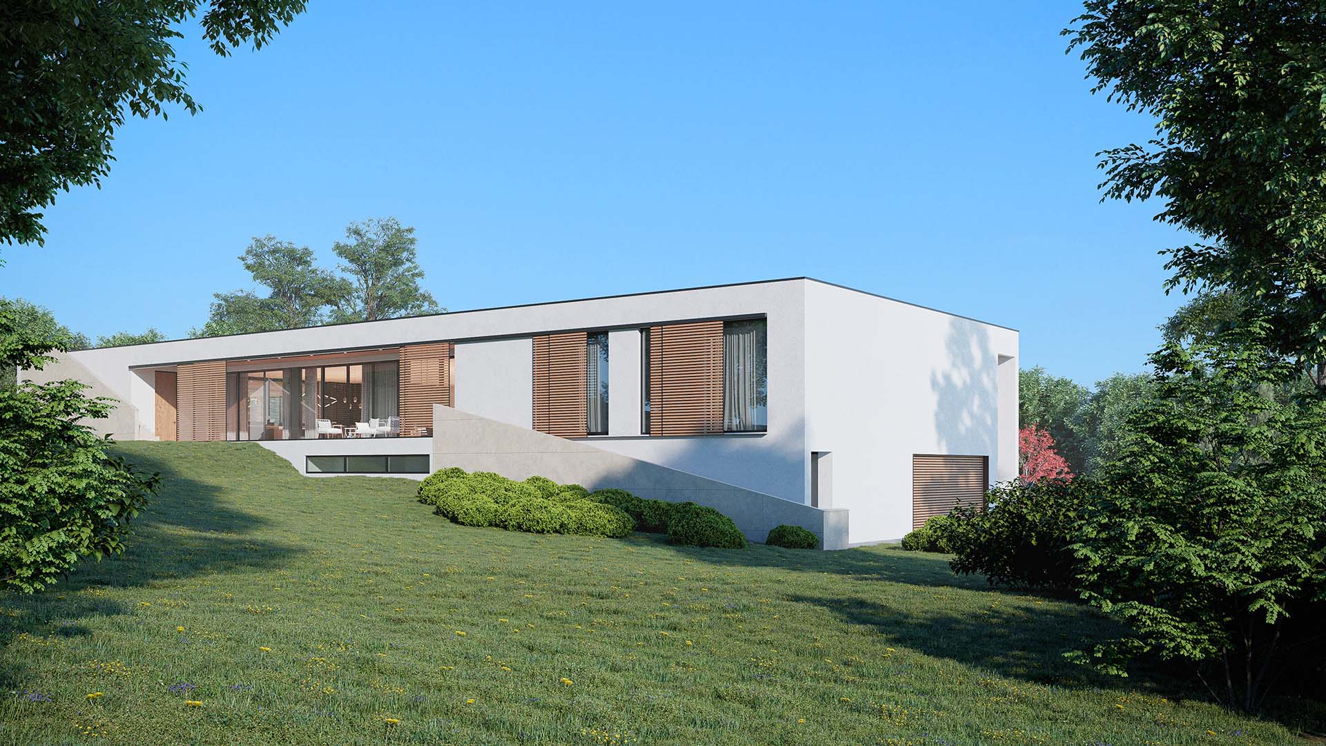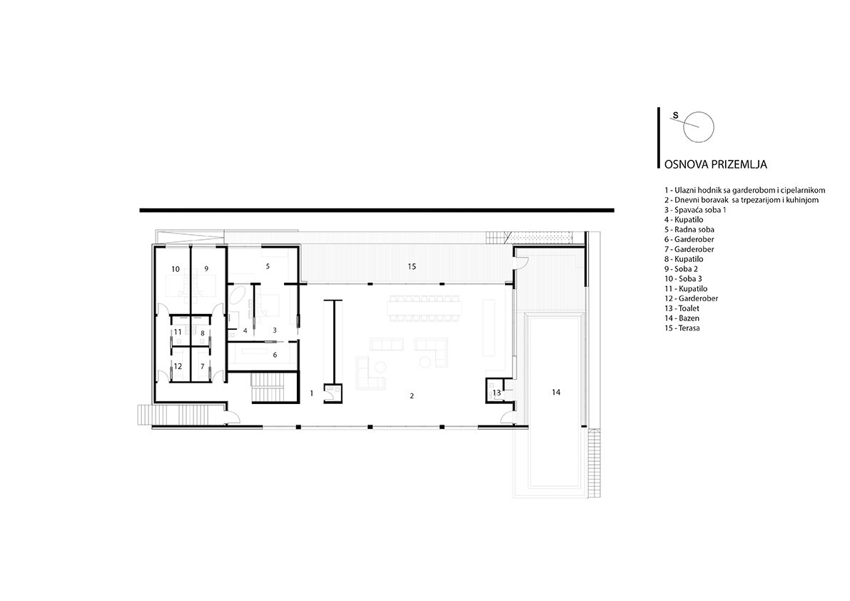 Projektovani su prostori koji se ulijevaju jedan u drugi, bez vidljivih prelaza, longitudinalno od kapije, kroz ili pored objekta do bazena, na padini koja je nagnuta prema jugu i površine da za sve ima prostora.