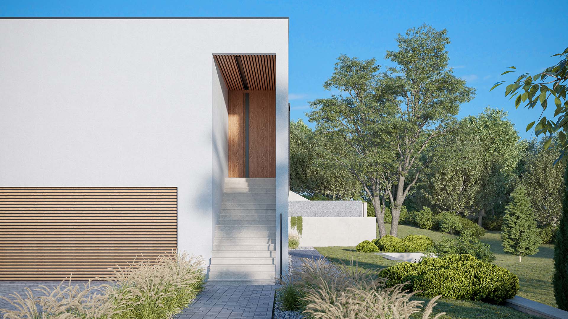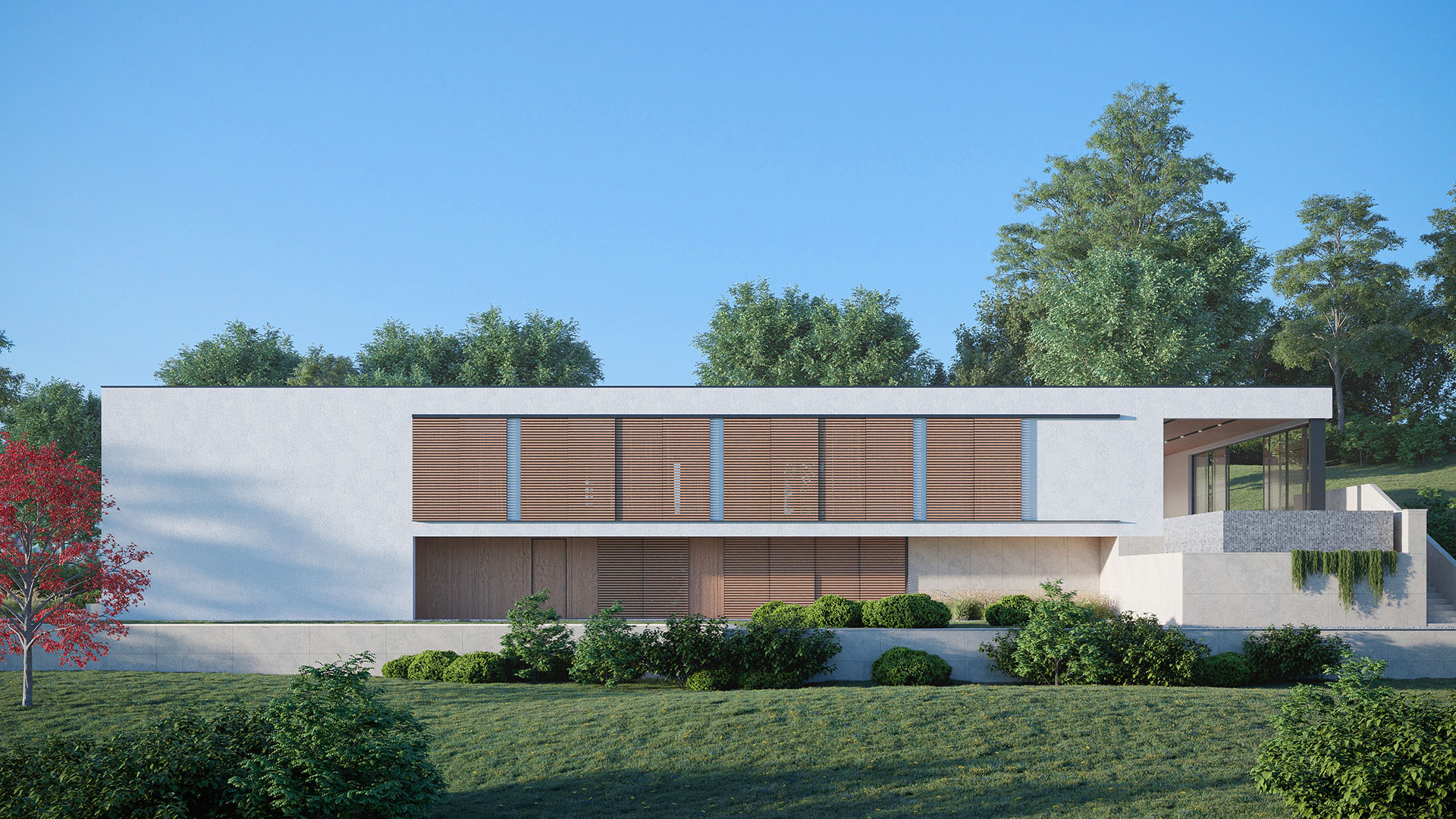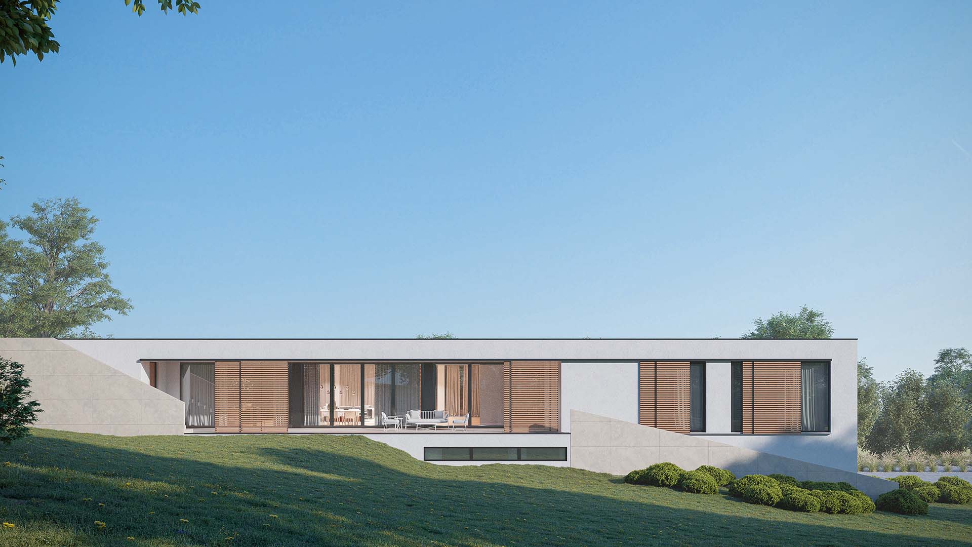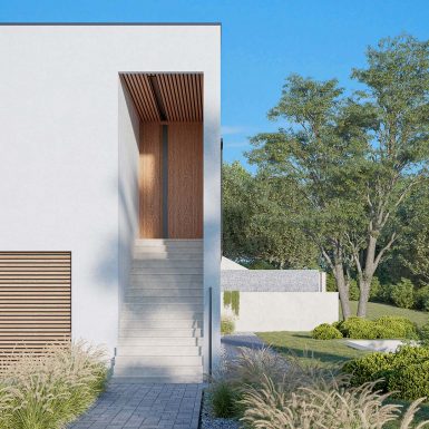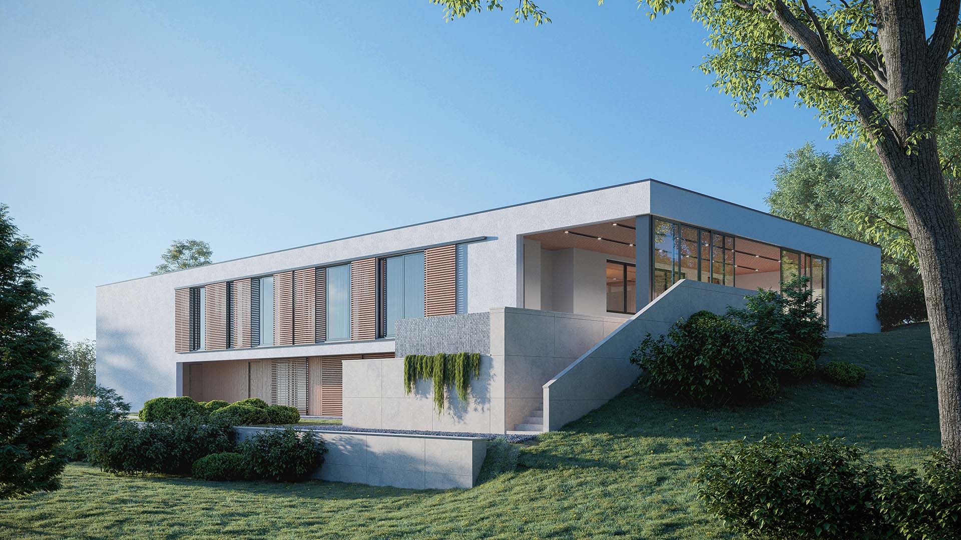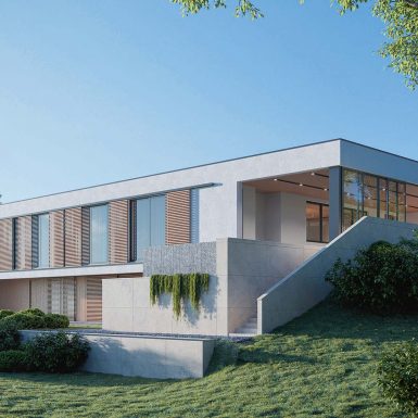Planirana je za dom četvoročlane porodice, ali i za mogućnost boravka više ljudi, sa zajedničkim prostorima za druženje i sa mogućnošću potpune privatnosti kad neko poželi mir. Zaštićena visokom bijelim zidom na dolaznoj strani, oklop djeluje nepovrediv, glavna linija kuće prati spoljni plan, a visoki naglašeni portal usmjeren ka ulazu do koga vode široke stepenice i ulazak u prostor, koji odaje sasvim drugačiji utisak. Stakleni zidovi u kontinuitetu na fasadi daju utisak otvorenosti i sna o domu u kome će konstrukcija i priroda biti jedno i gdje je ta harmonija obezbjeđena. Zidovi izgledaju kao umjetnička djela, prostor je pravljen po mjeri stanara, a kad padne noć, započinje magična igra svjetlosti, sjenki i zelenkasti odsjaj bazena, a dalje na horizontu različitosti koje samo priroda može da ponudi.