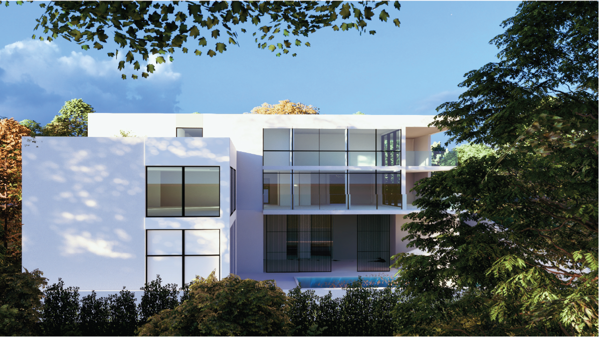 Oblikovanje je smireno, geometriski čisto, sa igrom tamnog volumena i bijelih površina na obodu. Minimalističkom koloritu suprotstavljaju se bogate teksture kamena u suterenu i drveta. Tamni, grubi kamen ugrađuje se kao naglašeni postament i omaž kamenu na lokalitetu, a svijetlim drvetom oblaže se dio ulazne fasade i veliki pomični paneli tvoreći direktnu reference na okolnu šumu. Otvaranje prostora prozorima u visini cijele etaže i prema prohodnom zelenom krovu naglašena je usmjerenost prema eksterijeru I prednostima visokog zelenila na lokaciji.