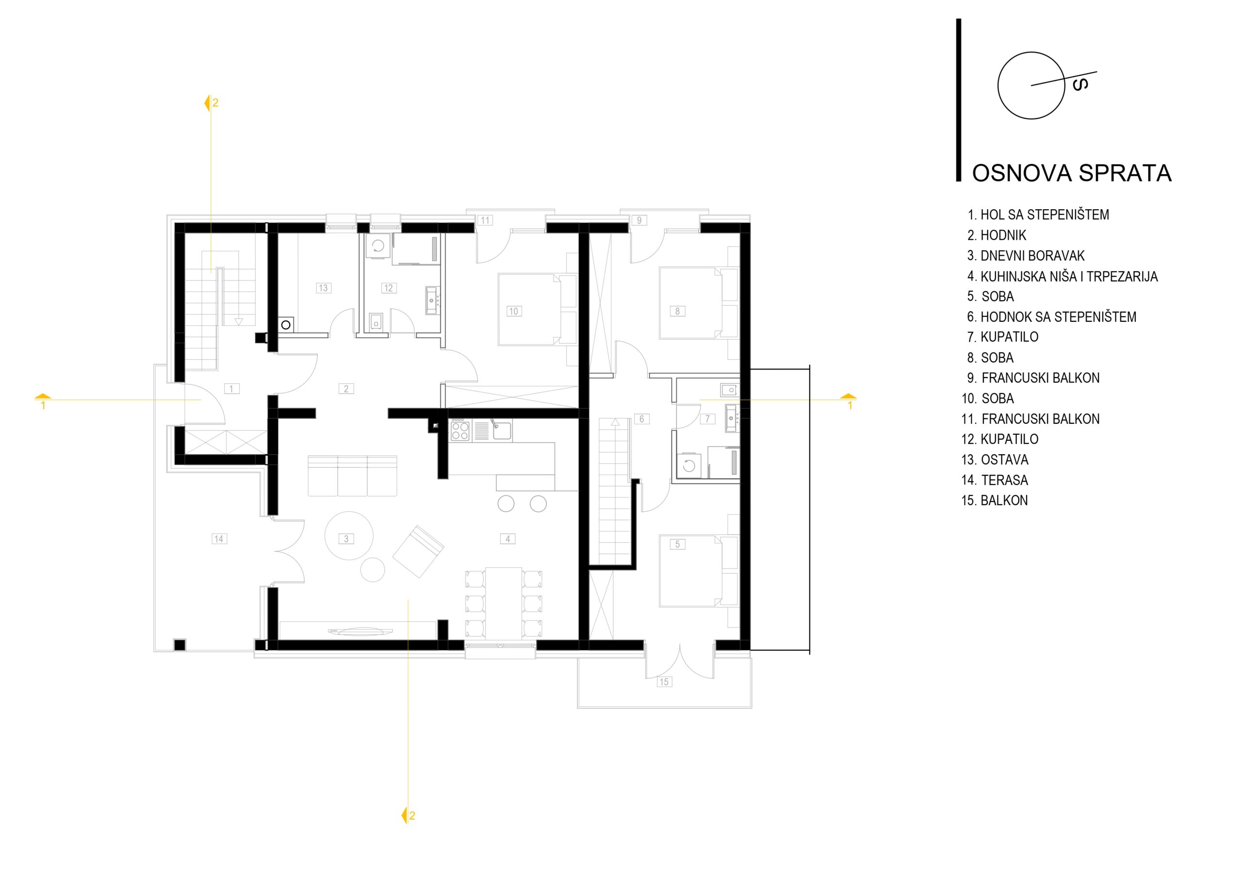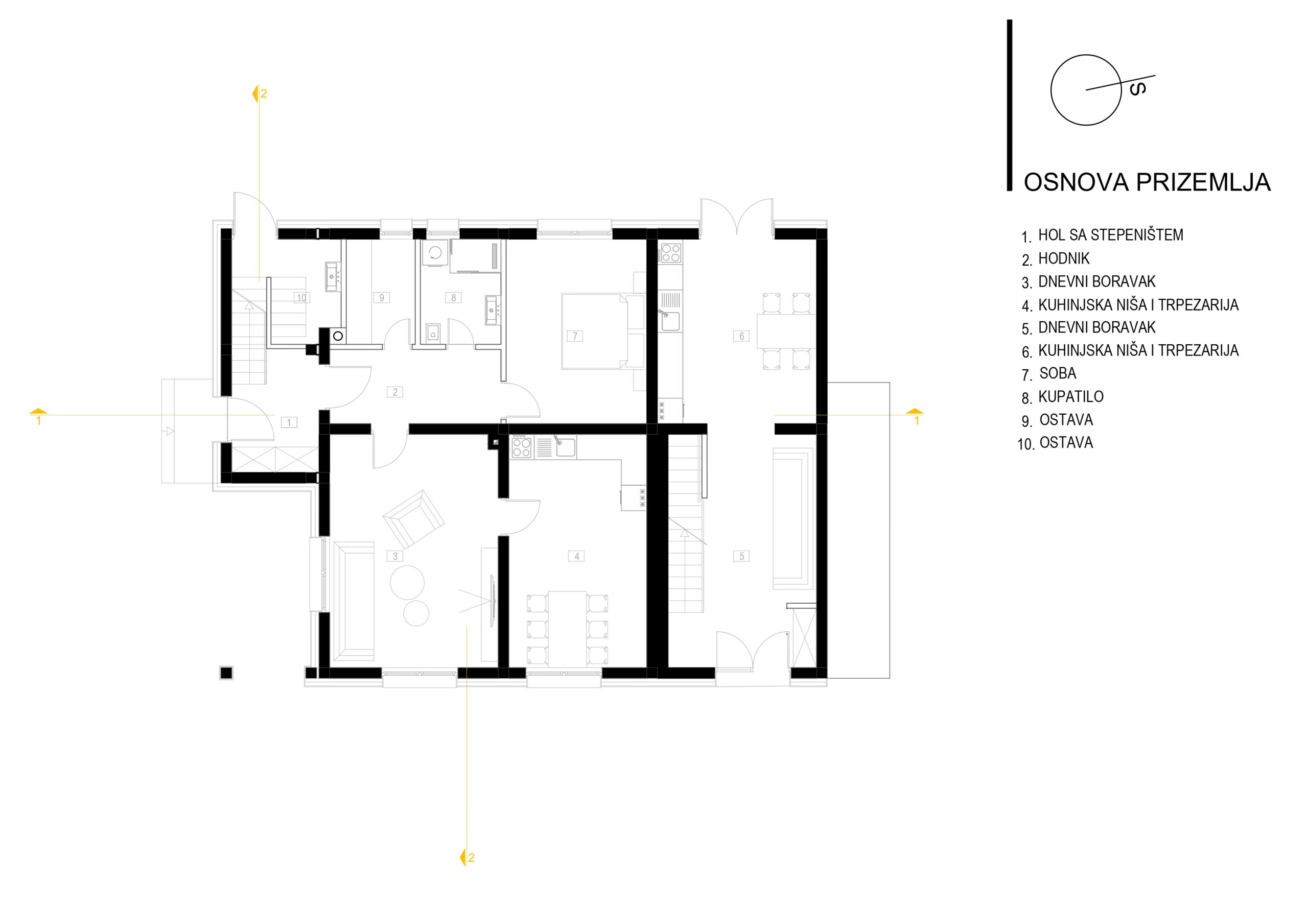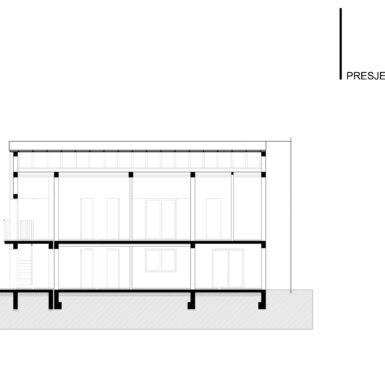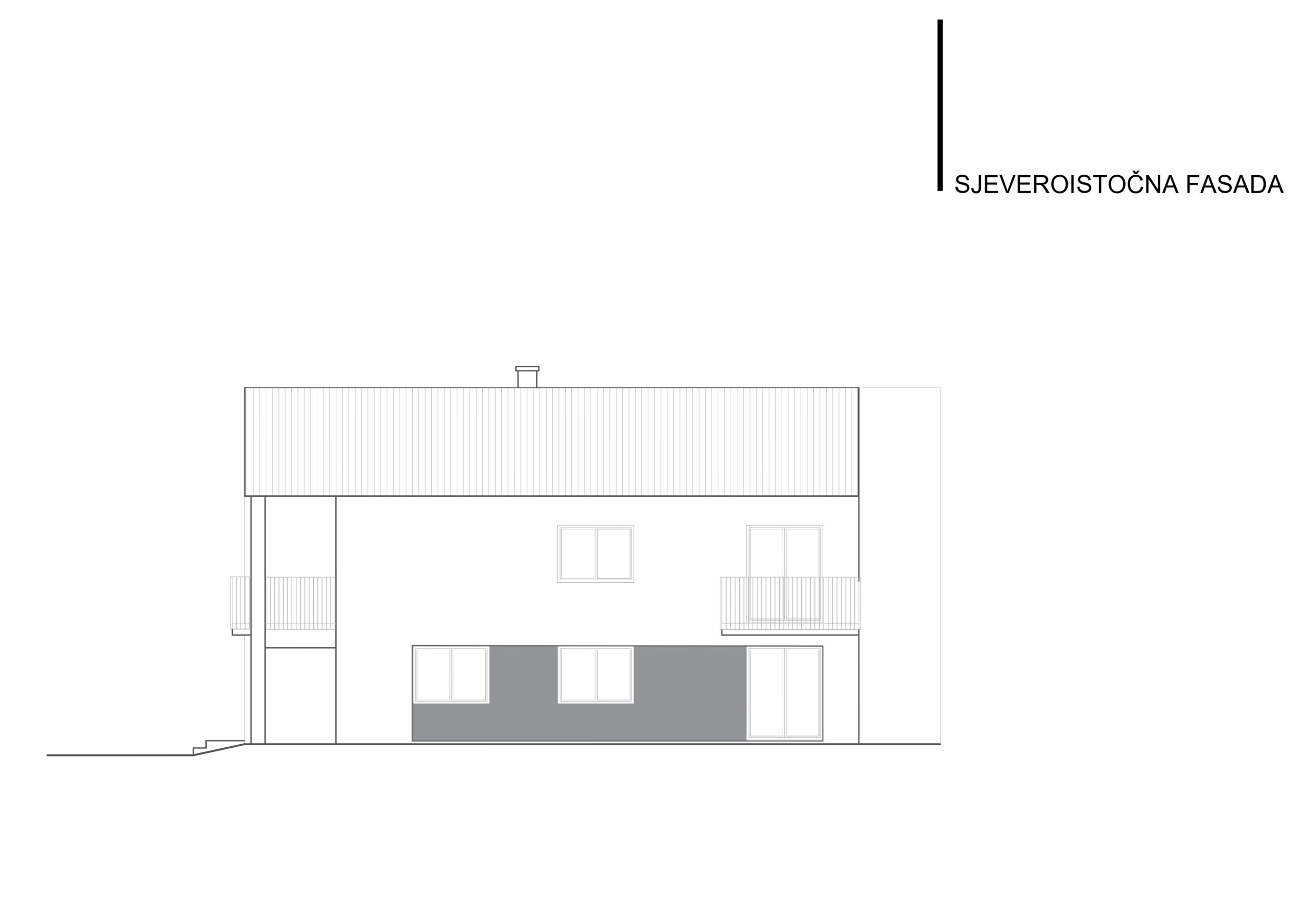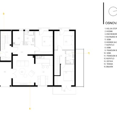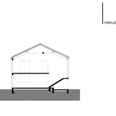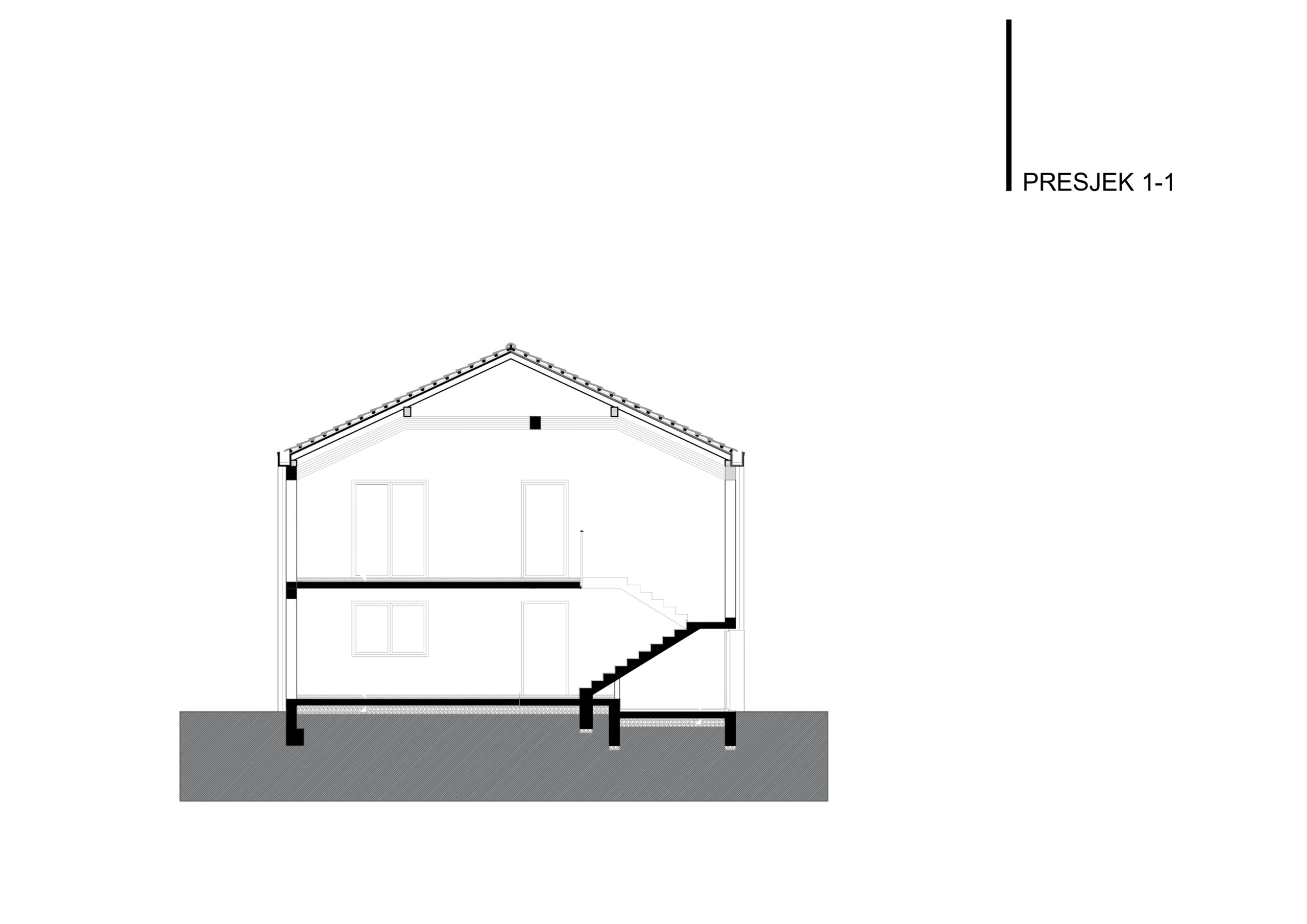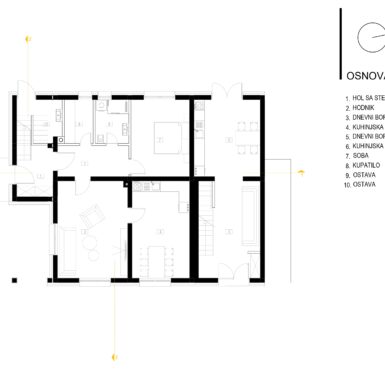 Postojeći objekat i emocionalna veza naručioca sa njim su diktirali oblik kuće i njenu orjentaciju. Na prizemlju su ulazi na sjevernoj i istočnoj strani sa dnevnim boravkom, trpezarijom, kuhinjom i pomoćnim prostorima na toj etaži a obe jedinice sobe za spavanje imaju na potkrovnoj etaži, gdje je veliki tlocrt omogućio dobro organizovanje prostora sa kupatilima i gardarobom.