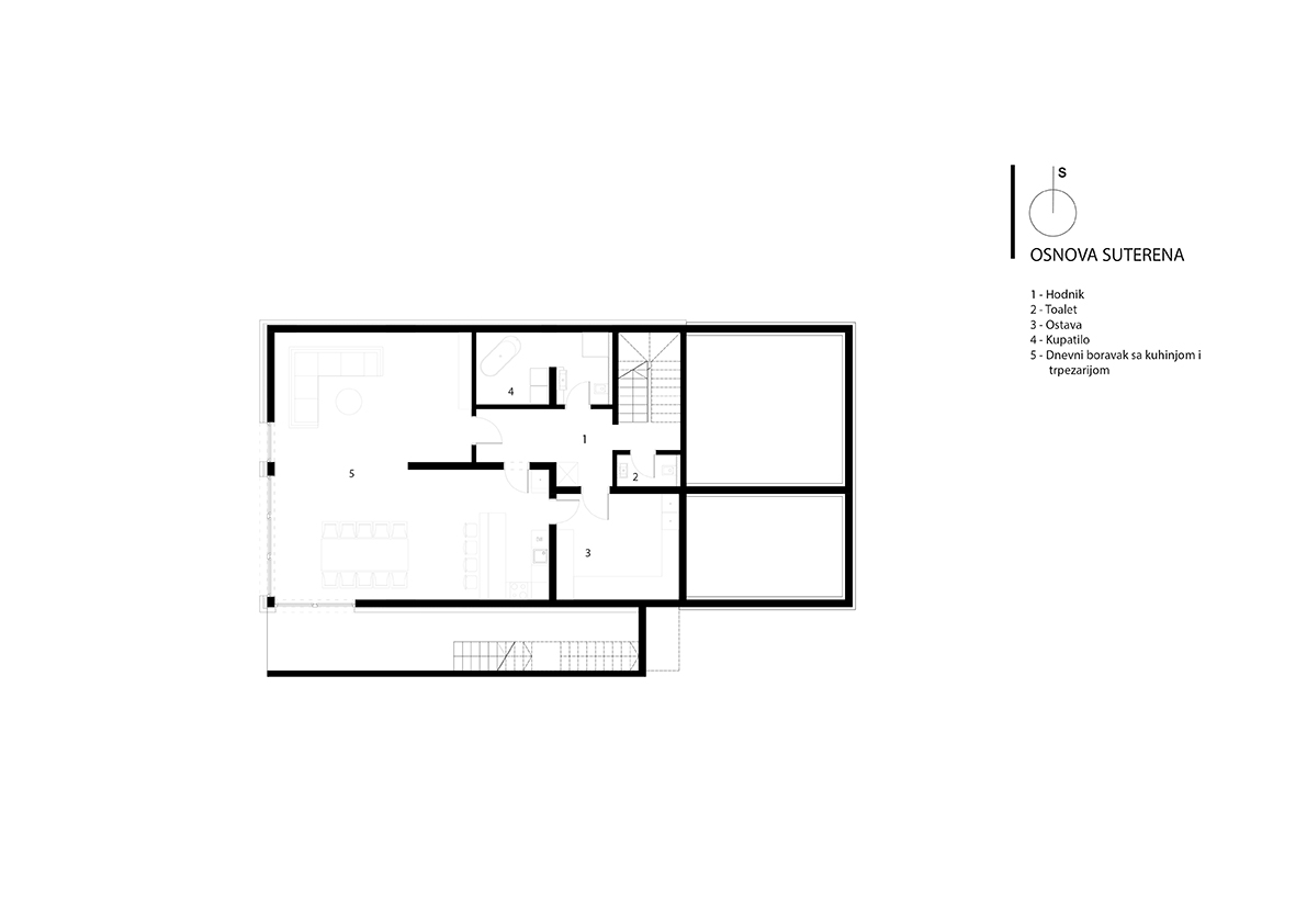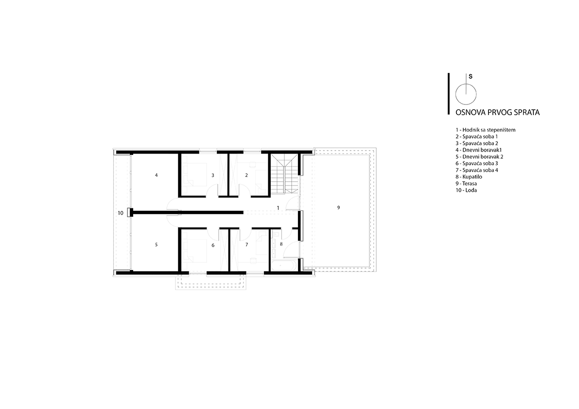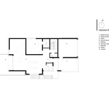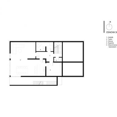 Kuća je projektovana kao spratna građevina koja je sa tri strane ukopana u zemlju, kako zbog visinske razlike tako i zbog uštede energije. Prostorije za boravak i spavanje orjentisane su na jug dok stepenice, toaleti zauzimaju sjeverne prostore. Projektovana je za zajednički boravak i druženje na nivou suterena, prizemlje je dnevni boravak i noćna zona roditelja, a u potkrovlju dva jednaka apartmana za goste.