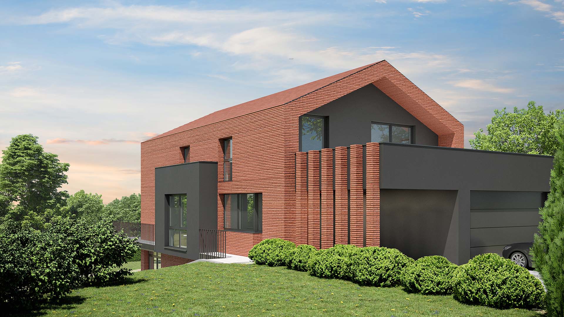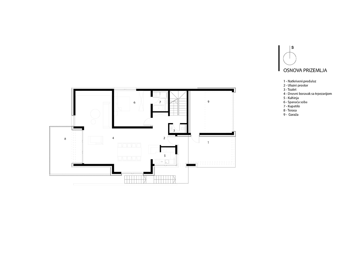 Na putu traženja arhitekture u kojoj jednostavni prostor u skladu sa prirodom i složenim arhitektonskim zamislima, te traženje arhitekture u komunikaciji sa naručiteljem, shvaćena kao slučajna dimenzija, a ne kao trajno utvrđen pojam, te prepoznavanje afiniteta usmjerili su i rezultirali na kraju kućom u ovakvom obliku. S jedne strane zaklonjena od javnog prostora ulice tako što je ukopana za cijelu etažu, a ispred tamo gdje je vidljiva je zaklonjena garažom, dok s druge se strane otvara prema jugozapadu, upija svjetlost, ulazi u vrt koji istovremeno ulazi u unutrašnjost. Položajem na jugozapadnoj padini nadgleda grad koji je tako blizu, a tako daleko.