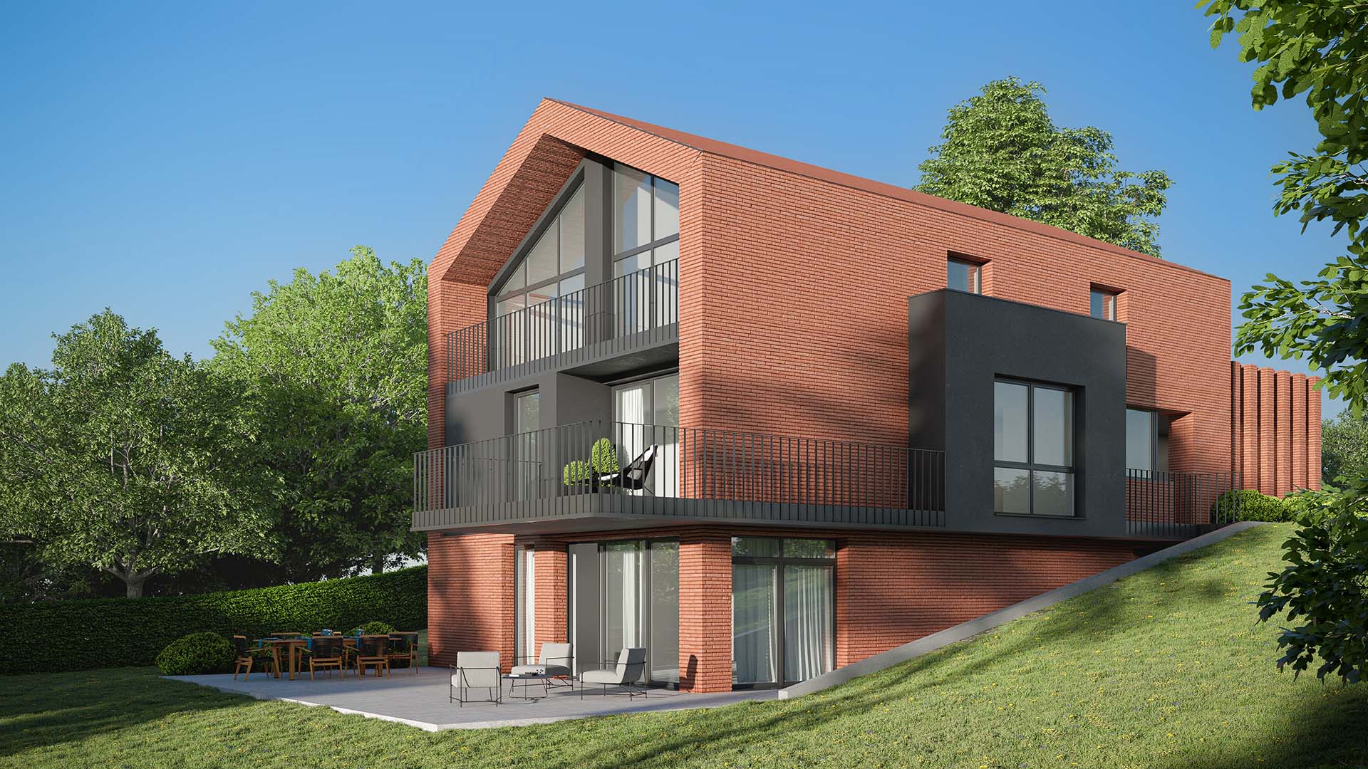 Arhitektura koja ne ide za pobjedom nad okolinom, niti se od nje brani, već na najbolji mogući način koristi postojeće klimatske okolnosti i konfiguraciju tla. Kući se prilazi cestom od šljunka. Taj neprilagođeni put prekid je sa civilizacijom. Izgled parcele na prvi je pogled nedojmljiv, osiromašeno tlo pokriveno kupinama, ali padajući pravac pruža pogled na grad i postaje mjesto svježeg doživljaja prostora. Osim što orjentacija odgovara pasivnim načelima kuće, koja hvata sunce u velikim količinama, odluka o smještaju vođena je izborom investitora da vizura obuhvati najbolje od grada.