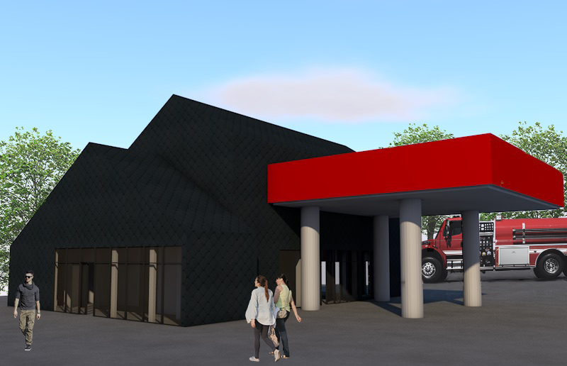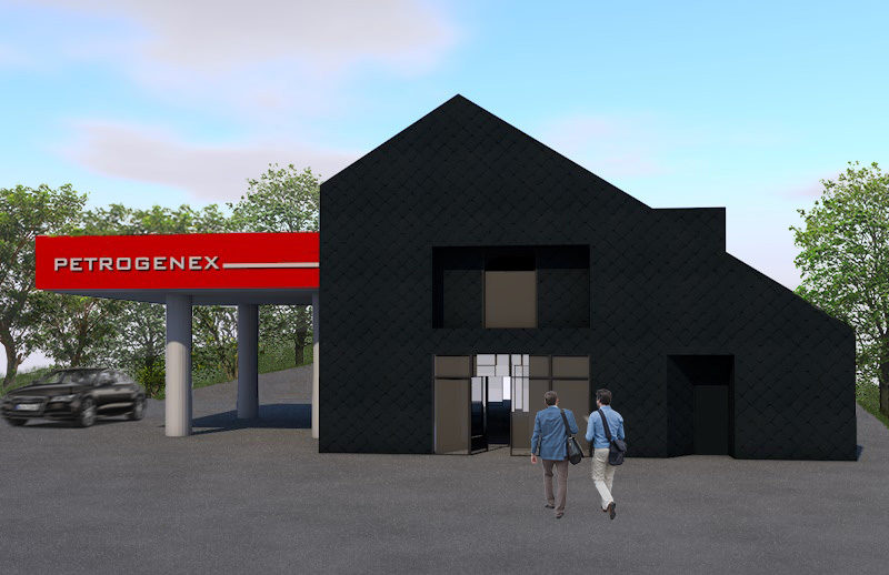 Betonski objekat, sa lukovima na krovu, teškim i klasičnim, upakovan je u trapeznu čeličnu konstrukciju preko koje je opna od aluminiskog lima cijelom površinom zidova, kao i krova. Drugačije je samo tamo gdje su velike staklene plohe. Nadstrešnica točionih mjesta slobodno pluta pored objekta, a bestežinski utisak ostvaren je materijalizacijom u kombinaciji lim,staklo i drvo.