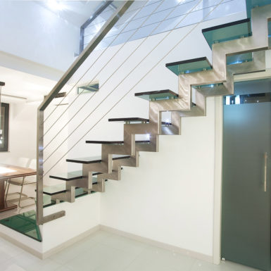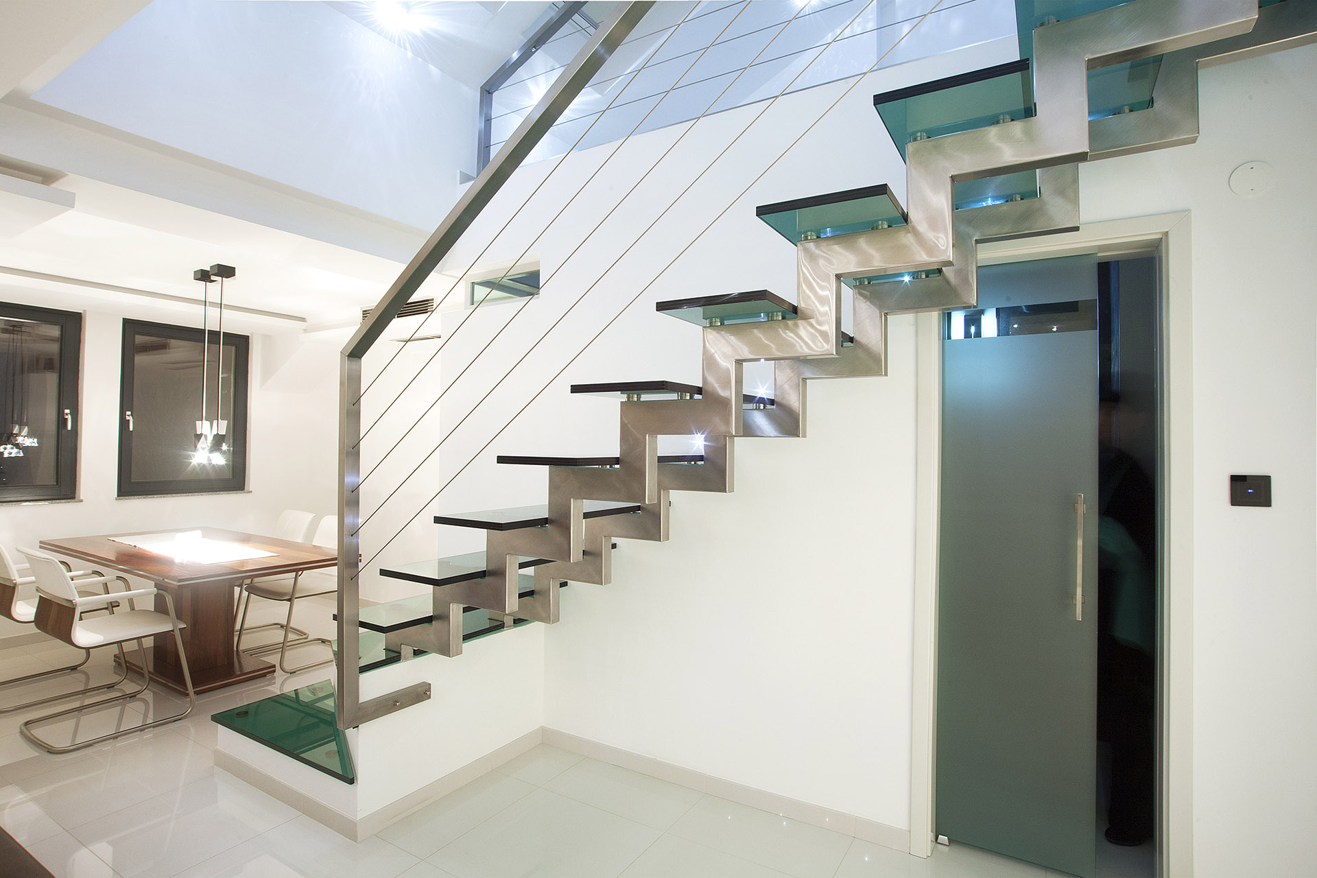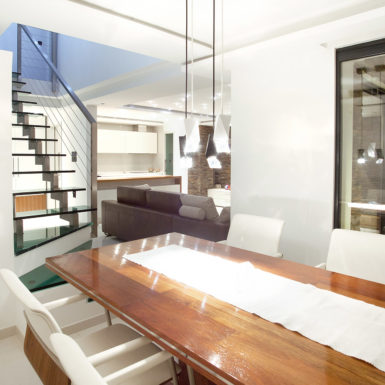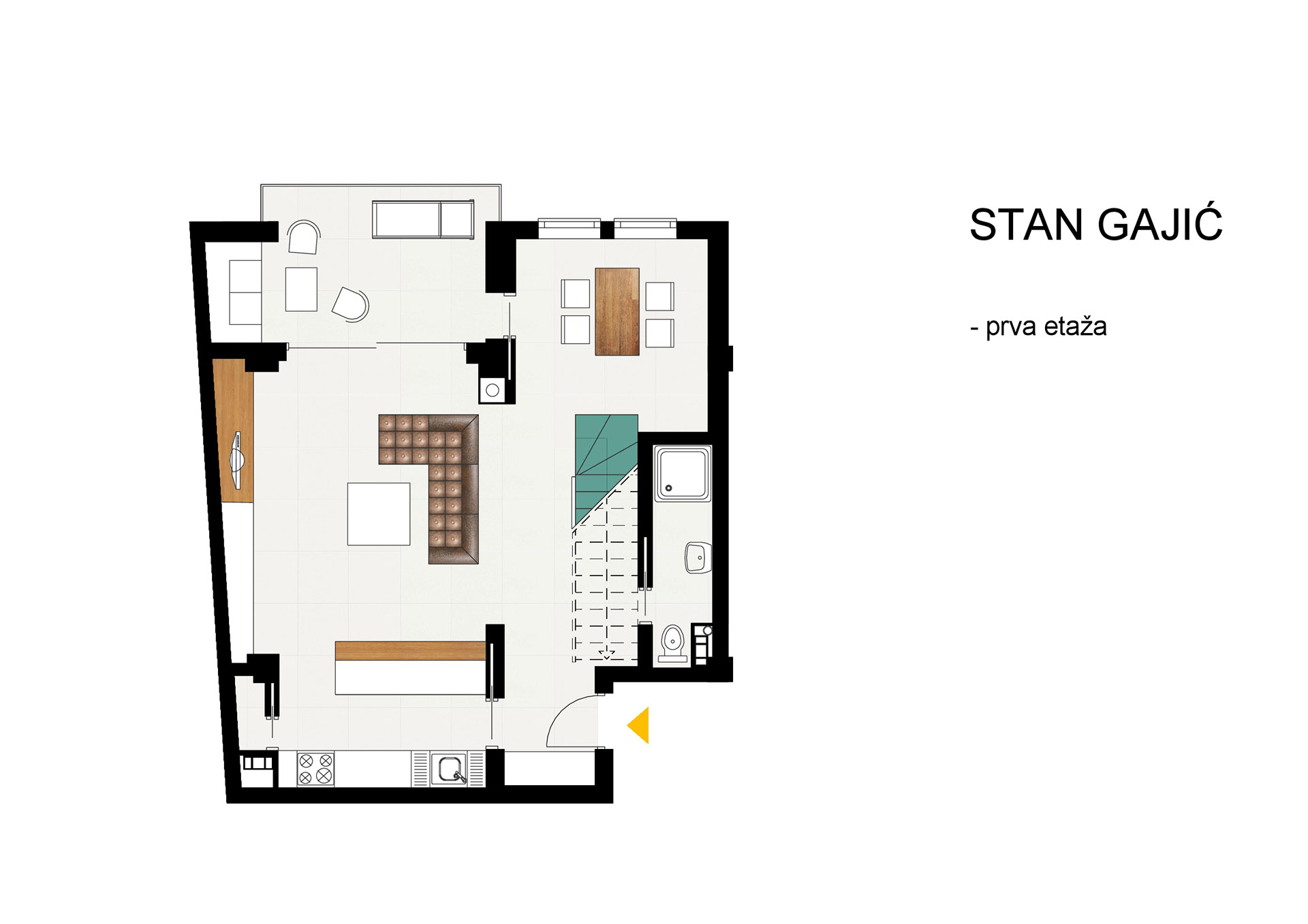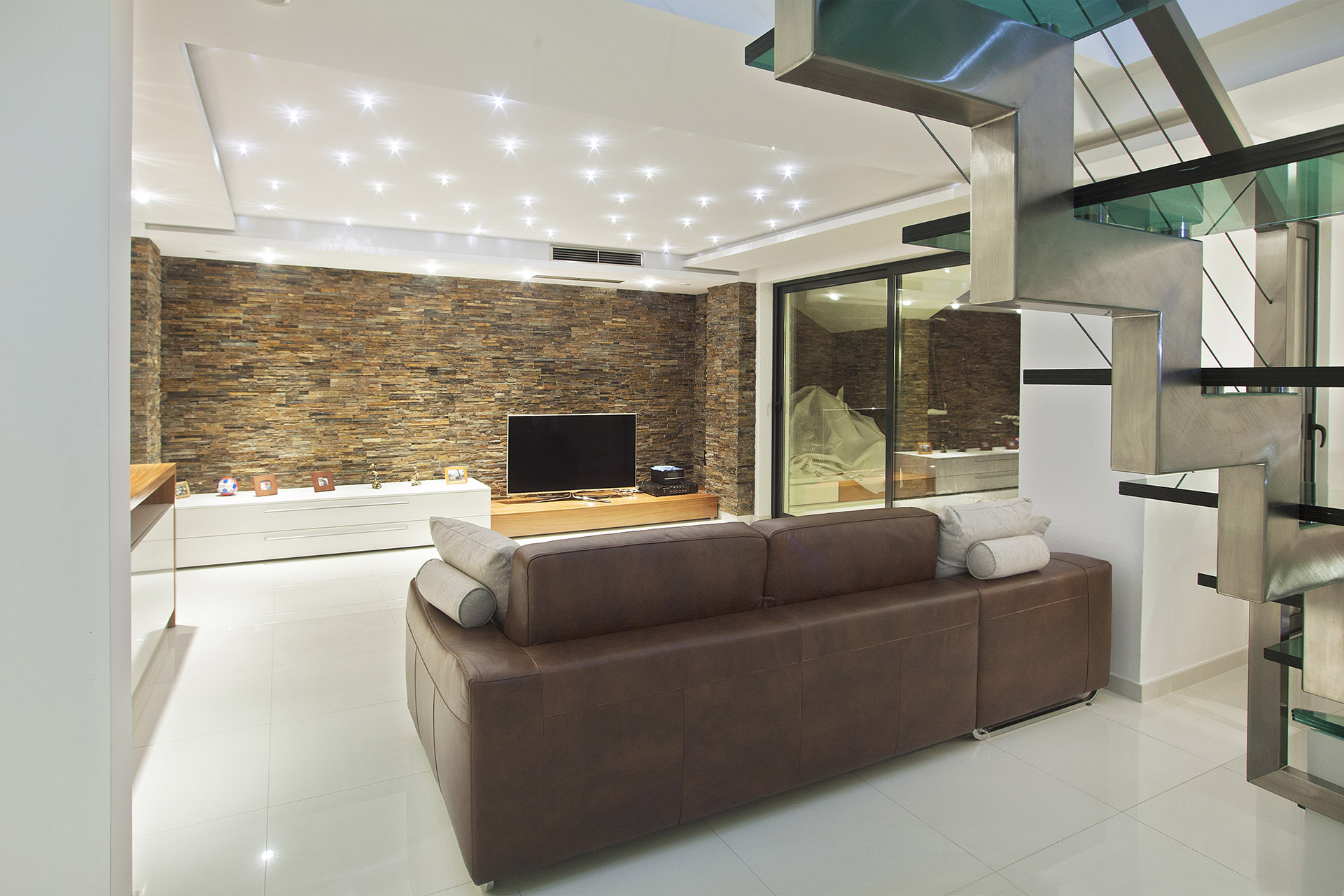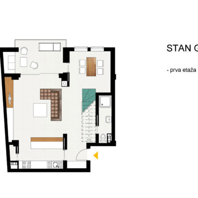 Osnovna tema oličena je u formiranju više ambijenata,oblikovanju koje fizički i misaono podstiče i razvija novi kvalitet života. Ovaj arhitektonski izraz temelji se na načelima minimalizma kako u odabiru materijala,tako i u oblikovanju volumena i površina. Da bi serealizovao ovakav enterijer,bilo je potrebno da se unaprijed stvori jasan concept koji je daljom razradom razvijen do rješenja. Treba napomenuti da su ovom prilikom želje investitora integralni dio oblikovnog koncepta, a za takav vid saradnje bila je potrebna intenzivna komunikacija, koja je vođena tokom cijele realizacije. Pozicije konstruktivnih elemenata enterijera uslovile su raspored ambijentalnih cjelina za svakodnevne aktivnosti. Pokušao se stvoriti jedinstven vizuelni kod,prepoznatljiv i određen. On je ostvaren realizacijom preciznih uglova zidova i stropova koji čine elementi od gipsa, stvarajući potpunu stabilnost forme i skladnu likovnost. U funkcionalnom smislu donja etaža sadrži standardne zone: predsoblje, dnevni boravak, trpezariju, kuhinju, toilet, terasu. Posebnu pažnju privlači zanimljiv novomodelovani zid obložen kamenom koji pripada dnevnom boravku, ali se produžava i na terasu, reguliše prostor u vertikalnom smislu i predstavlja začetak igre punog i praznog sa staklenim stepeništem i ogradom prvog sprata. Jedan od glavnih kvaliteta ovog prostora je stilizacija i činjenica da se svaki detalj radio vrlo pažljivo. Vidljiva istančanost je rezultat multivalentnosti značenja-jedan dio enterijera nadovezuje se na drugi modifikujući ga tako da zajedno čine harmoničnu cjelinu.