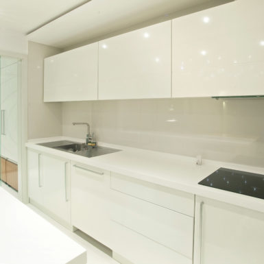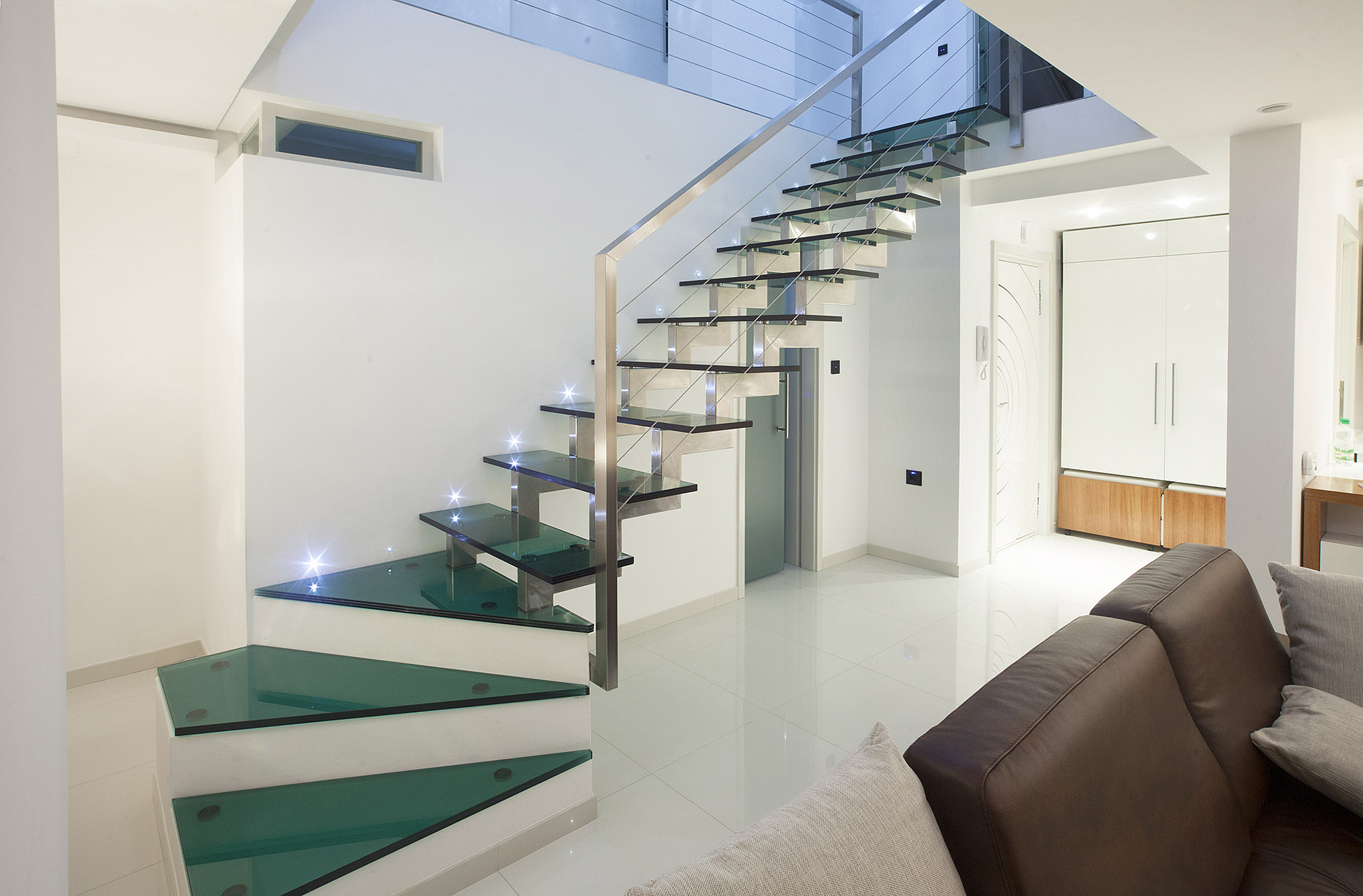 Podne površine obložene bijelom keramikom u prizemlju i parketom od egzotičnog drveta merbau u potkrovlju,uslovili su tip svih ostalih elemenata opreme, a sav pločasti namještaj je projektovan u bijeloj i dijelom ,,merbau”obradi. Od svilenih zavjesa preko komada čuvenih autora,pa sve do završne obrade-kolorita zidova i izbora melba na namještaju je usklađivano. Ove intervencije bile su neophodne kako bi se stvorila atmosfera nepomičnosti i bezvremenosti u kojoj čovjek može da pronađe mir.