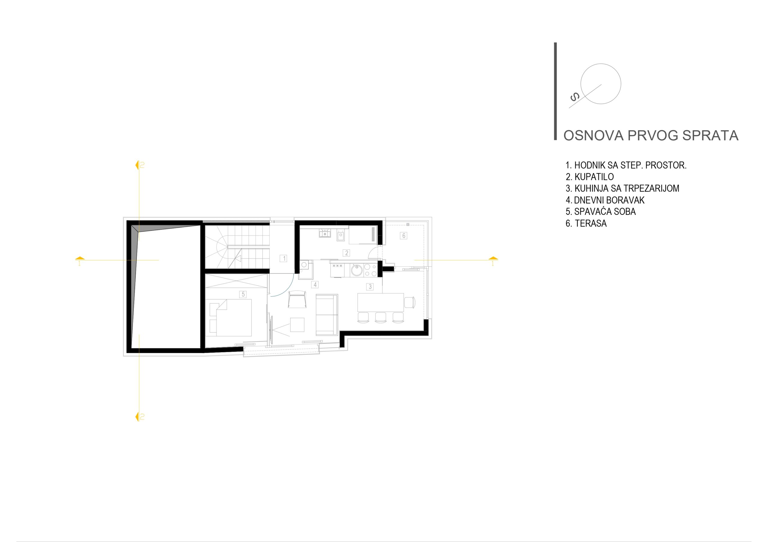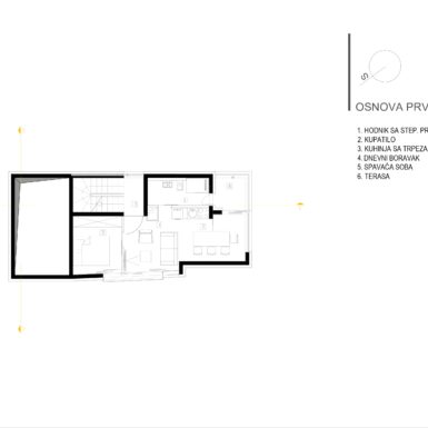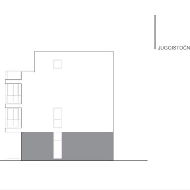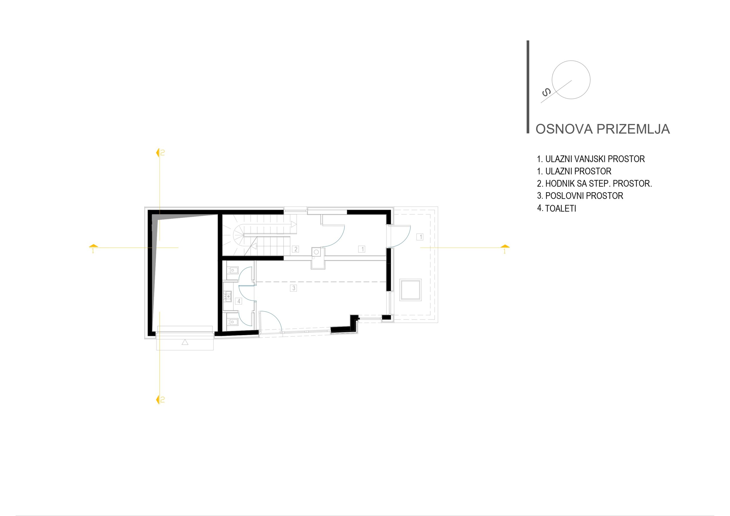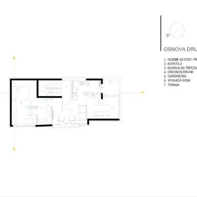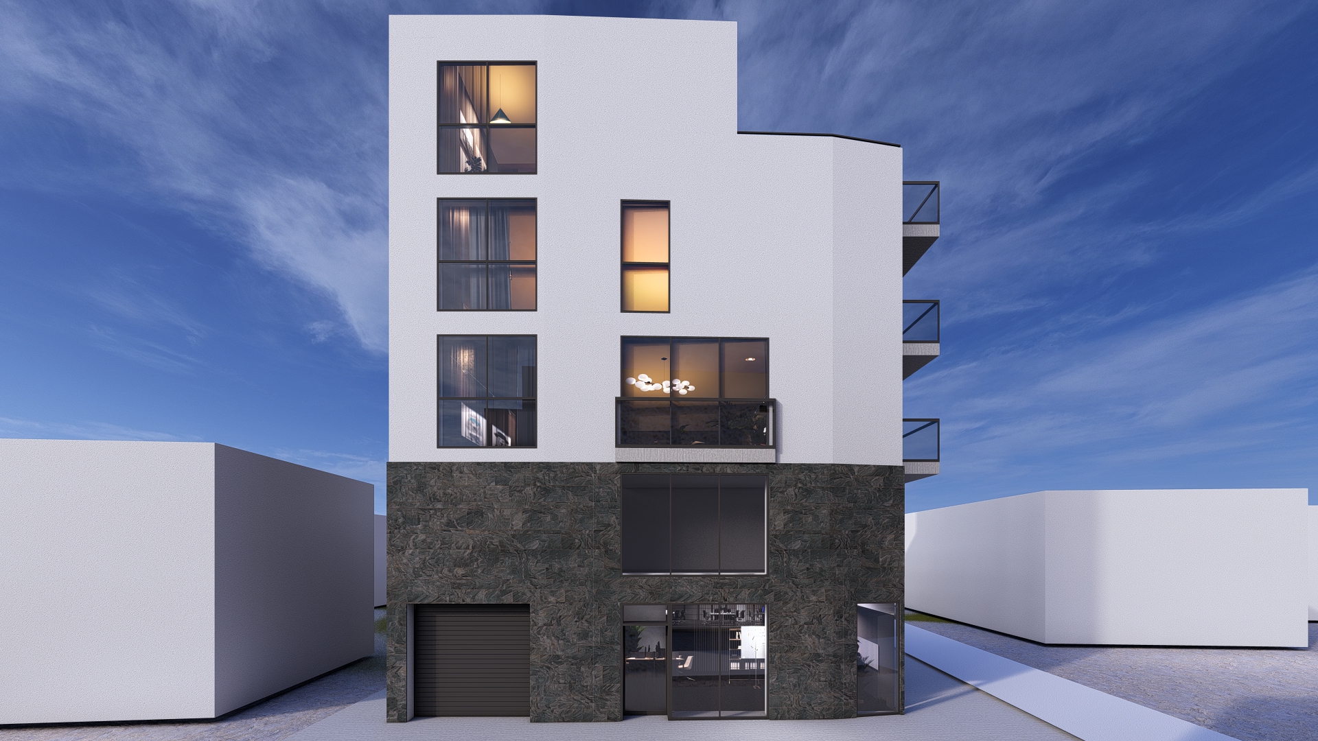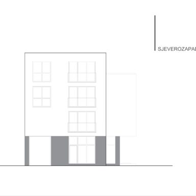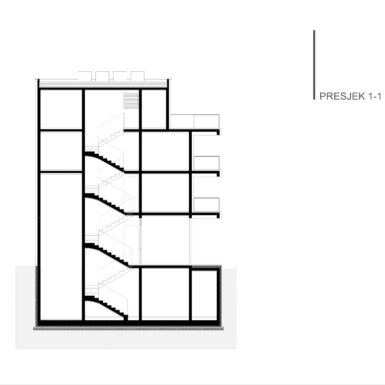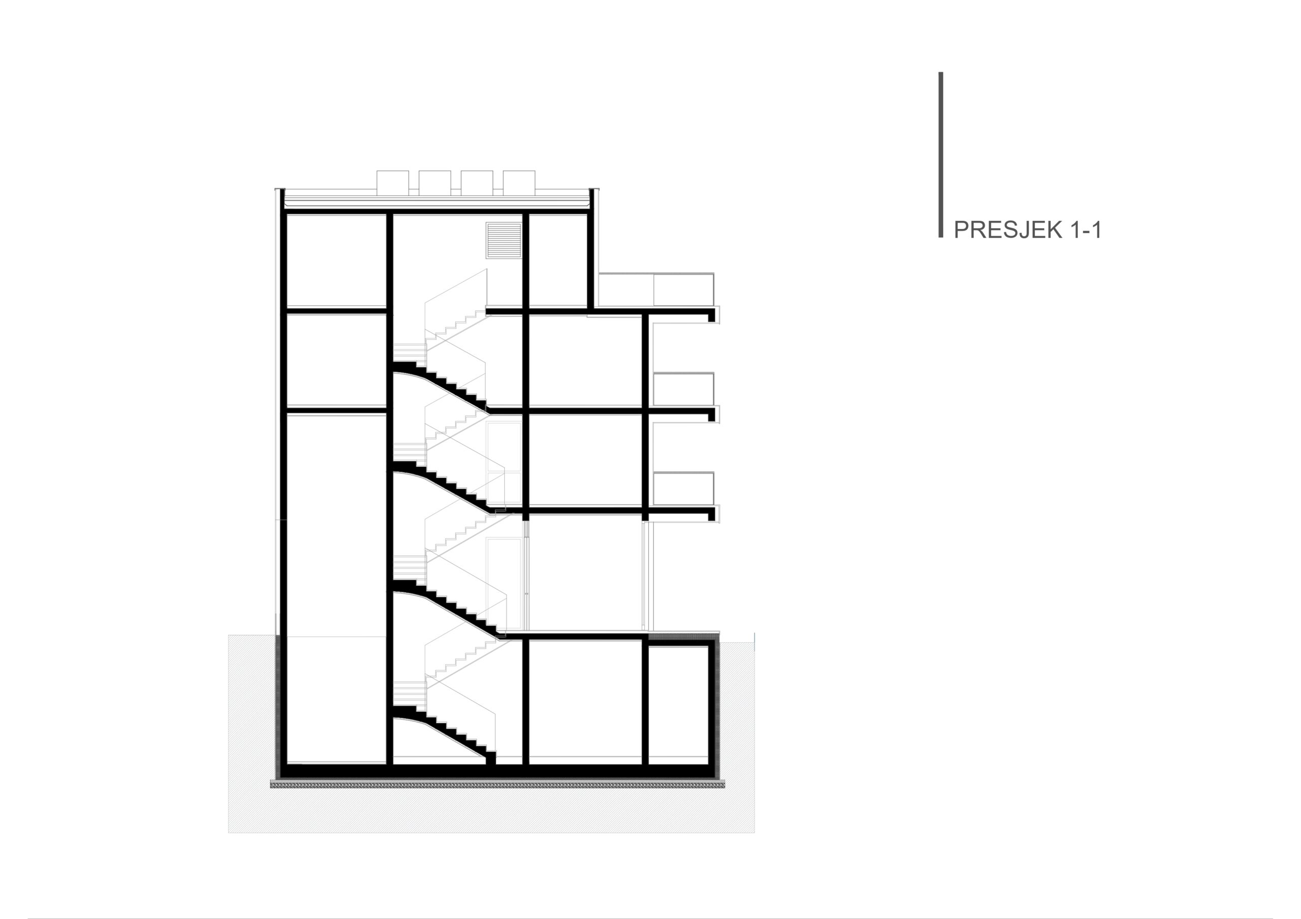 U podrumskoj etaži je, već navedeno okno za auto lift te privatni prostor koji se koristi iz stanova. Prizemlje je planirano za poslovni prostor, kao i galerija gdje je kancelarija i sanitarni čvorovi, te pripadajuća komunikacija. Na prvom i drugom spratu je stan koji je projektovan tako da na prvom spratu su kuhinja, trpezarija, dnevni boravak sa terasom i dvije sobe sa kupatilom i gardarobom, dok su na drugom spratu roditeljske sobe sa zajedničkim kupatilom i gardarobom. Na povučenoj etaži je mali stan površine 46.73m2 sa terasom krovnom.