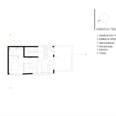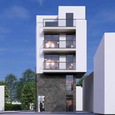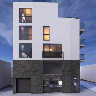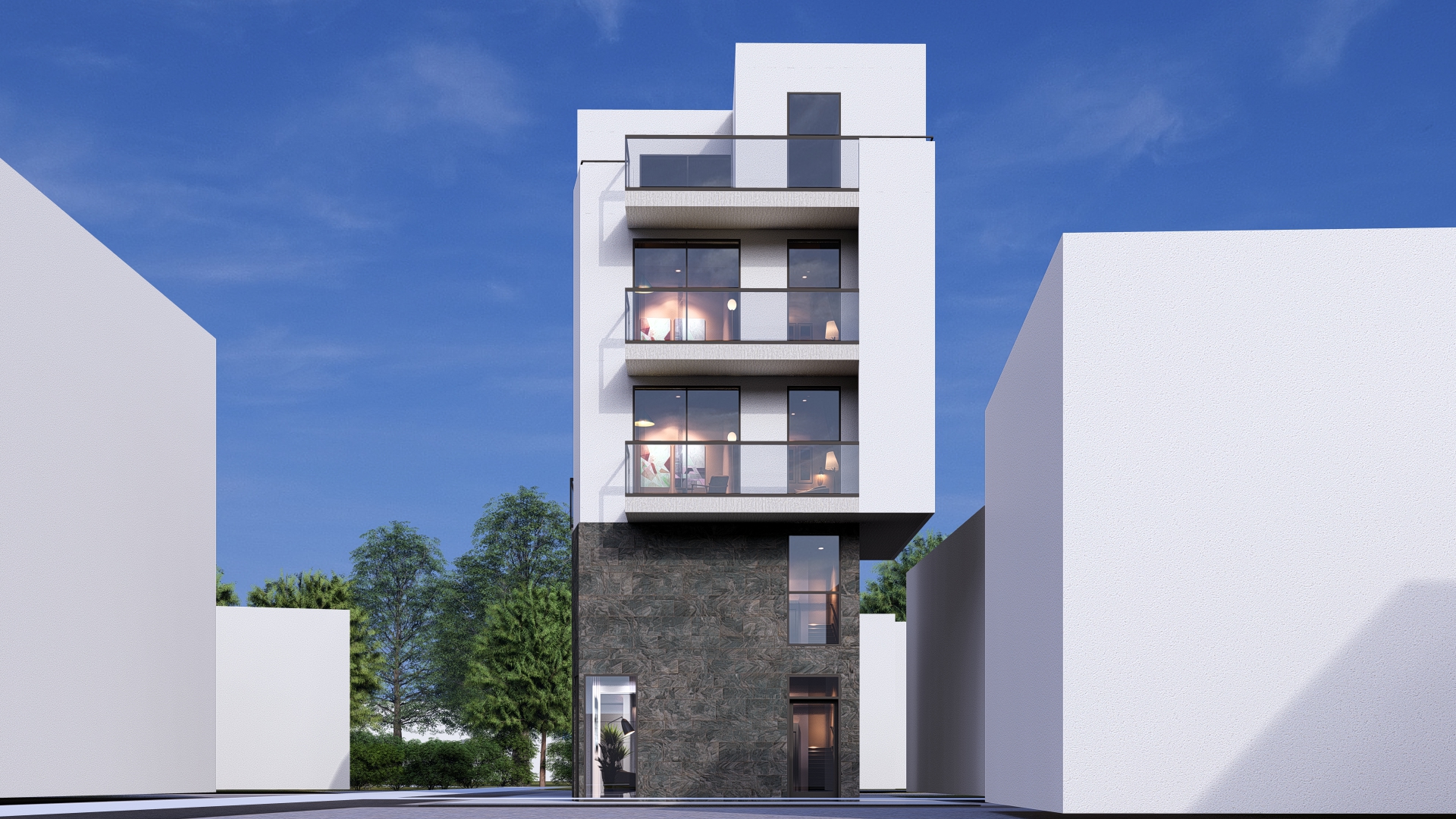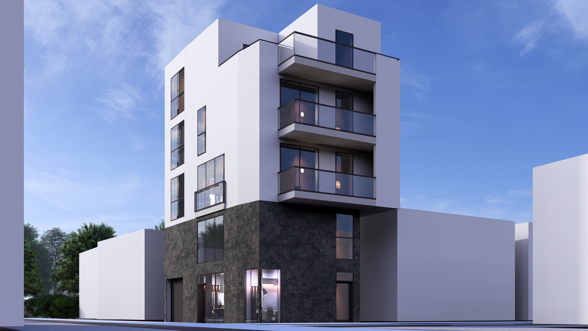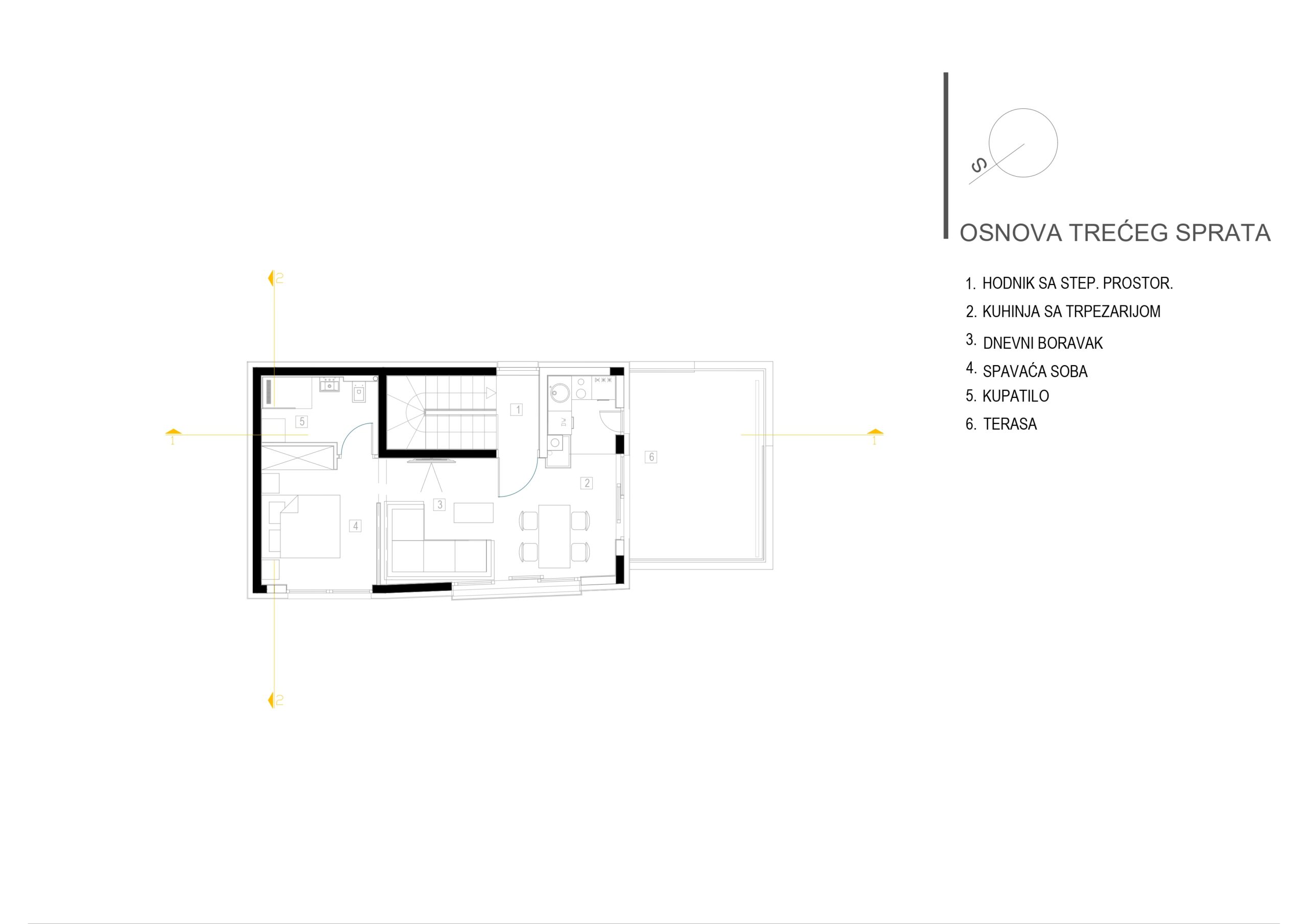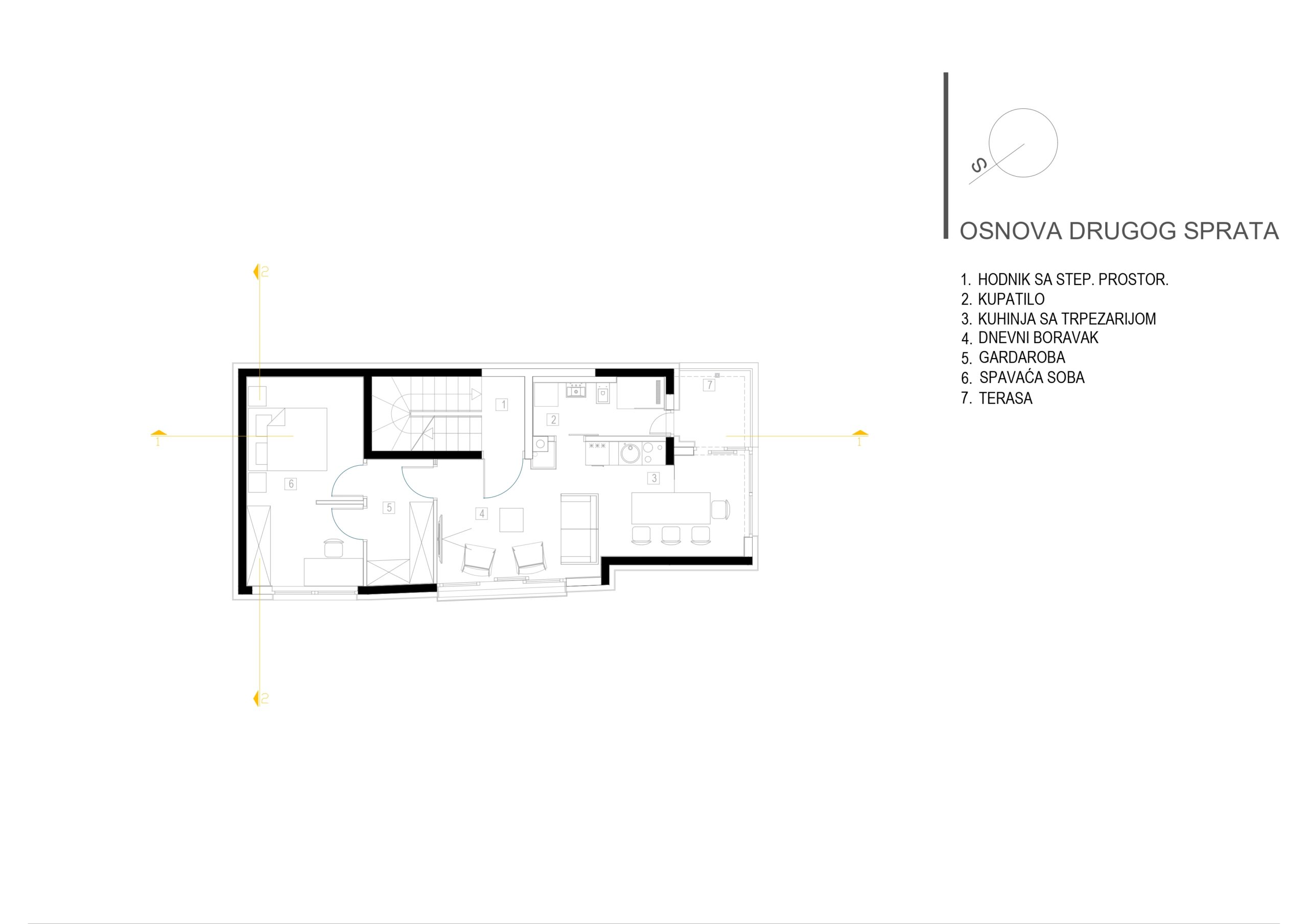 U podrumskoj etaži je, već navedeno okno za auto lift te privatni prostor koji se koristi iz stanova. Prizemlje je planirano za poslovni prostor, kao i galerija gdje je kancelarija i sanitarni čvorovi, te pripadajuća komunikacija. Na prvom i drugom spratu je stan koji je projektovan tako da na prvom spratu su kuhinja, trpezarija, dnevni boravak sa terasom i dvije sobe sa kupatilom i gardarobom, dok su na drugom spratu roditeljske sobe sa zajedničkim kupatilom i gardarobom. Na povučenoj etaži je mali stan površine 46.73m2 sa terasom krovnom.