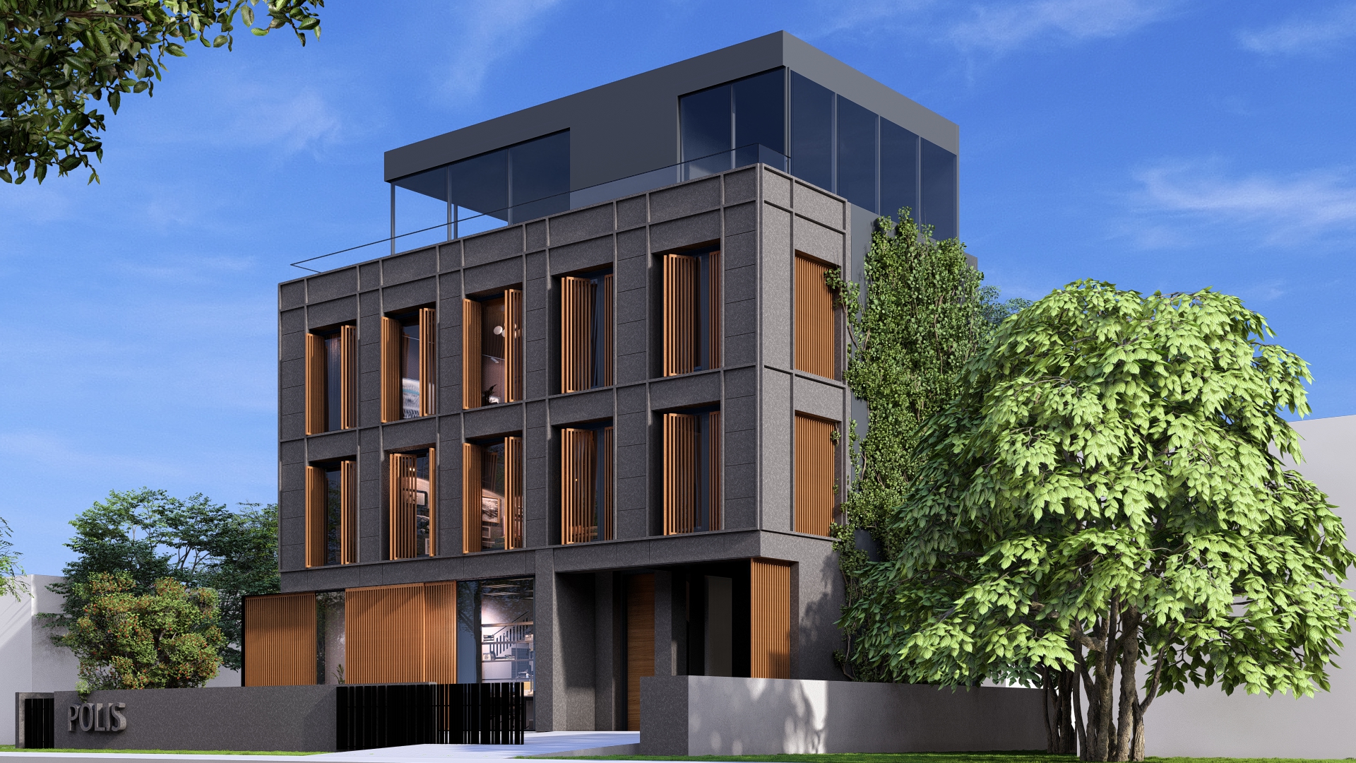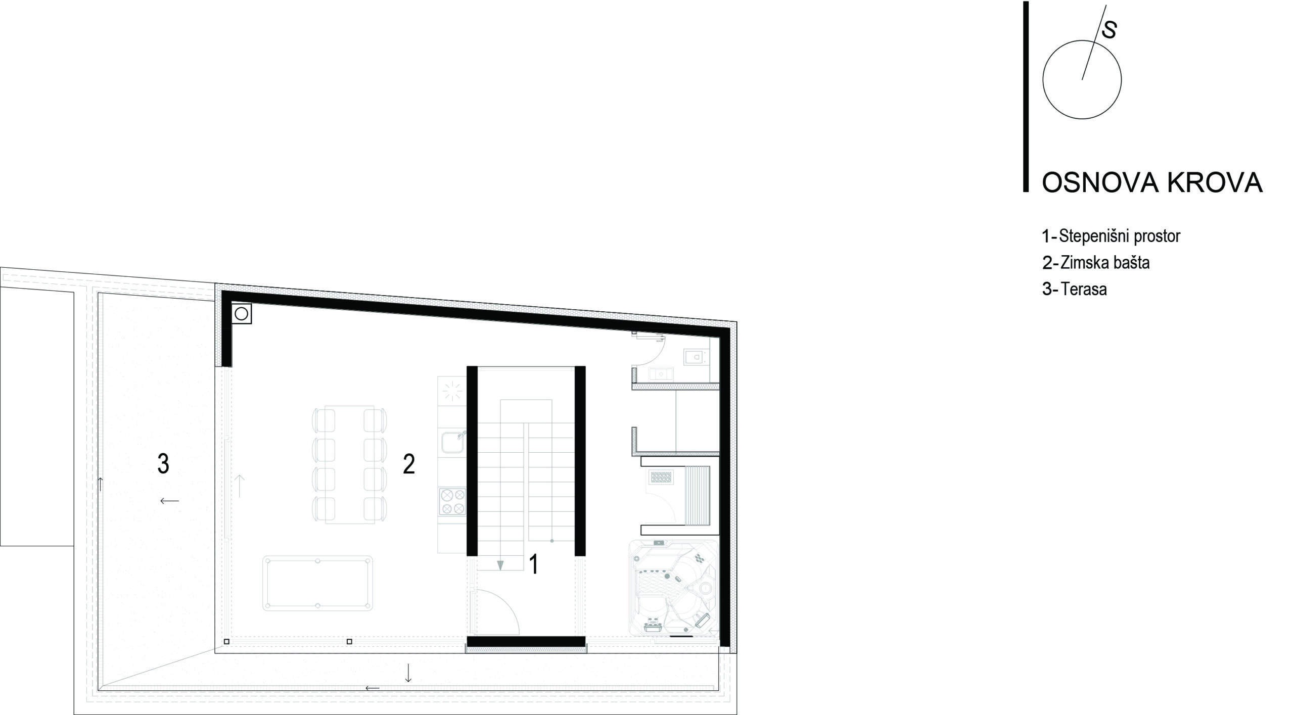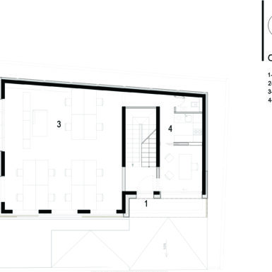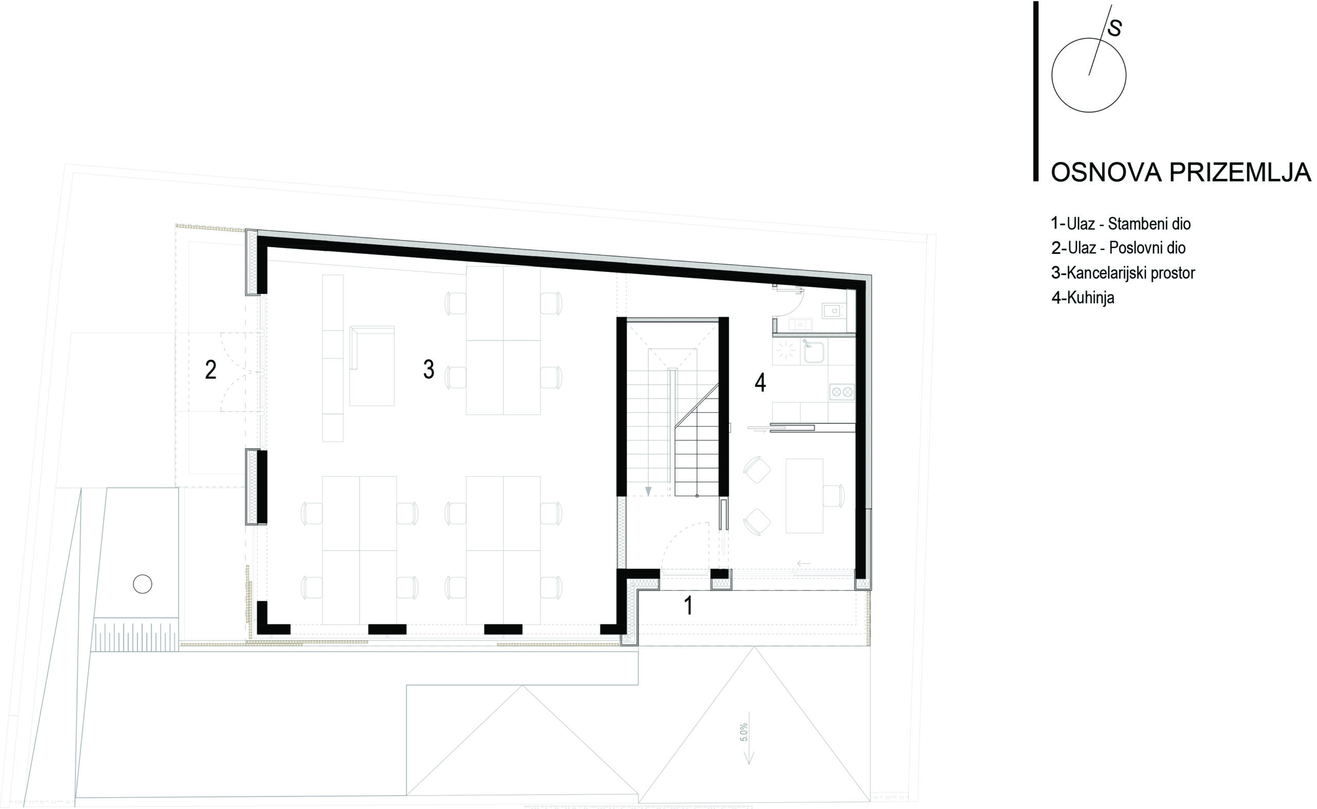 Ulaz u poslovni dio objekta je sa jugozapadne strane objekta i ulazi se u jedinstven prostor, jednu veliku kancelariju koja u pozadini ima sanitarni čvor. Ulaz je natkriven balkonom stambene etaže iznad.Ulaz u stambeni dio je sa jugoistočne strane i ulazi se na stepenište koje vodi do stanova na prvom i drugom spratu, kao i do podruma. Omogućena je i veza sa parkingom natkrivenim direktno sa stepenica, a povlačenjem tog dijela prizemlja unutar građevinske linije dobio se ugodno natkriven prostor ulaza prema stepeništu i dalje stanovima.
