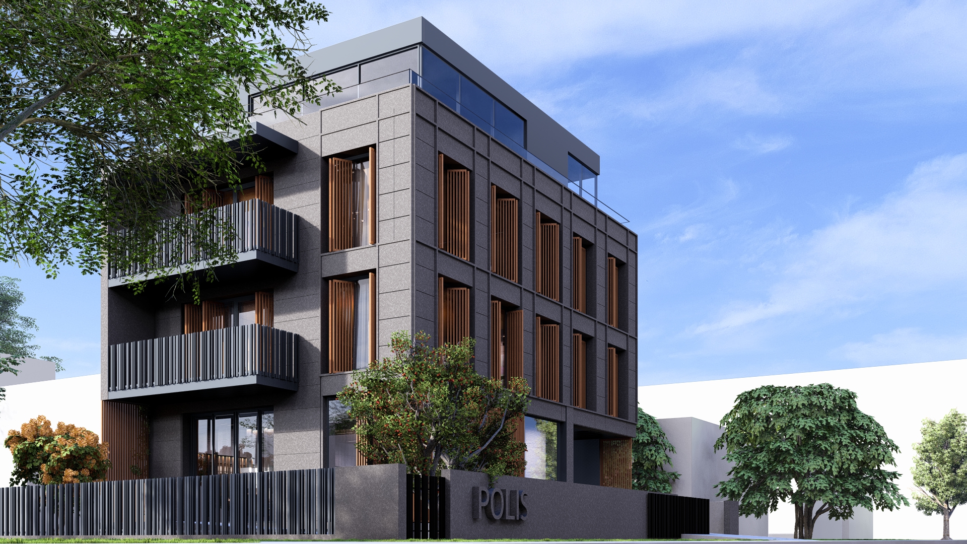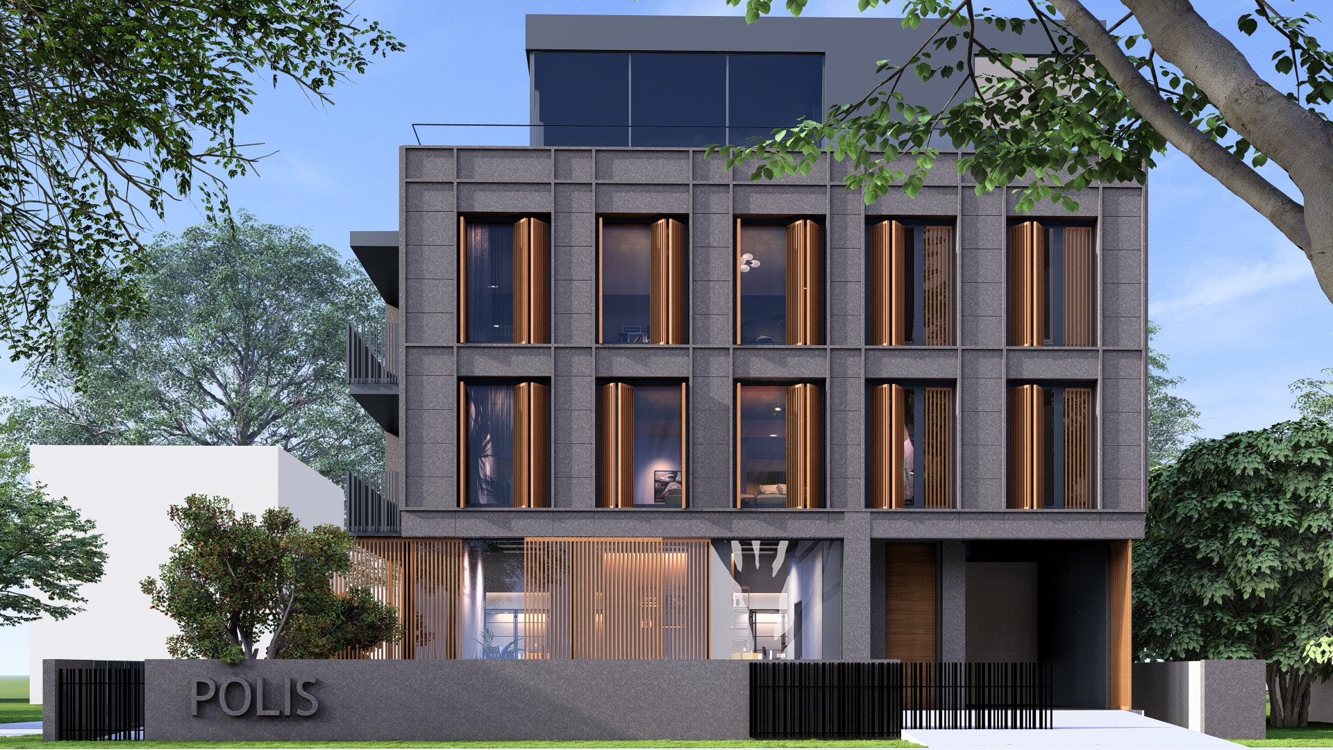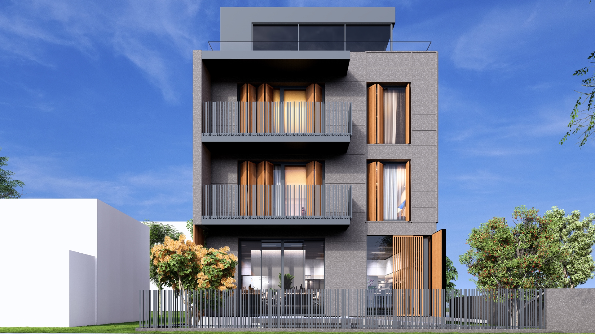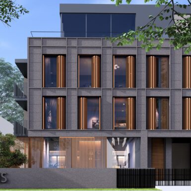 Ulaz u poslovni dio objekta je sa jugozapadne strane objekta i ulazi se u jedinstven prostor, jednu veliku kancelariju koja u pozadini ima sanitarni čvor. Ulaz je natkriven balkonom stambene etaže iznad.Ulaz u stambeni dio je sa jugoistočne strane i ulazi se na stepenište koje vodi do stanova na prvom i drugom spratu, kao i do podruma. Omogućena je i veza sa parkingom natkrivenim direktno sa stepenica, a povlačenjem tog dijela prizemlja unutar građevinske linije dobio se ugodno natkriven prostor ulaza prema stepeništu i dalje stanovima.
