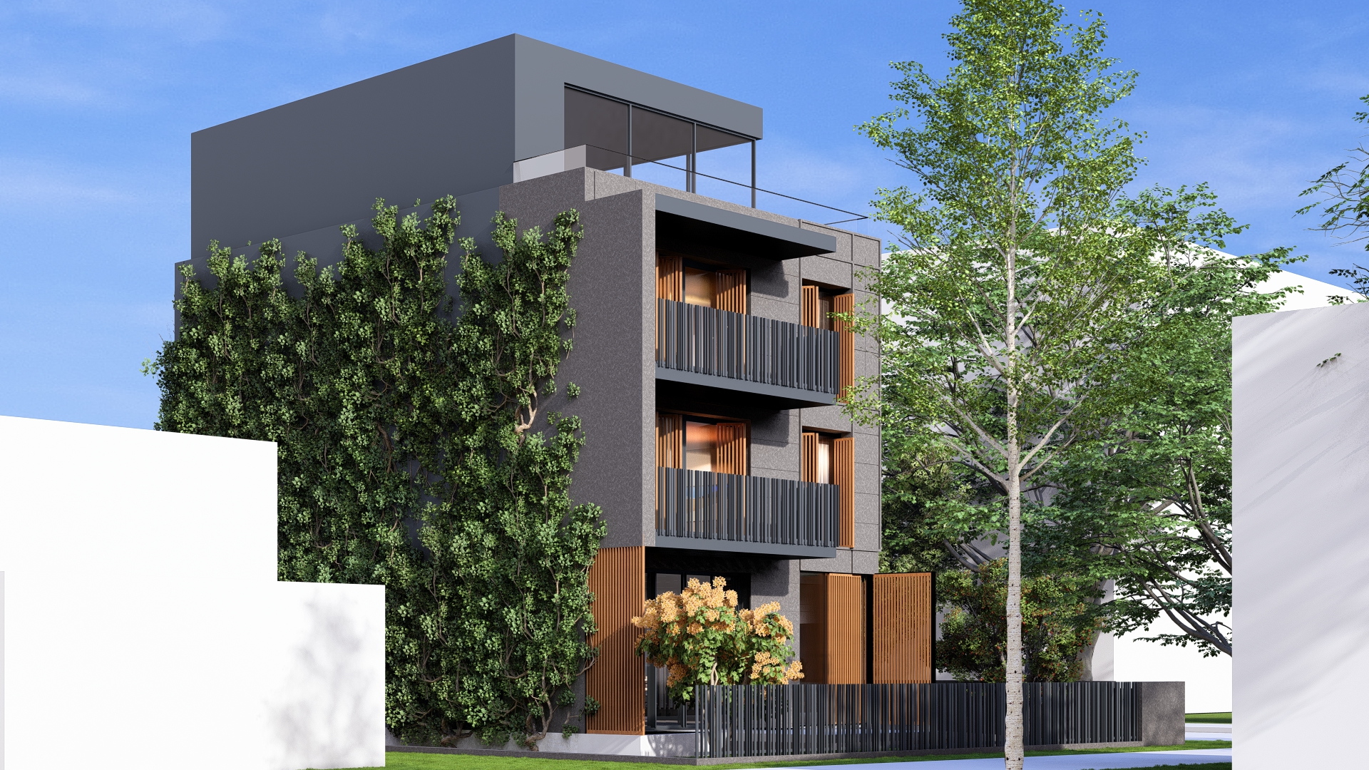 Poslovni dio u prizemlj ima samo vanjske zidove koji su AB platna i koja će ostati u obradi završnog betona kao i zid stepeništa koji dijelom zatvara taj prostor. Jedan ,,instalacioni“zid je od gips vlaknastih ploča i završno bojen a sanitarni čvor u sklopu poslovnog prostora, umjesto gipsa je lako cementna ploča obostrano armirana alkalno otpornom staklenom mrežicom preko koje je hidroizolacija i keramika na ljepilu.