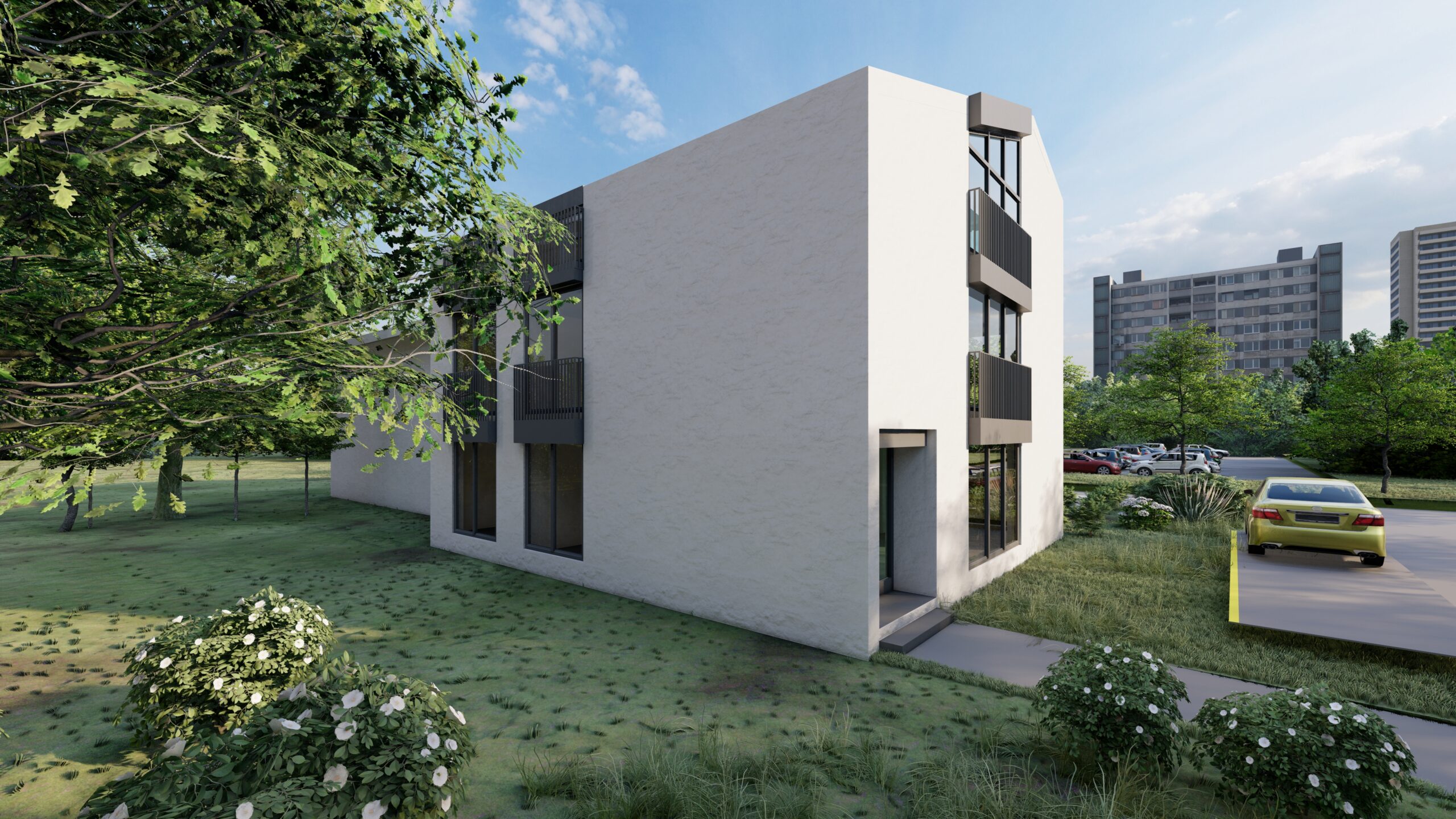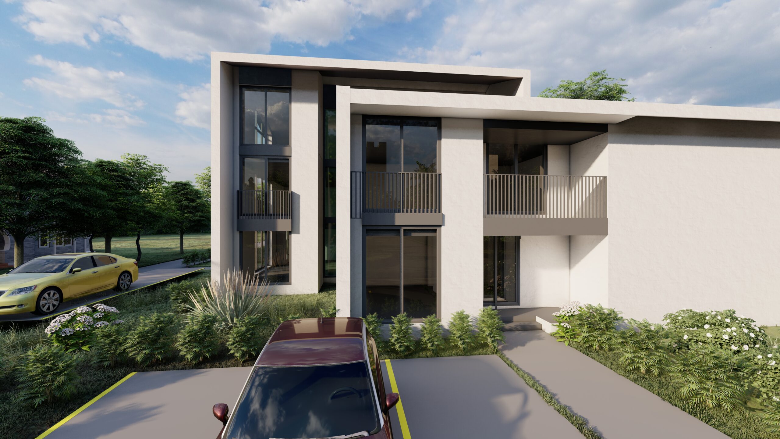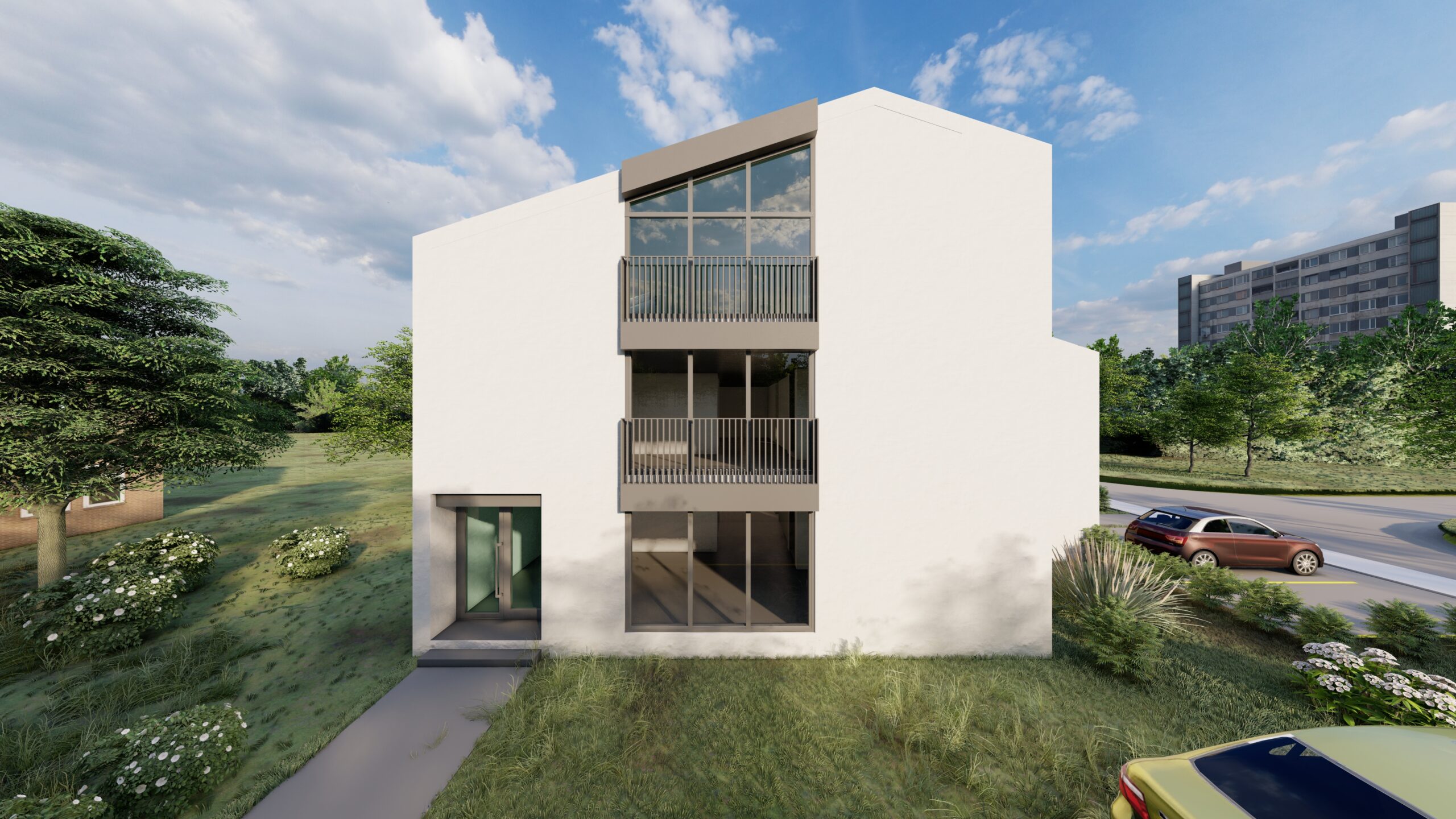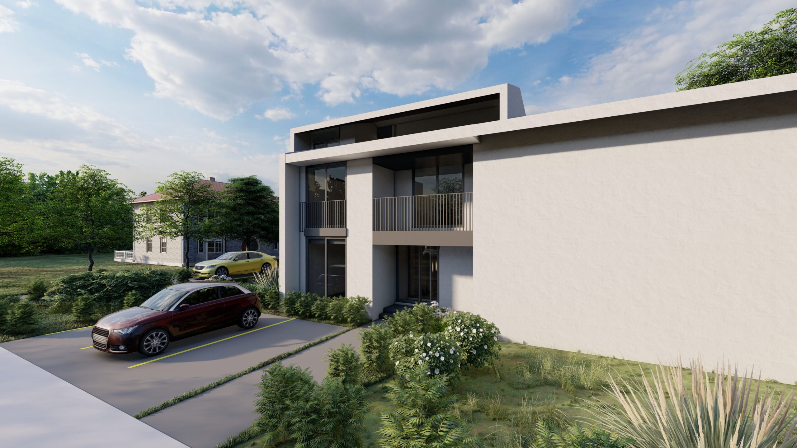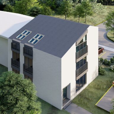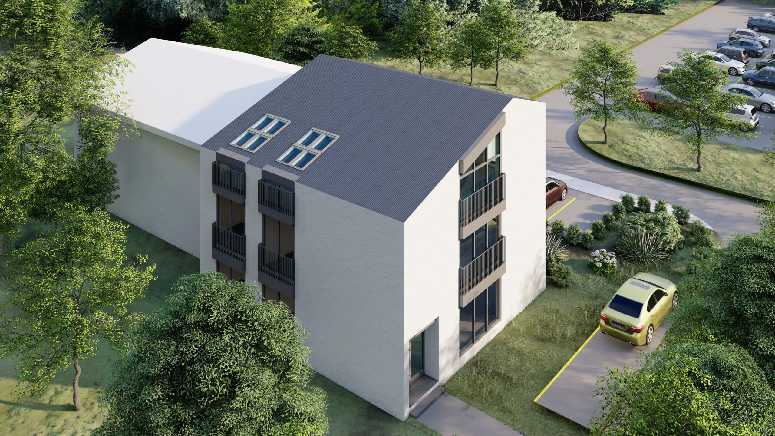 Objekat je natkriven kosim, dvovodnim krovom, sa završnom oblogom od aluminijumske PREFA krovne i fasadne šindre, čime se postiže savremen izgled i dugotrajnost materijala. Pristup objektu ostvaren je direktno sa ulice Rade Vranješević, a u okviru parcele obezbijeđen je parking prostor za ukupno pet vozila, namijenjen kako poslovnom, tako i stambenom dijelu objekta.