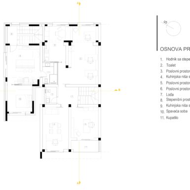 Na prvom spratu nalazi se upravni dio sa kancelarijama rukovodstva i zaposlenih, uz dodatni prostor za odmor. Na istoj etaži započinje stambena zona, kojoj se pristupa zasebnim stepeništem, čime je obezbijeđena jasna podjela između poslovnog i privatnog dijela objekta. Stambeni prostor je u potpunosti smješten u mansardi, gdje se nalazi funkcionalan stan sa dnevnim boravkom, kuhinjom i trpezarijom, izlazom na terasu, te dvije spavaće sobe sa pripadajućim kupatilom.